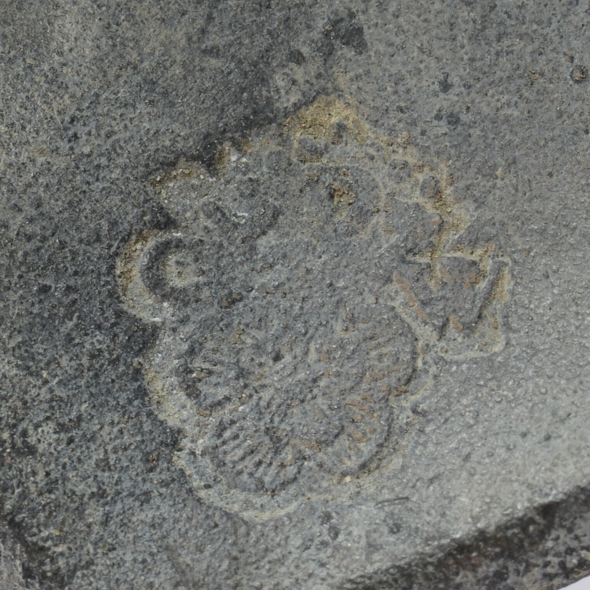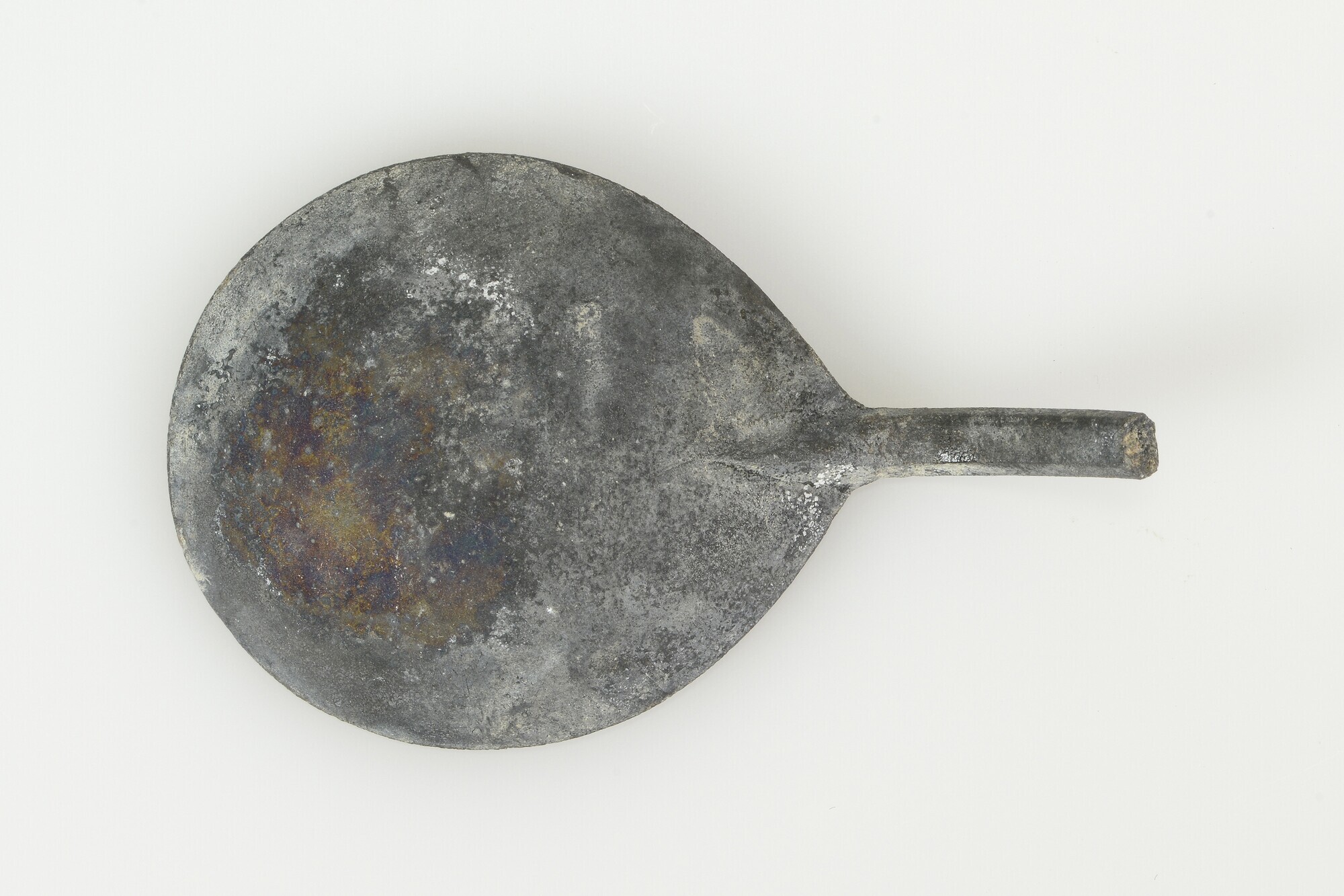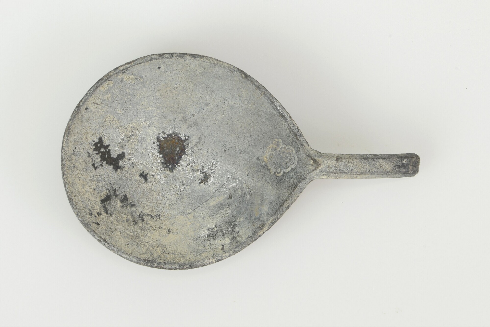 Lepel; druppelvormige bak; platte zeskantige steel; merkteken in de bak: gekroonde Tudorroos met initialen "C(?).W"