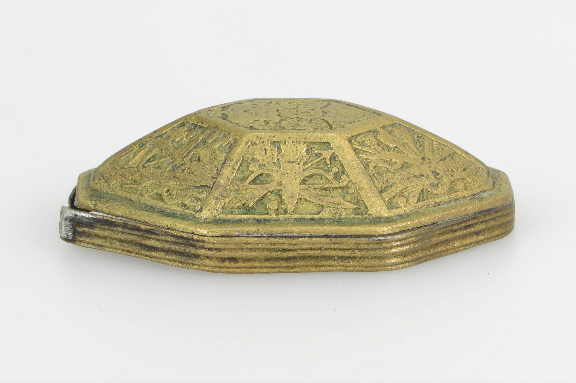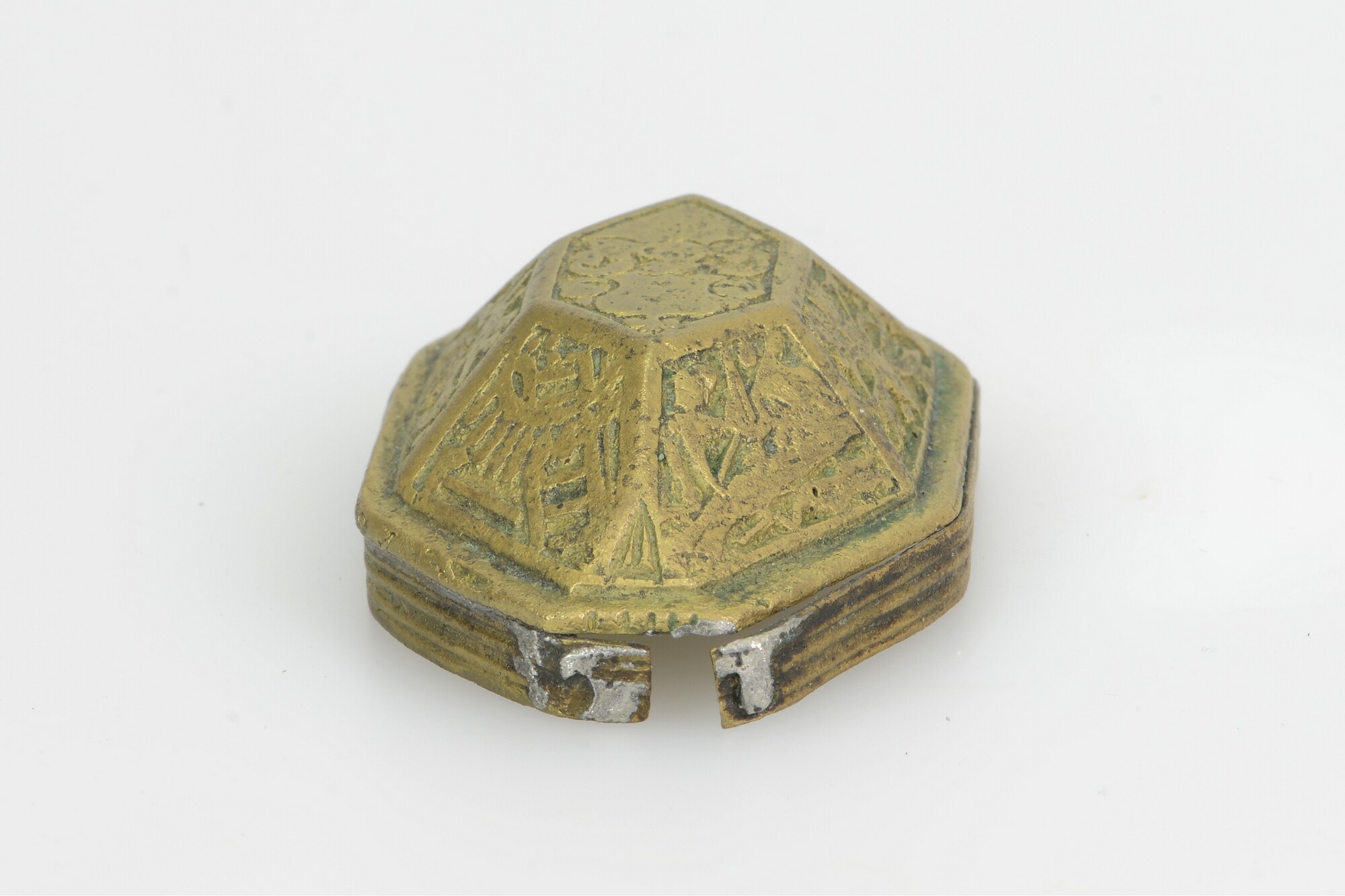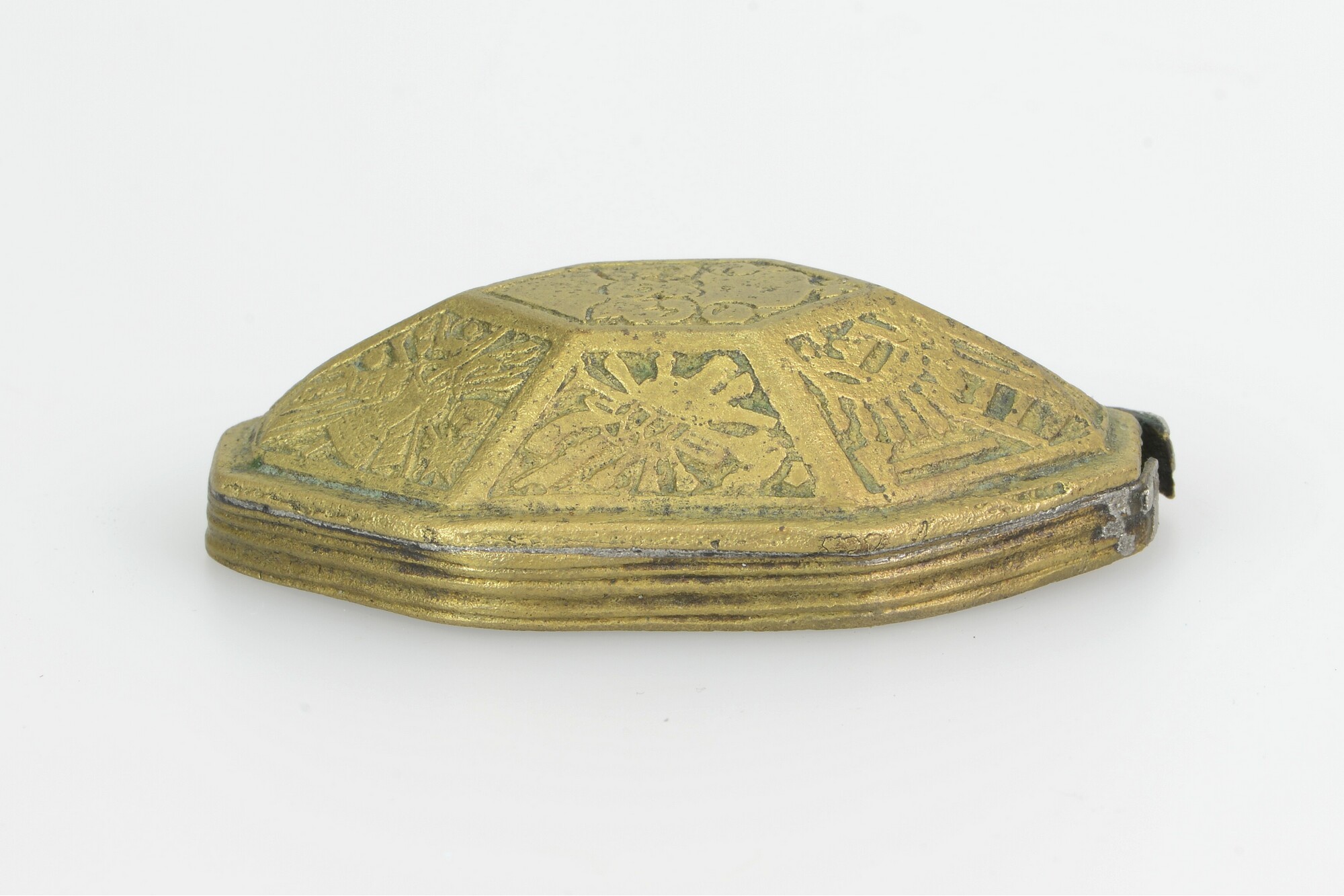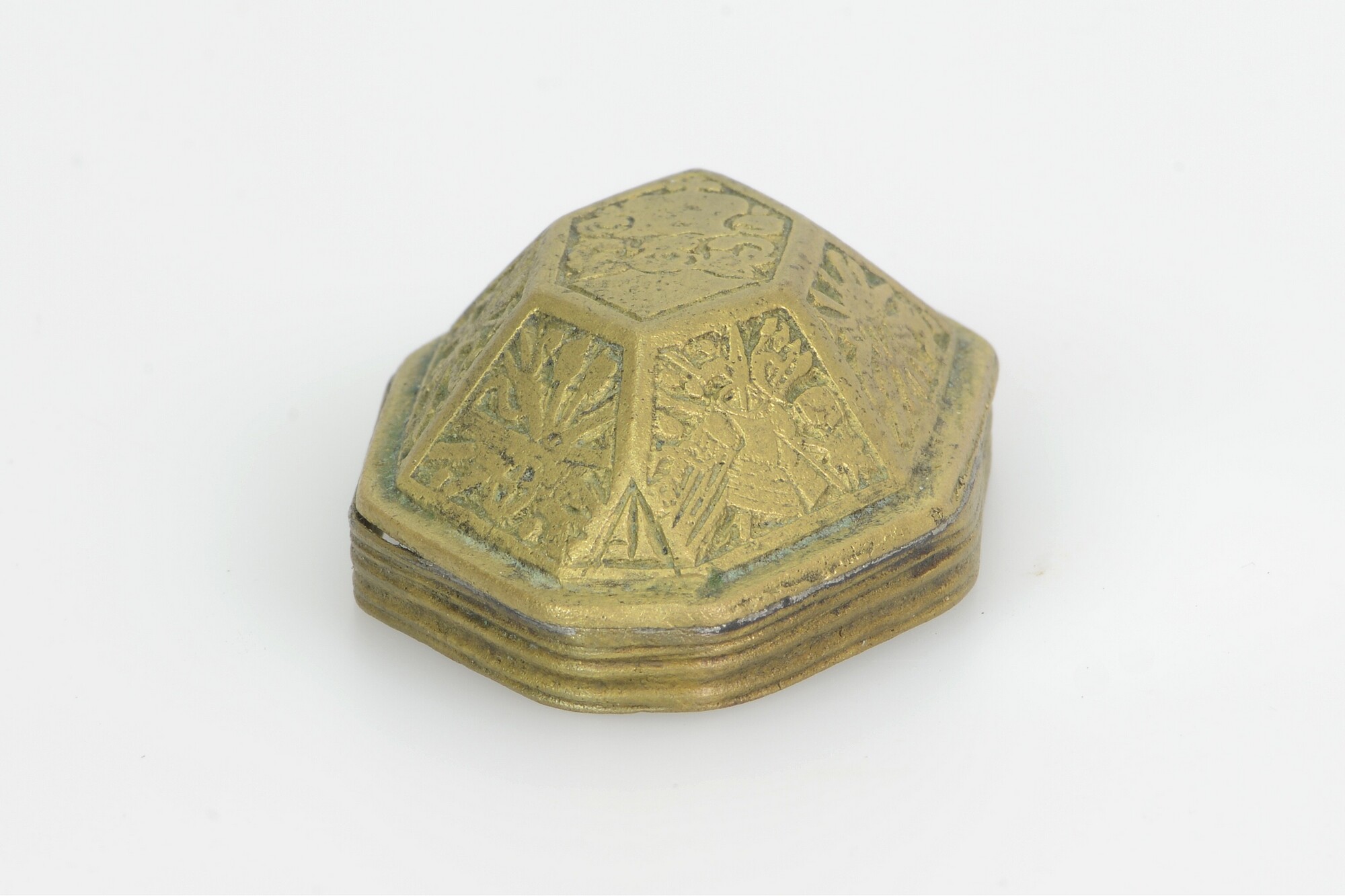 Deksel van tabaksdoos; achthoekig; rechte rand met horizontale groeven; verdiepte reliëfversiering in zeven vakken: het vak bovenop toont een wapenschild met helmteken; de andere vakken tonen wapens, waaronder een kanon, speren, een bijl, pijl en boog, een wapenrusting, etc., oorspronkelijk ingelegd met email door middel van champlevé-techniek