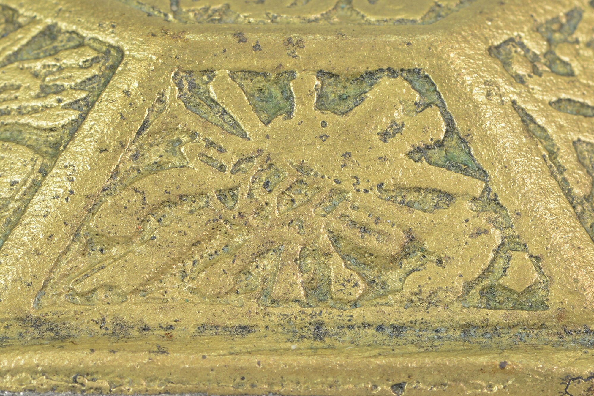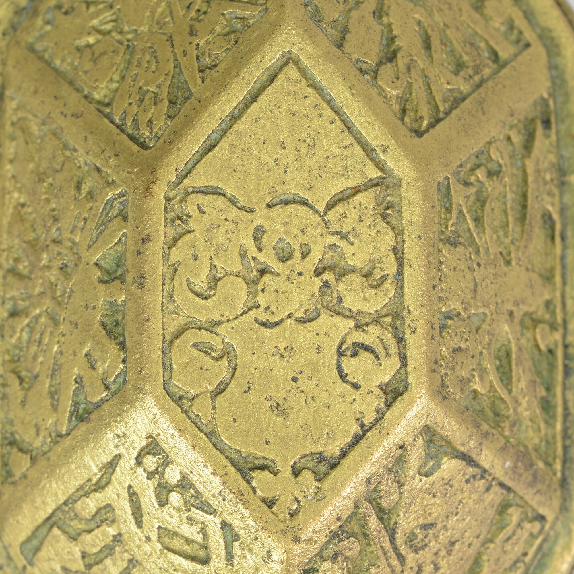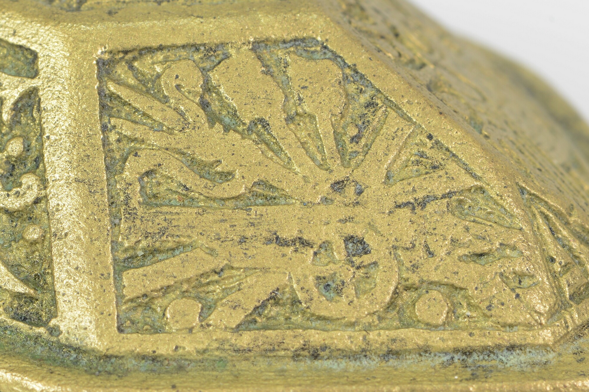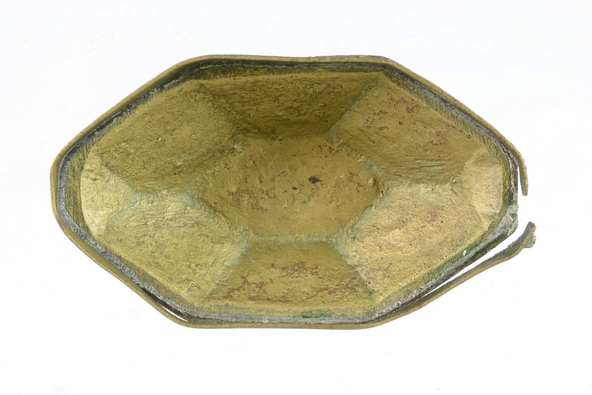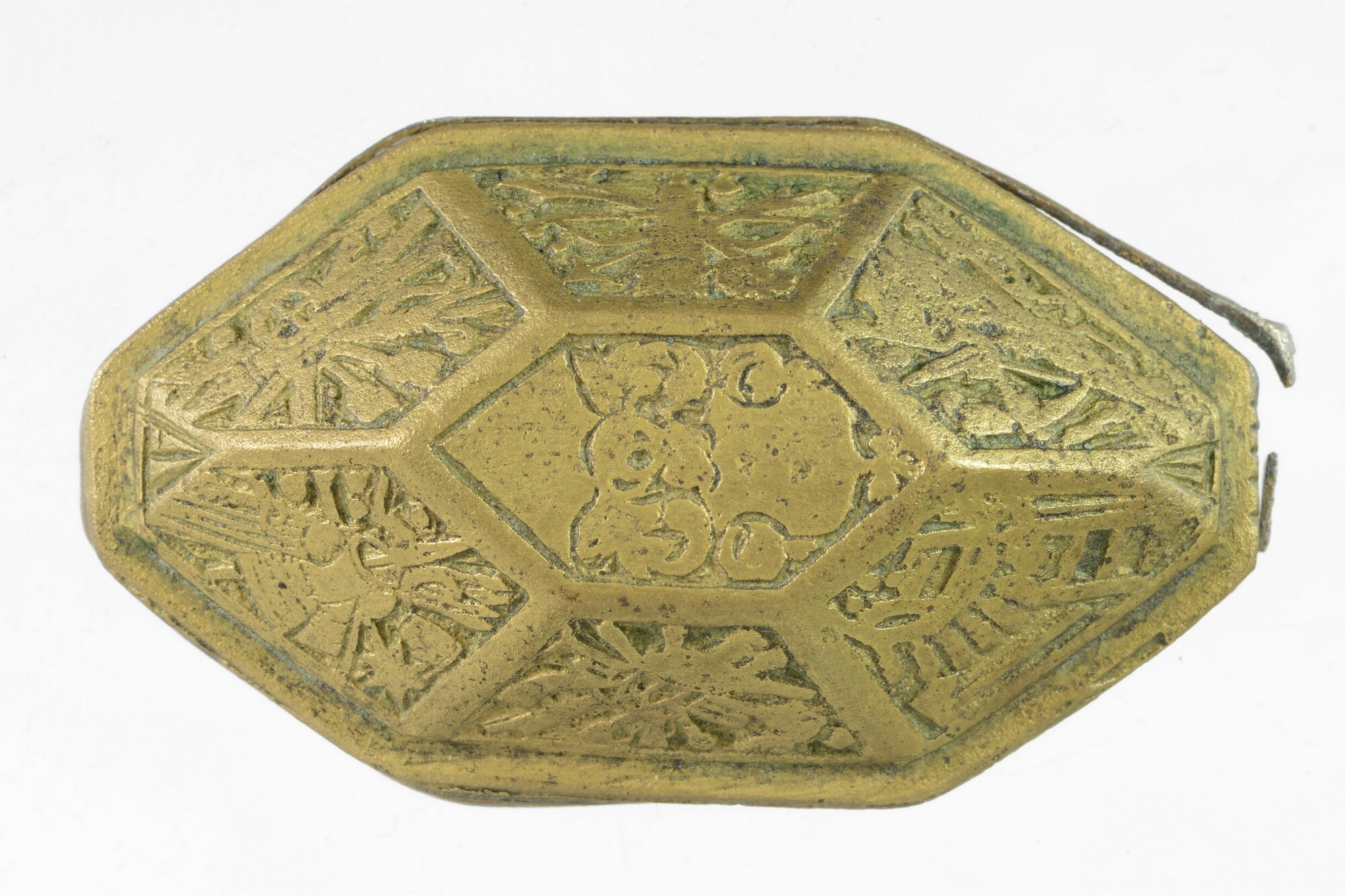 Deksel van tabaksdoos; achthoekig; rechte rand met horizontale groeven; verdiepte reliëfversiering in zeven vakken: het vak bovenop toont een wapenschild met helmteken; de andere vakken tonen wapens, waaronder een kanon, speren, een bijl, pijl en boog, een wapenrusting, etc., oorspronkelijk ingelegd met email door middel van champlevé-techniek