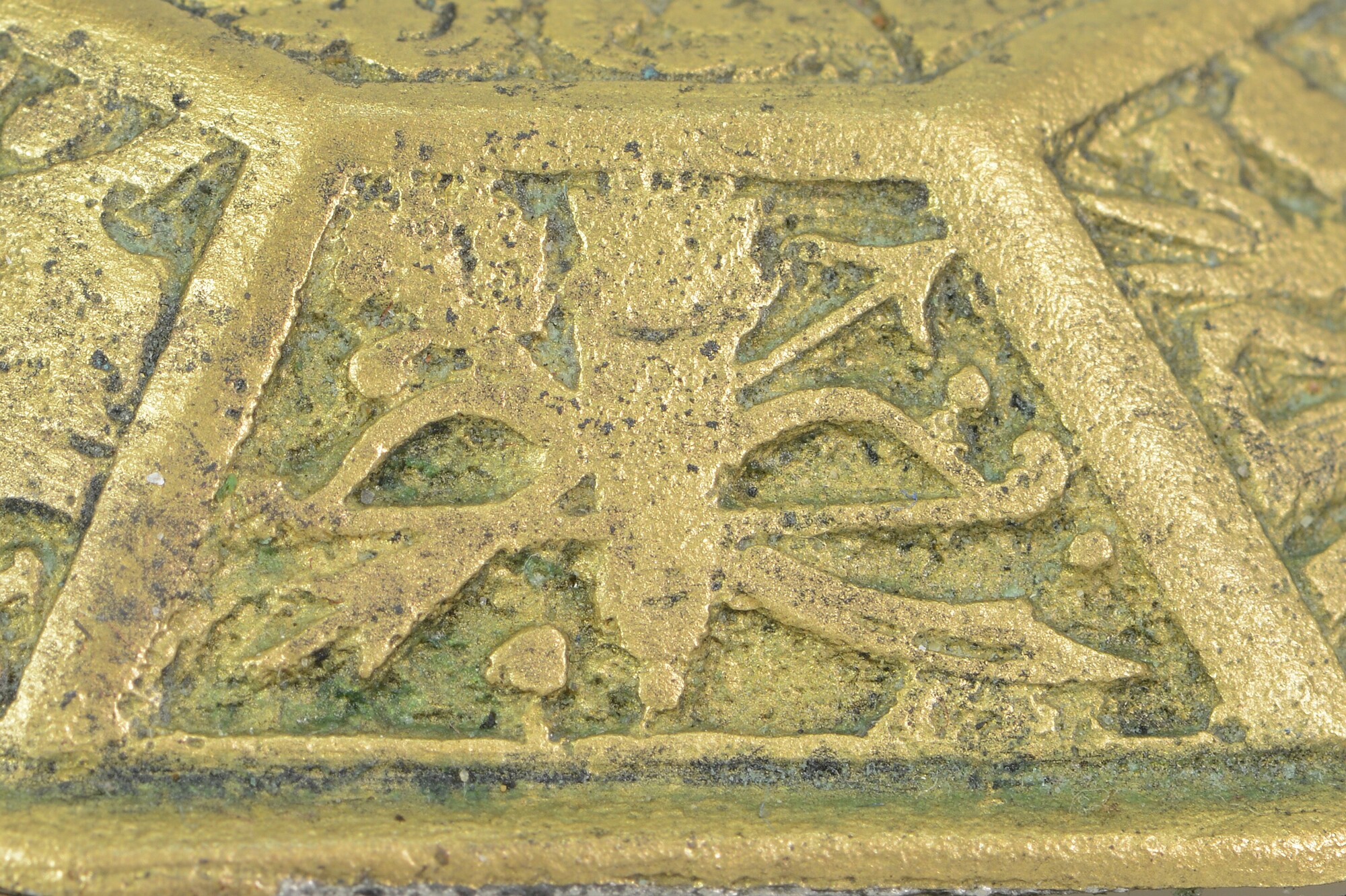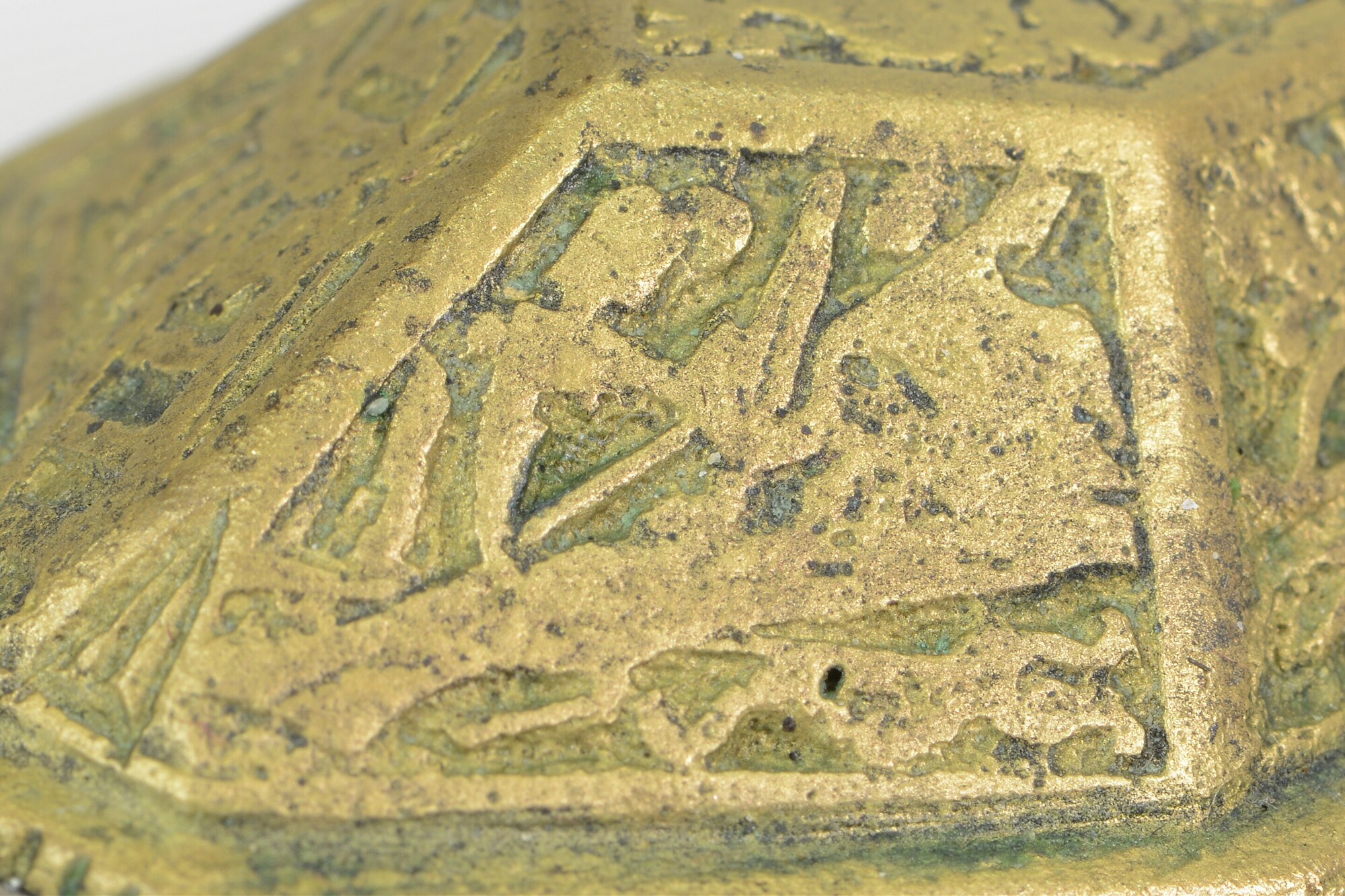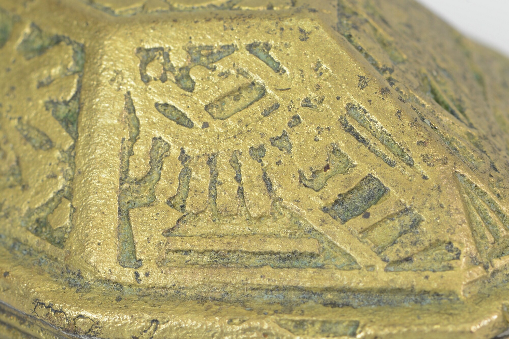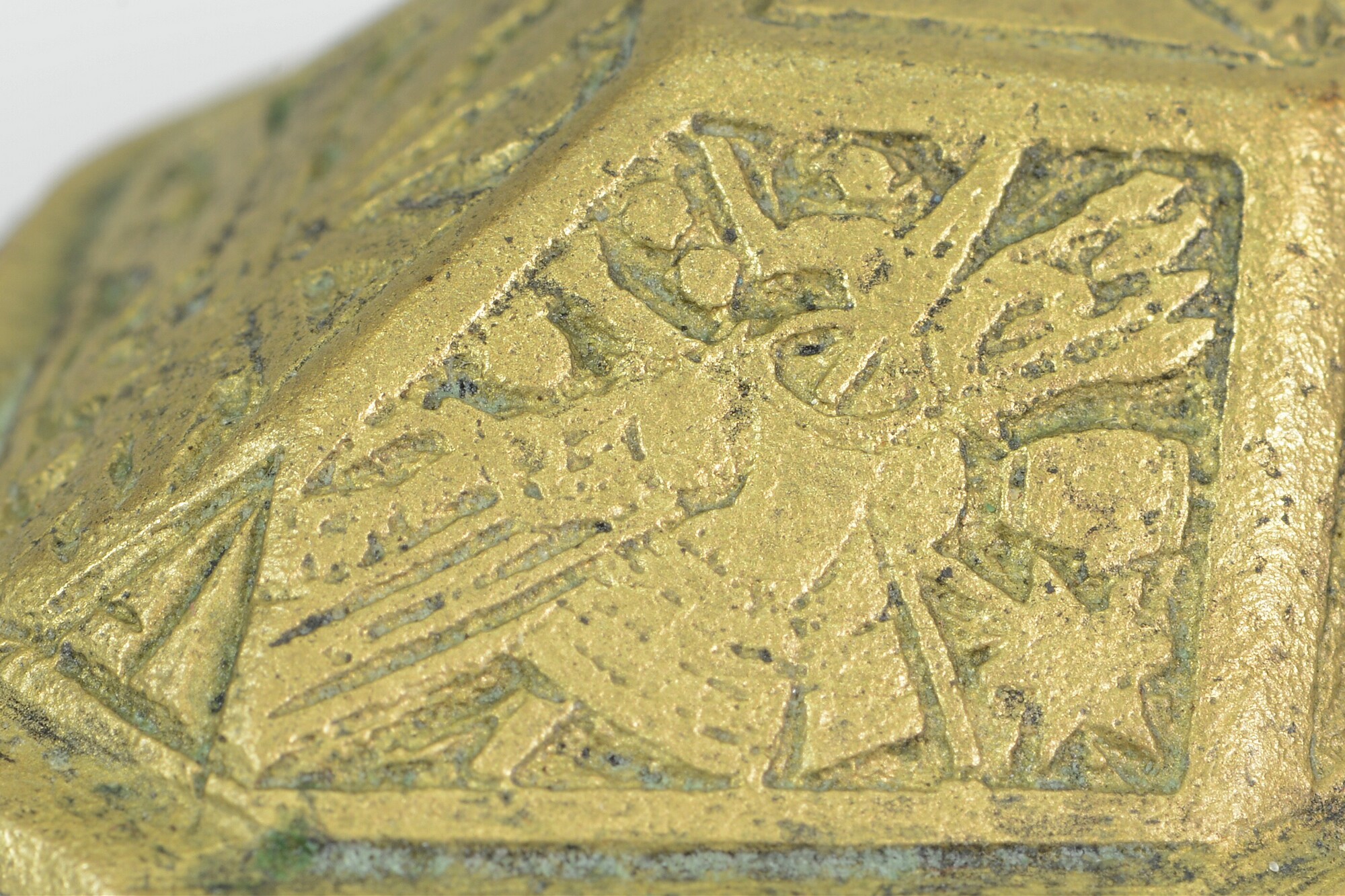 Deksel van tabaksdoos; achthoekig; rechte rand met horizontale groeven; verdiepte reliëfversiering in zeven vakken: het vak bovenop toont een wapenschild met helmteken; de andere vakken tonen wapens, waaronder een kanon, speren, een bijl, pijl en boog, een wapenrusting, etc., oorspronkelijk ingelegd met email door middel van champlevé-techniek
