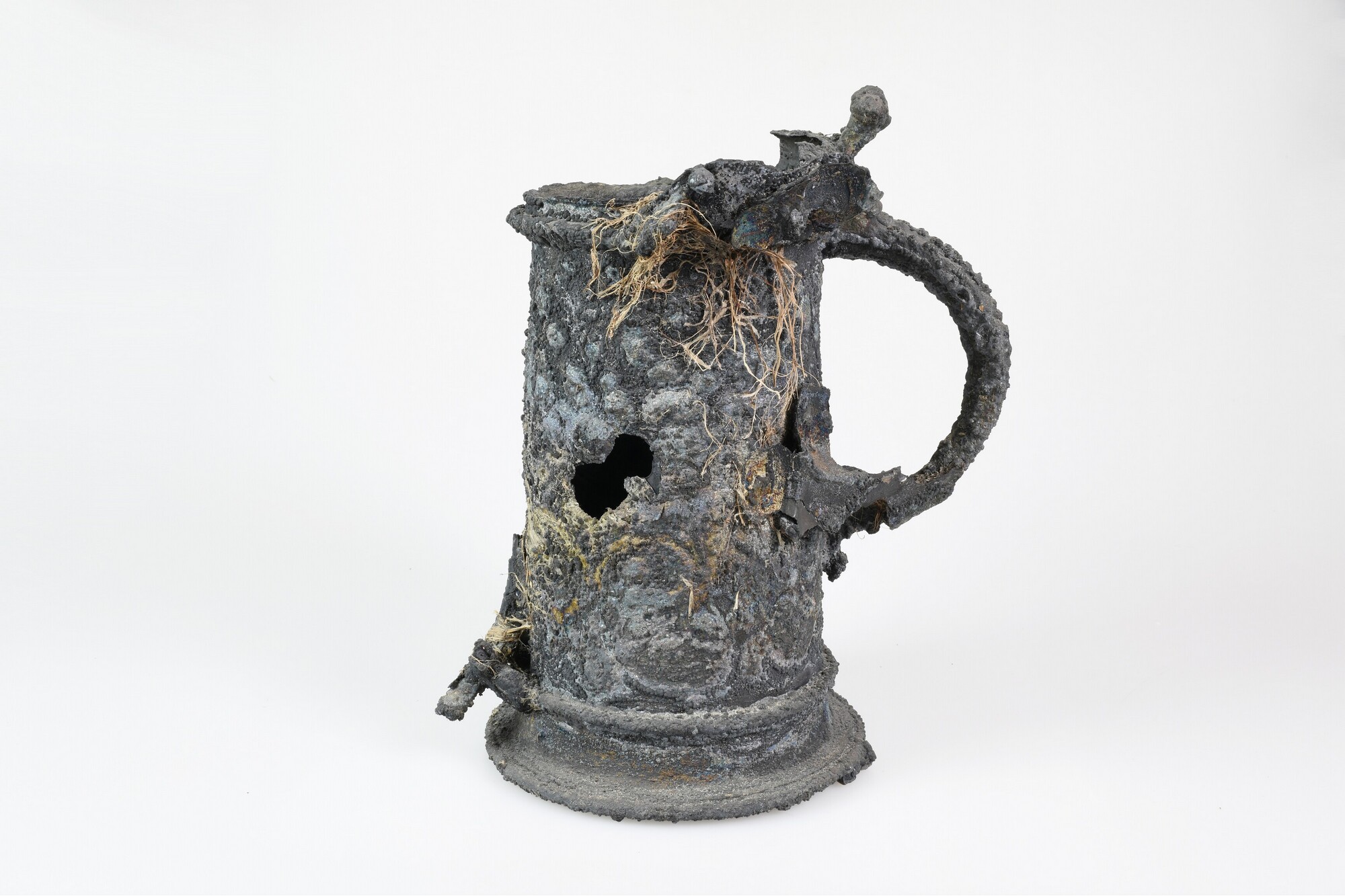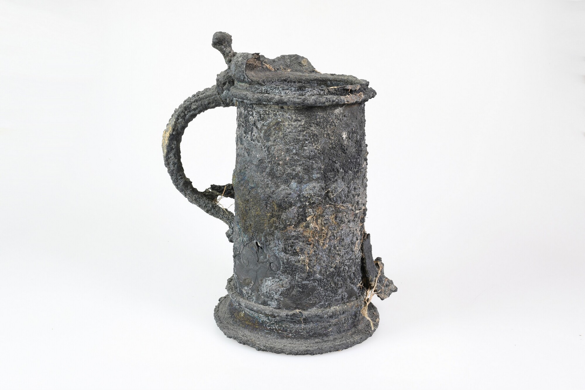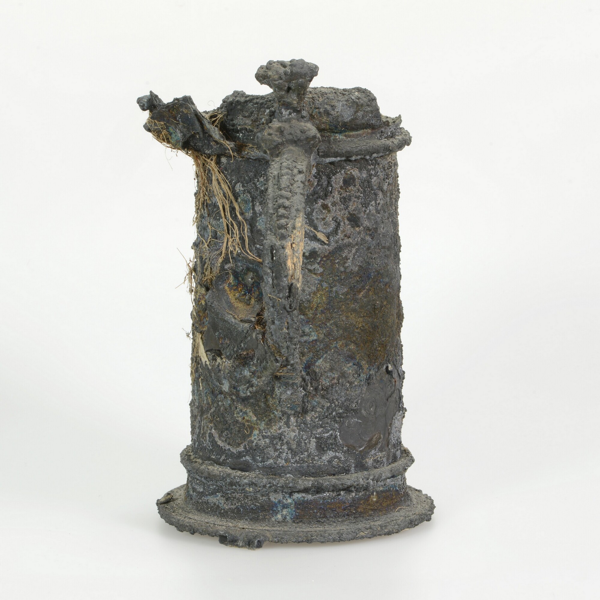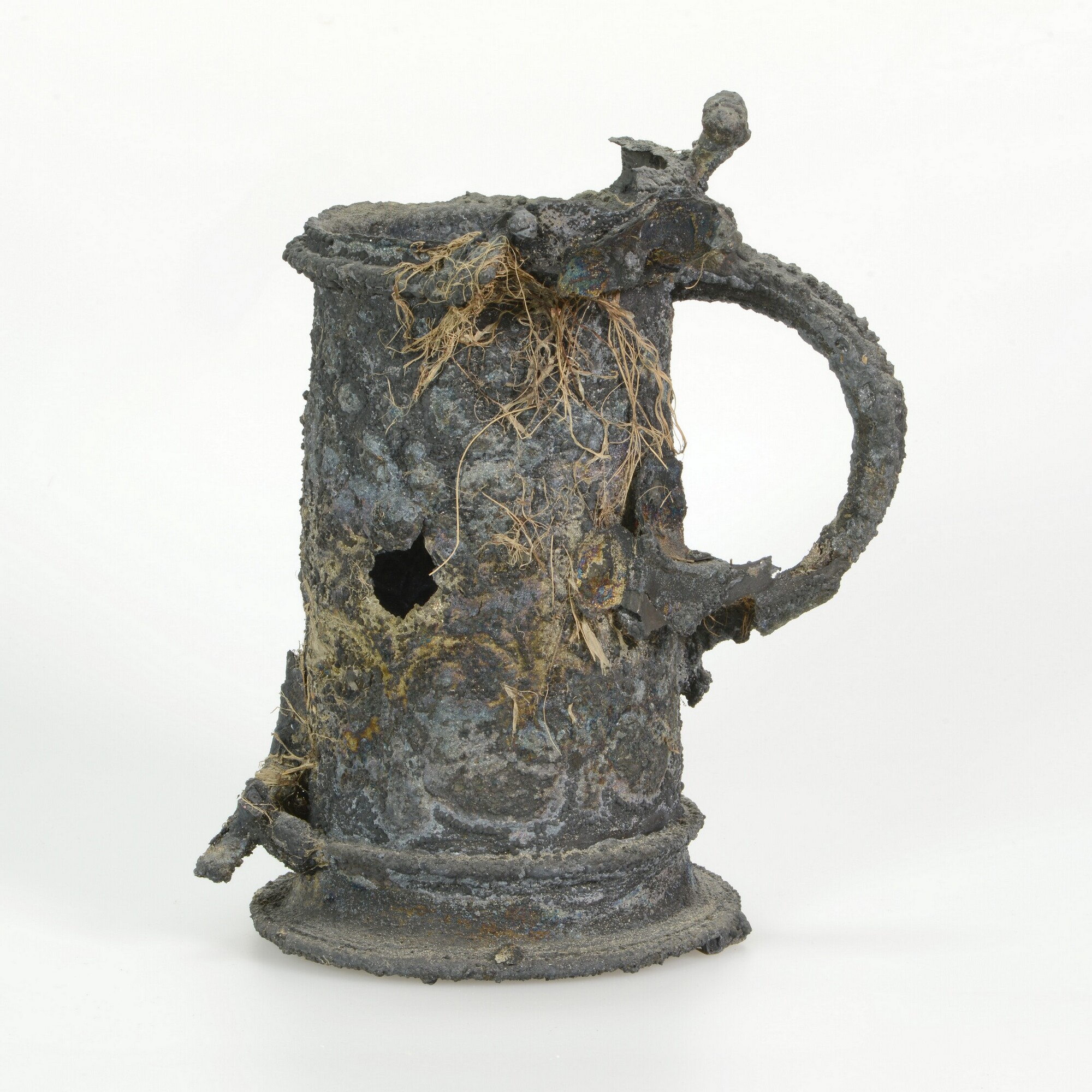 Beker; reliëfversiering; oor; restant van een deksel met duimrust; op drie plaatsen zijn delen van andere zilveren objecten vastgecorrodeerd op het oppervlak; met resten organisch verpakkingsmateriaal en onderop enkele houtresten