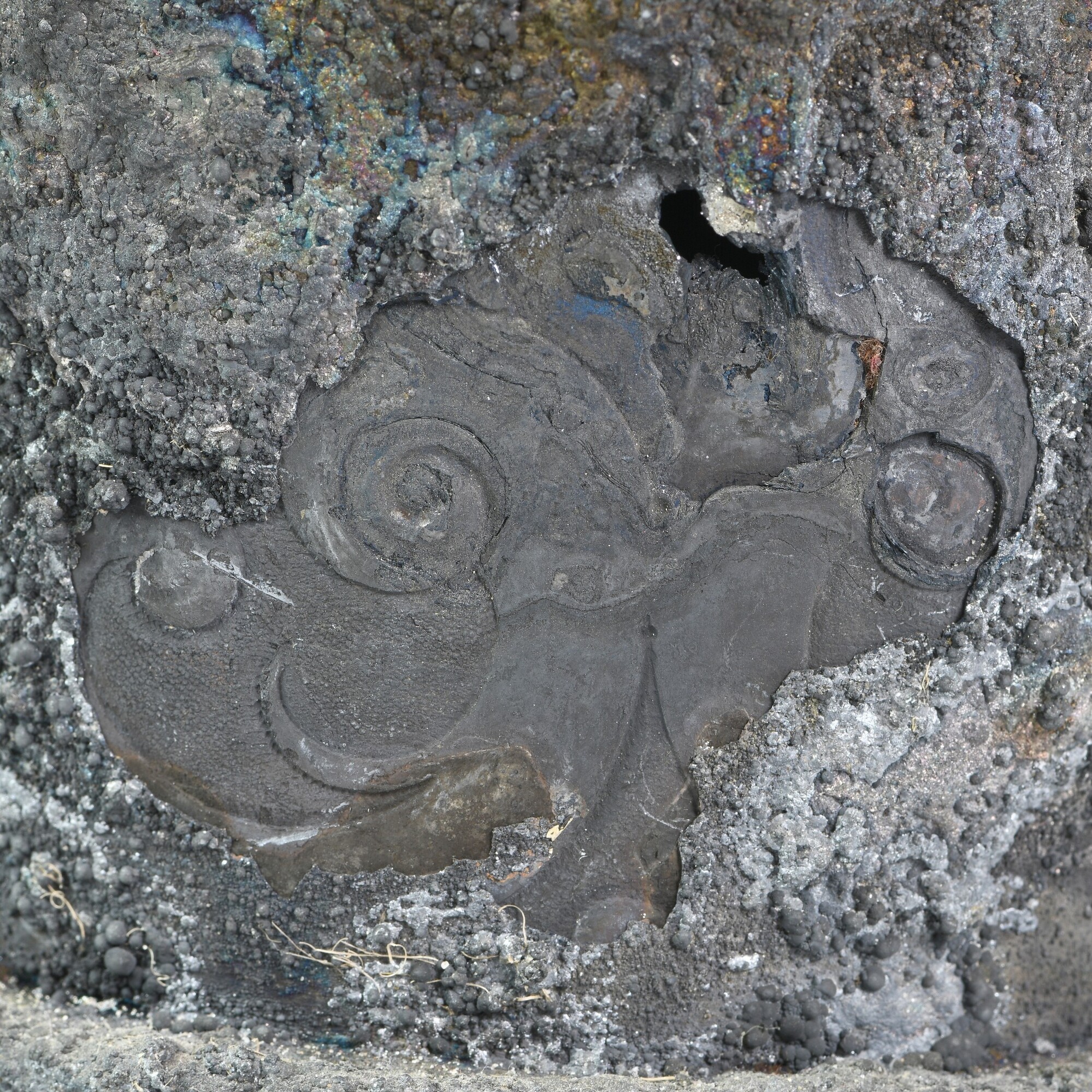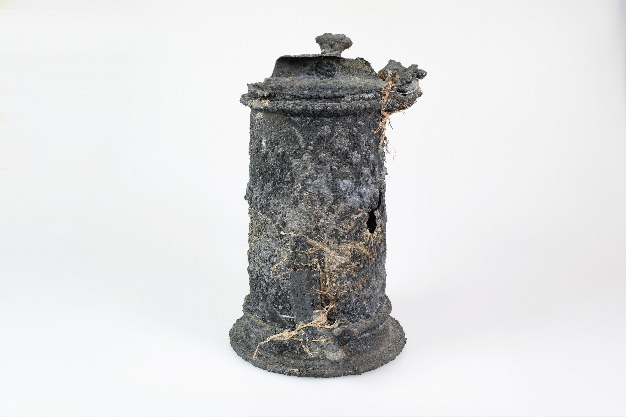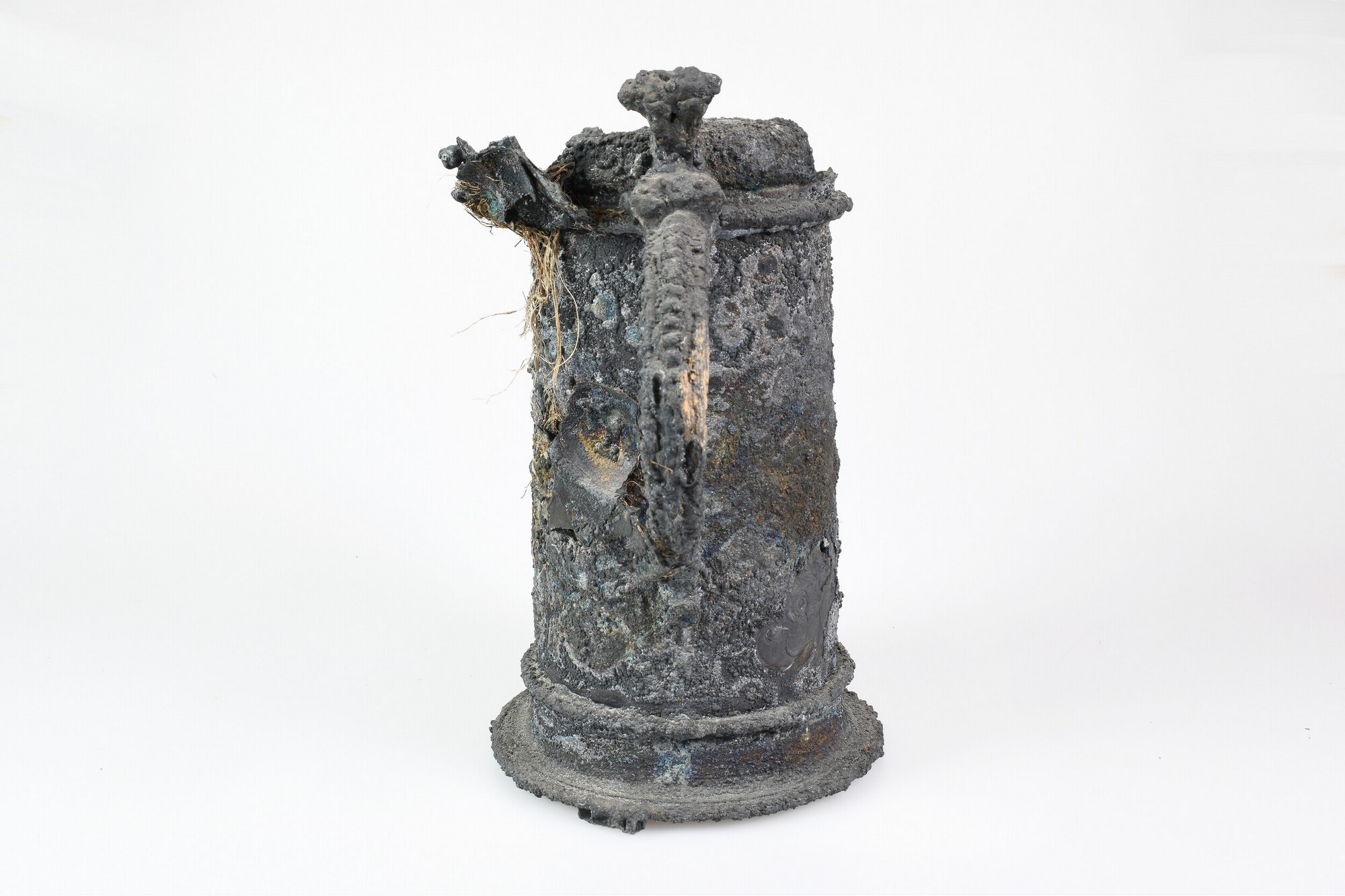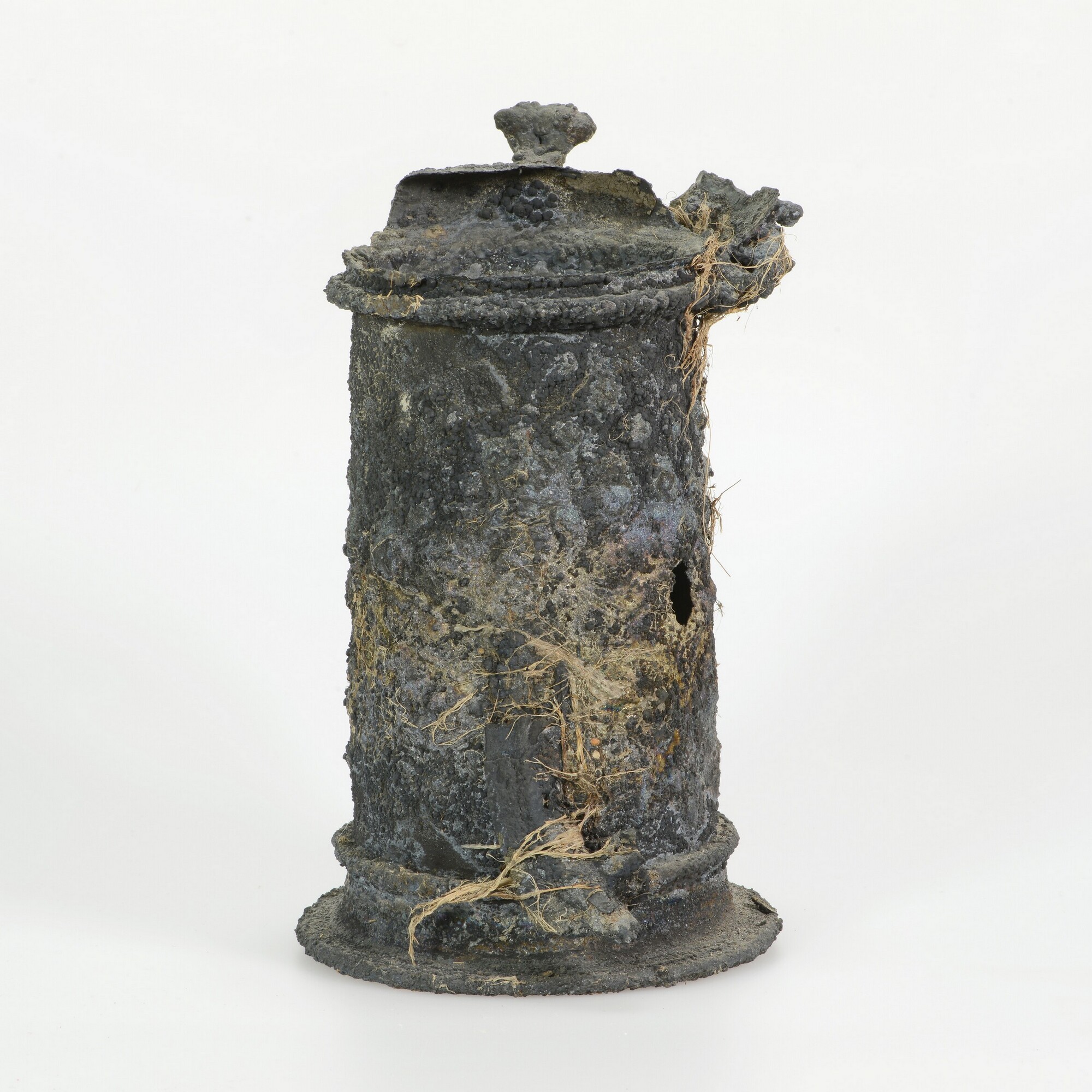 Beker; reliëfversiering; oor; restant van een deksel met duimrust; op drie plaatsen zijn delen van andere zilveren objecten vastgecorrodeerd op het oppervlak; met resten organisch verpakkingsmateriaal en onderop enkele houtresten