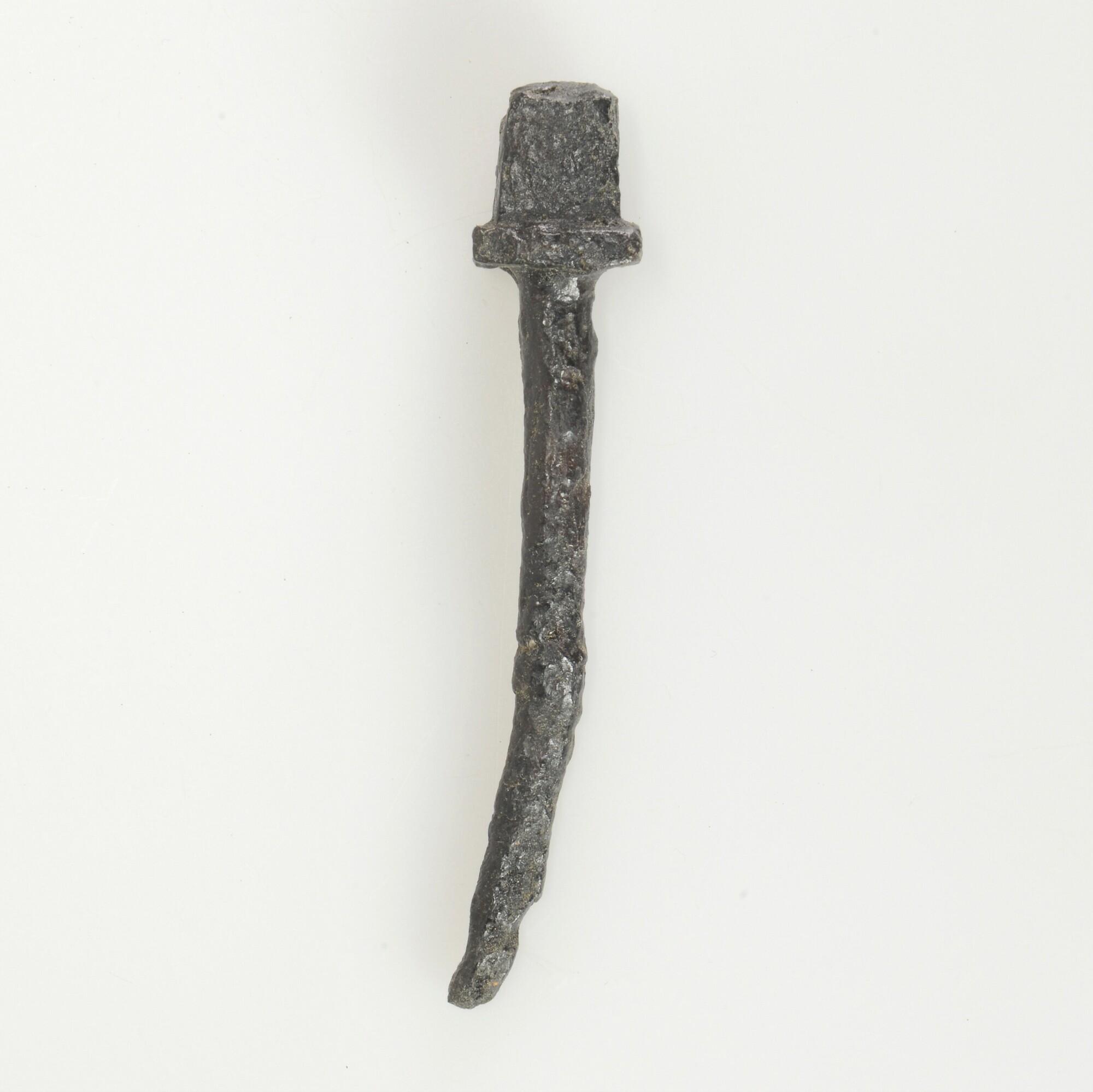 Spijker/bekroning; vierkante knop, licht versmallend naar boven toe; aan onderzijde verbreed. Nagel rond in doorsnede