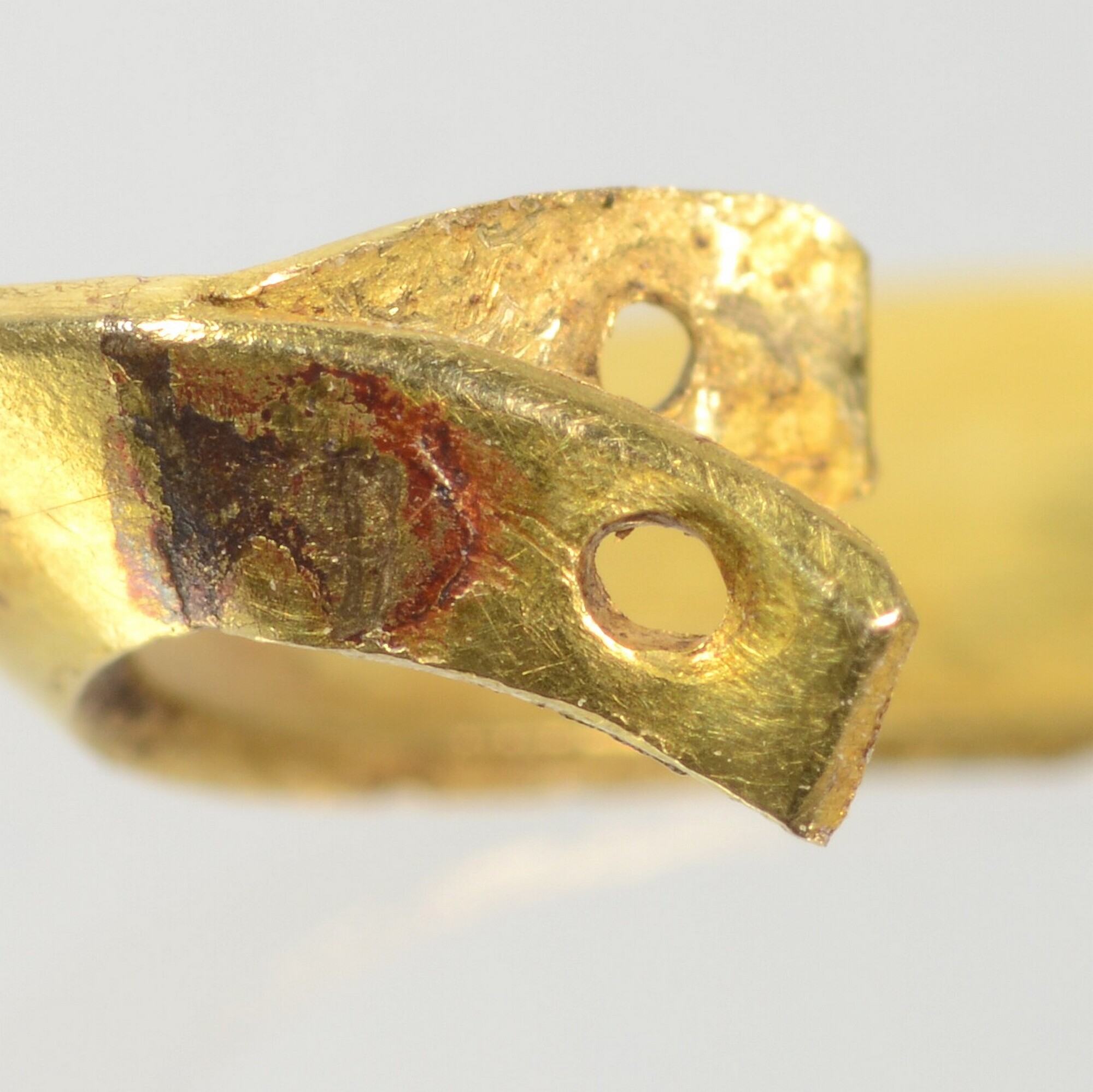 Sieraad/oorbel?; sikkelvormig met aan v-vormig uiteinde twee bevestigingsgaten