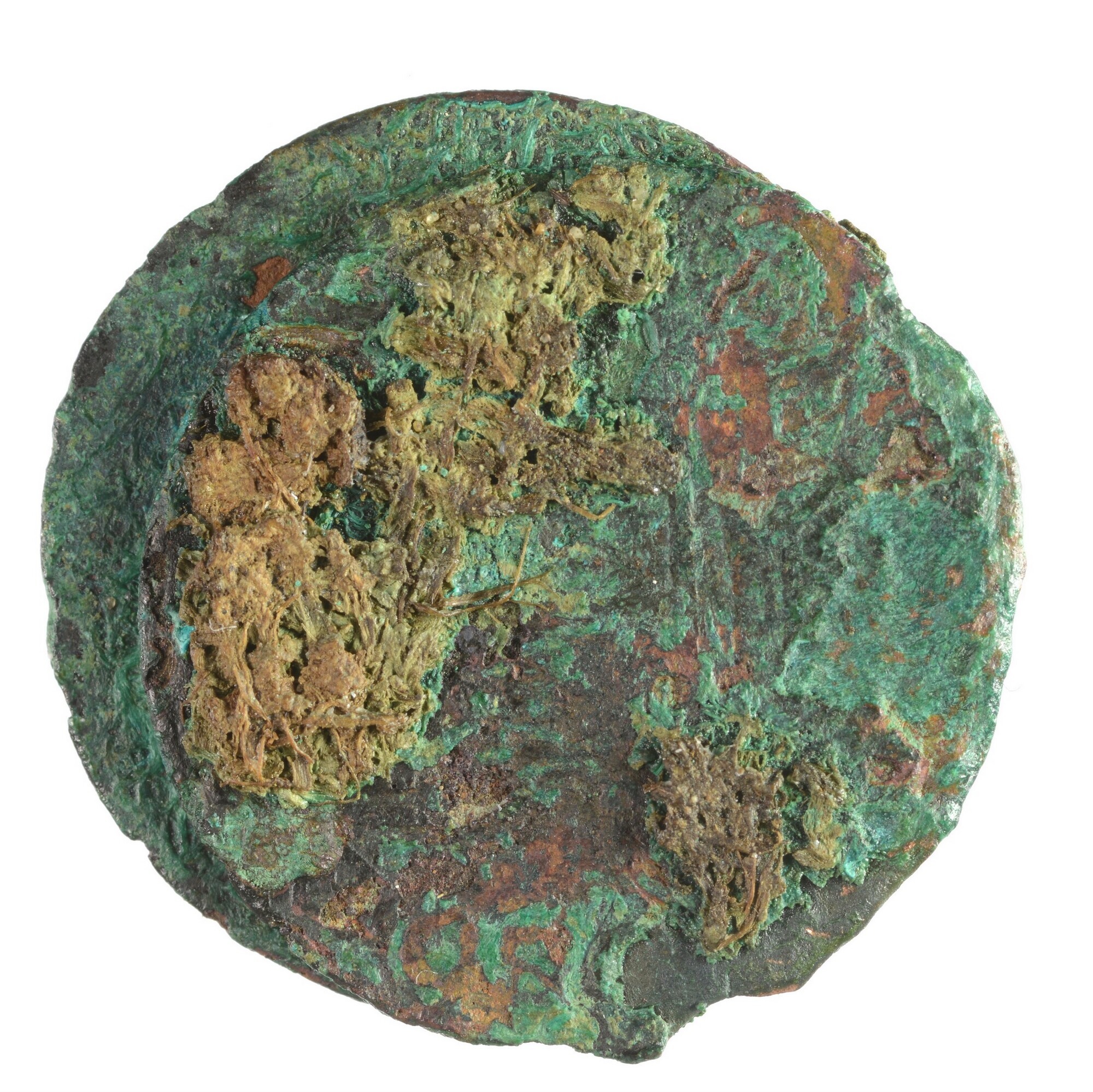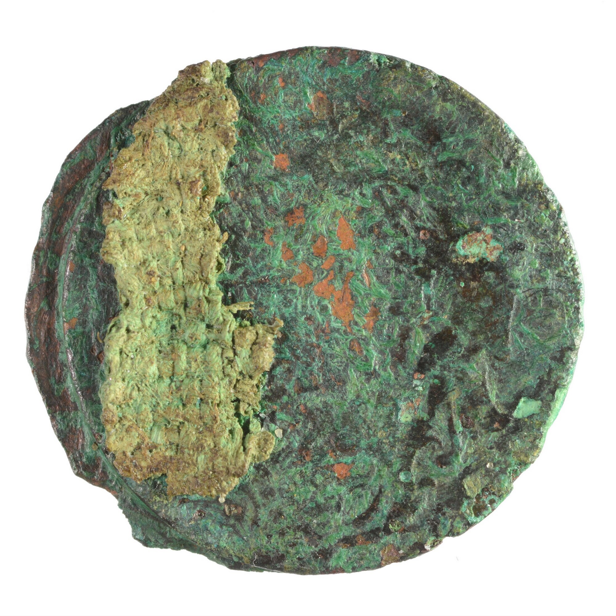 Duit; 2x aanengecorrodeerd met textielresten; één munt is duit van Gelderland