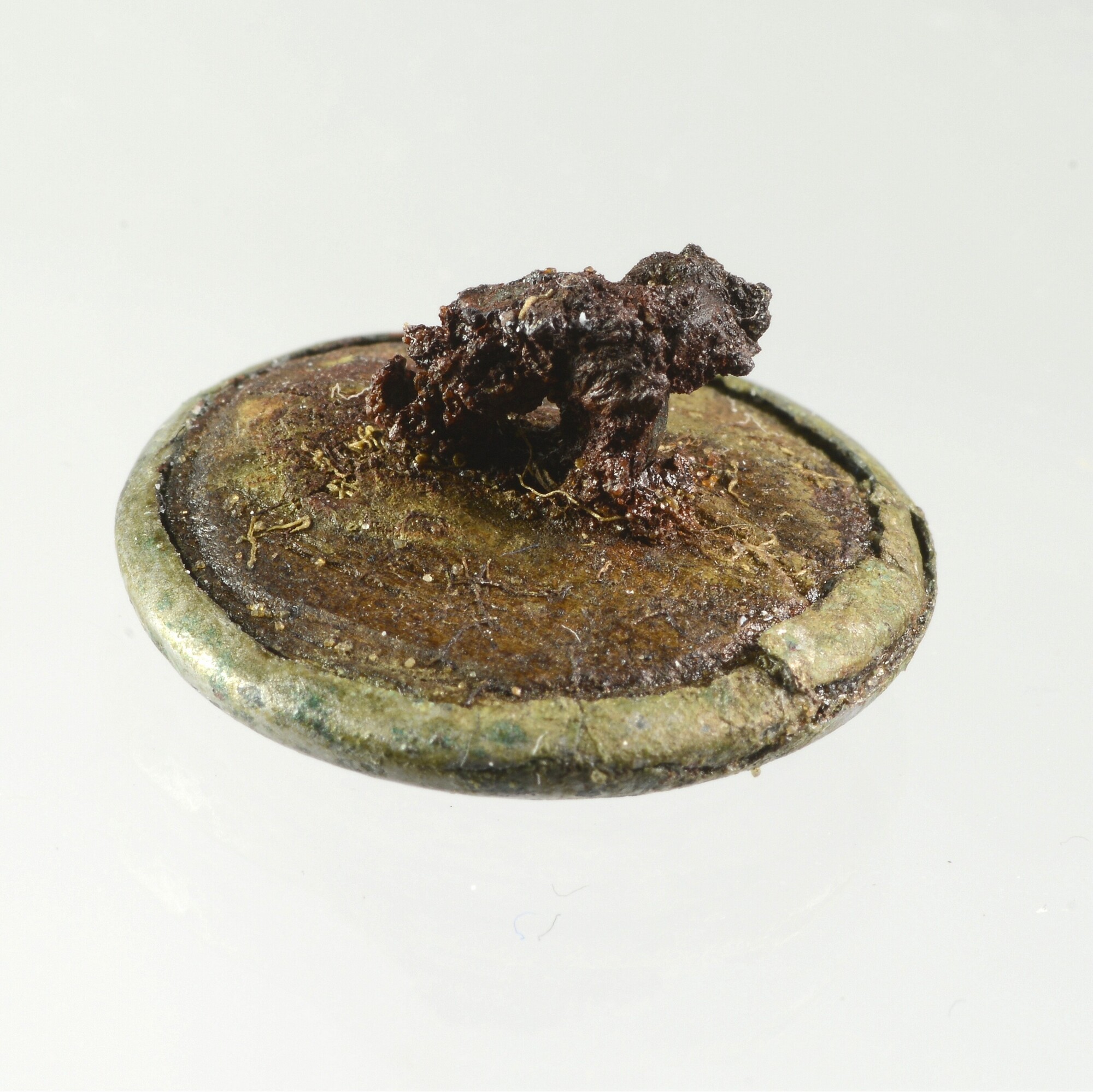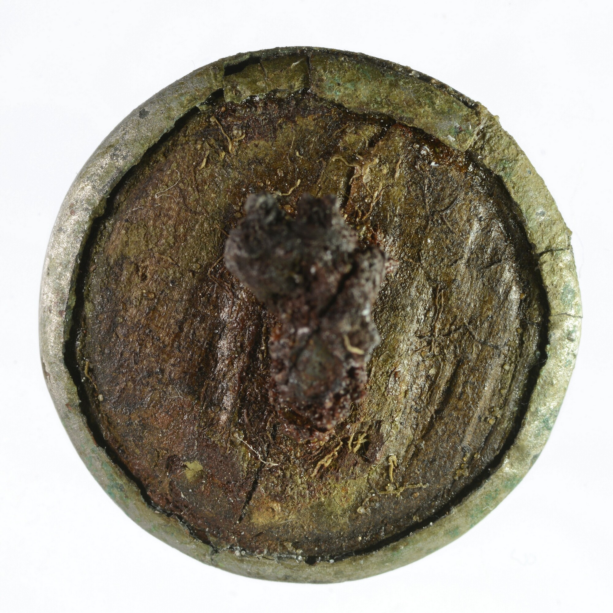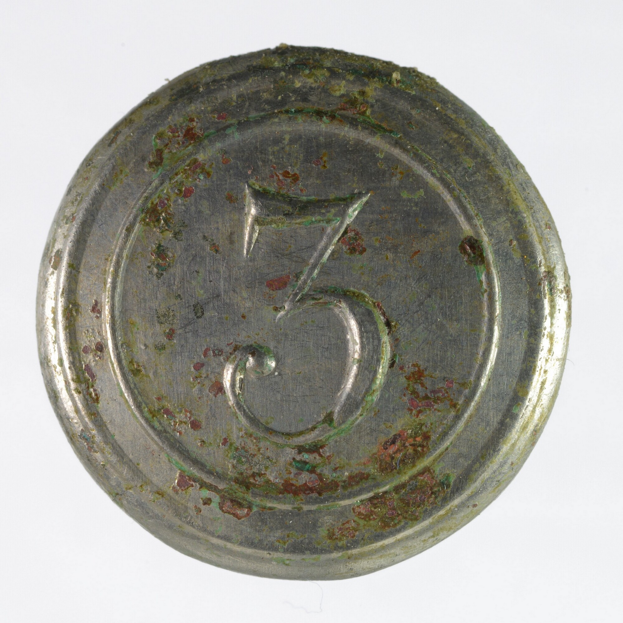 Uniformknoop; Bataafse leger, 3e Bataljon Infanterie; oog; cijfer 3 binnen dubbele cirkel; ijzeren knoop met kapje van vertind messing