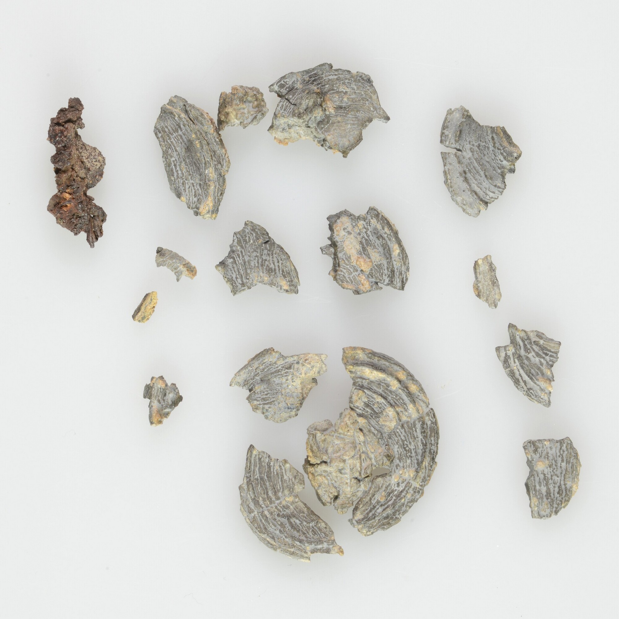 Knoop; zeefresidu 17 fragmenten tinnen knopen en één ijzerfragment met textielresten