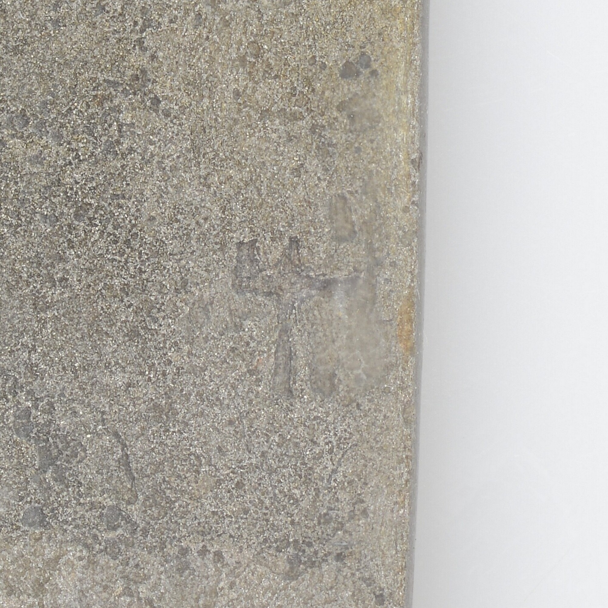 Mes; fe-mes; éénsnijdend mes met heft van wortelhout en een vierkant bekroningsplaatje met gravering. Het lemmet is driehoekig in doorsnede, en het uiteinde ontbreekt