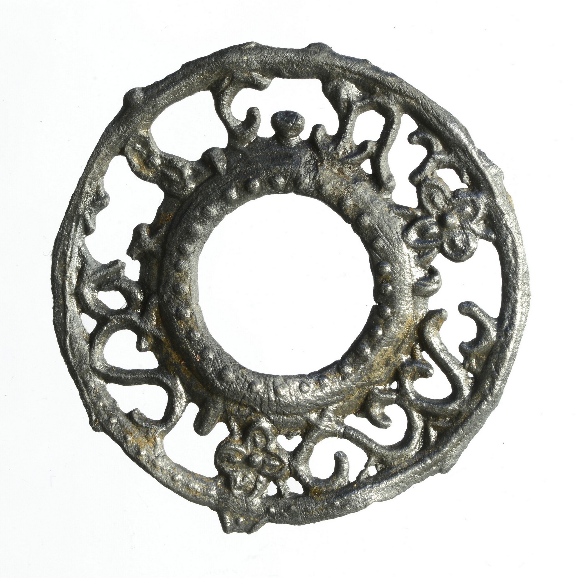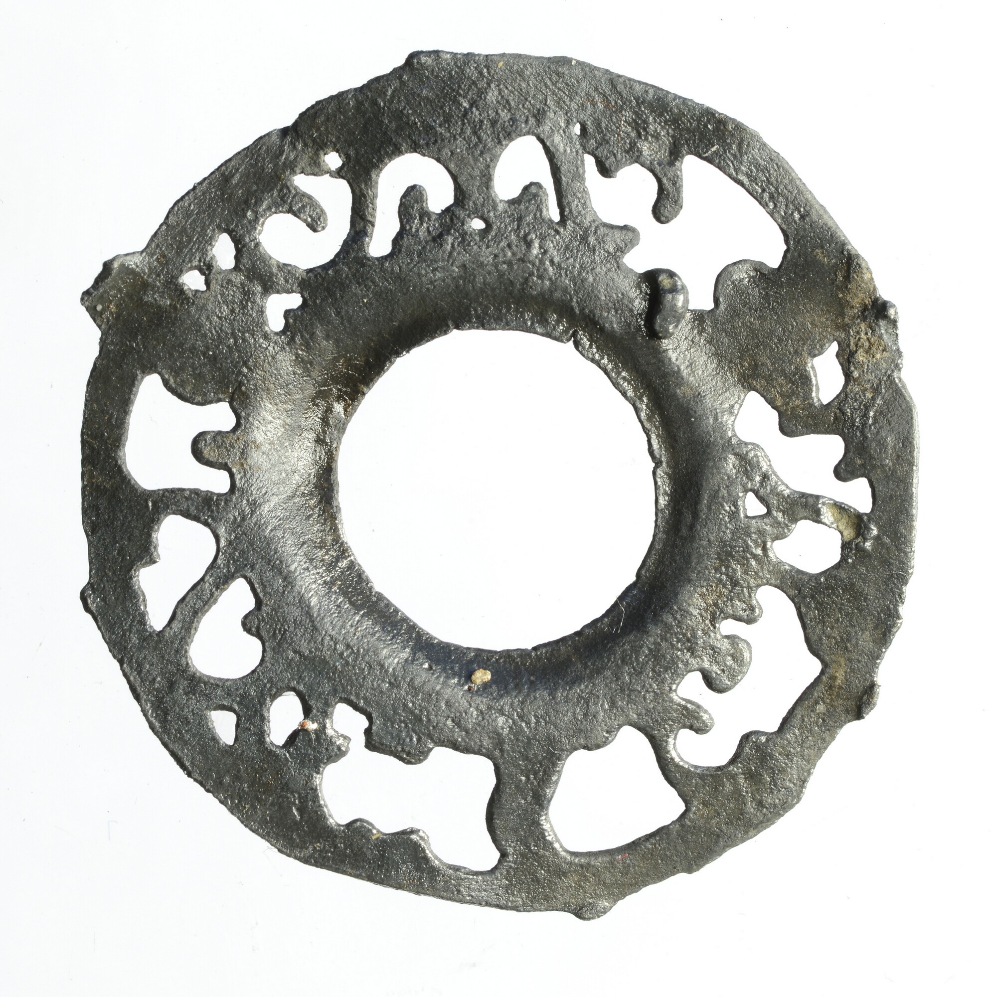 Hanger; rond opengewerkt met in het midden een rond gat waarin zich mogelijk een spiegeltje heeft bevonden