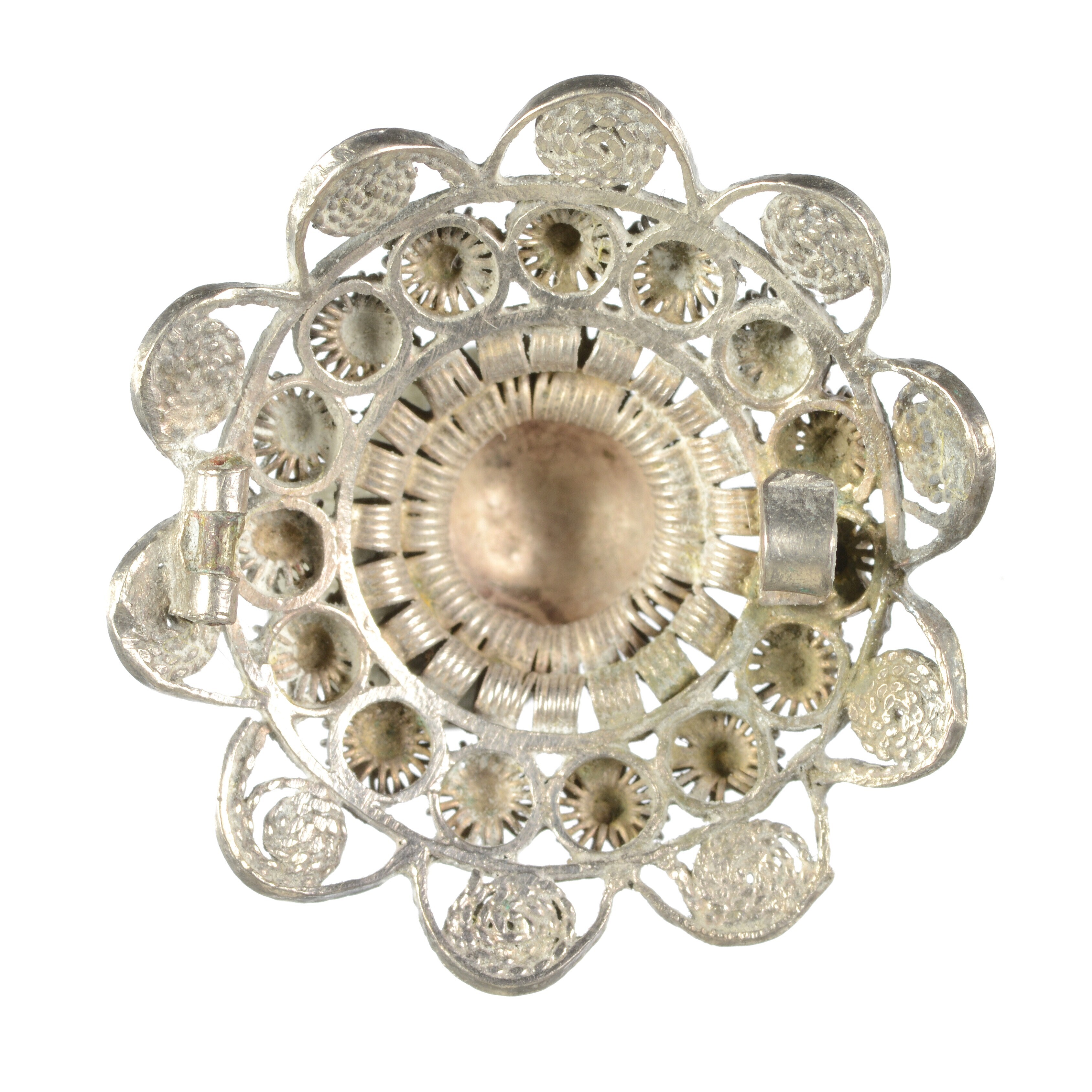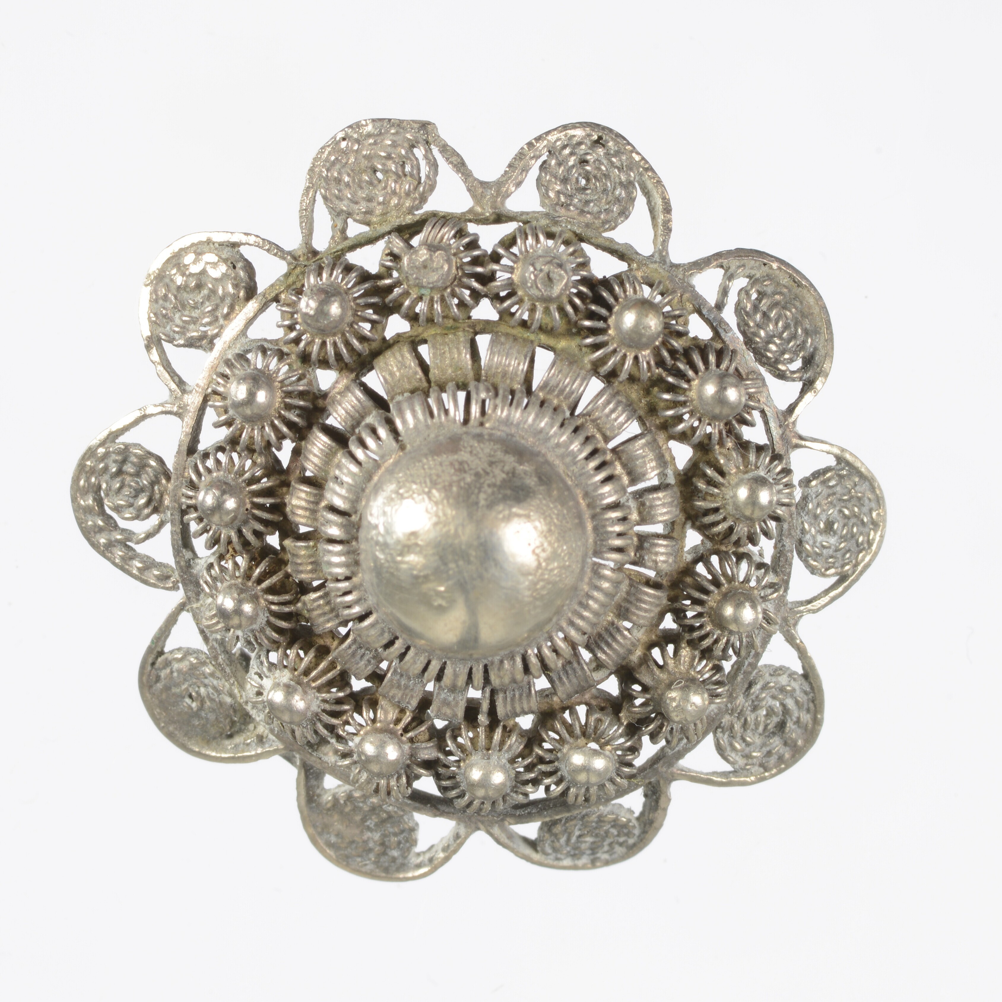 Speld/broche; ronde, opengewerkte schijf in filigrain techniek; aan de achterzijde is de naaldhouder aanwezig