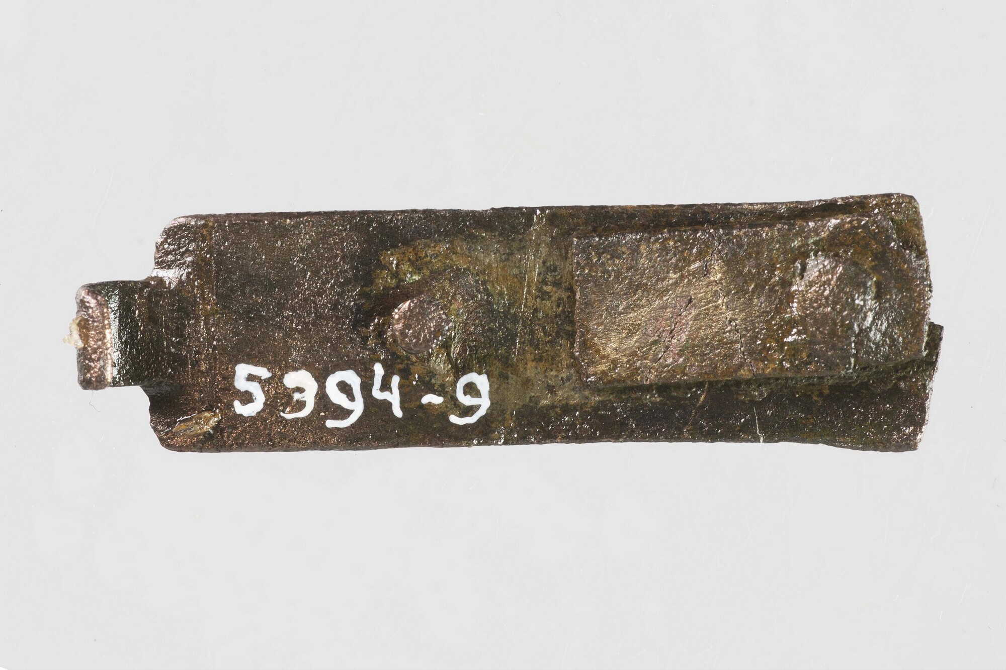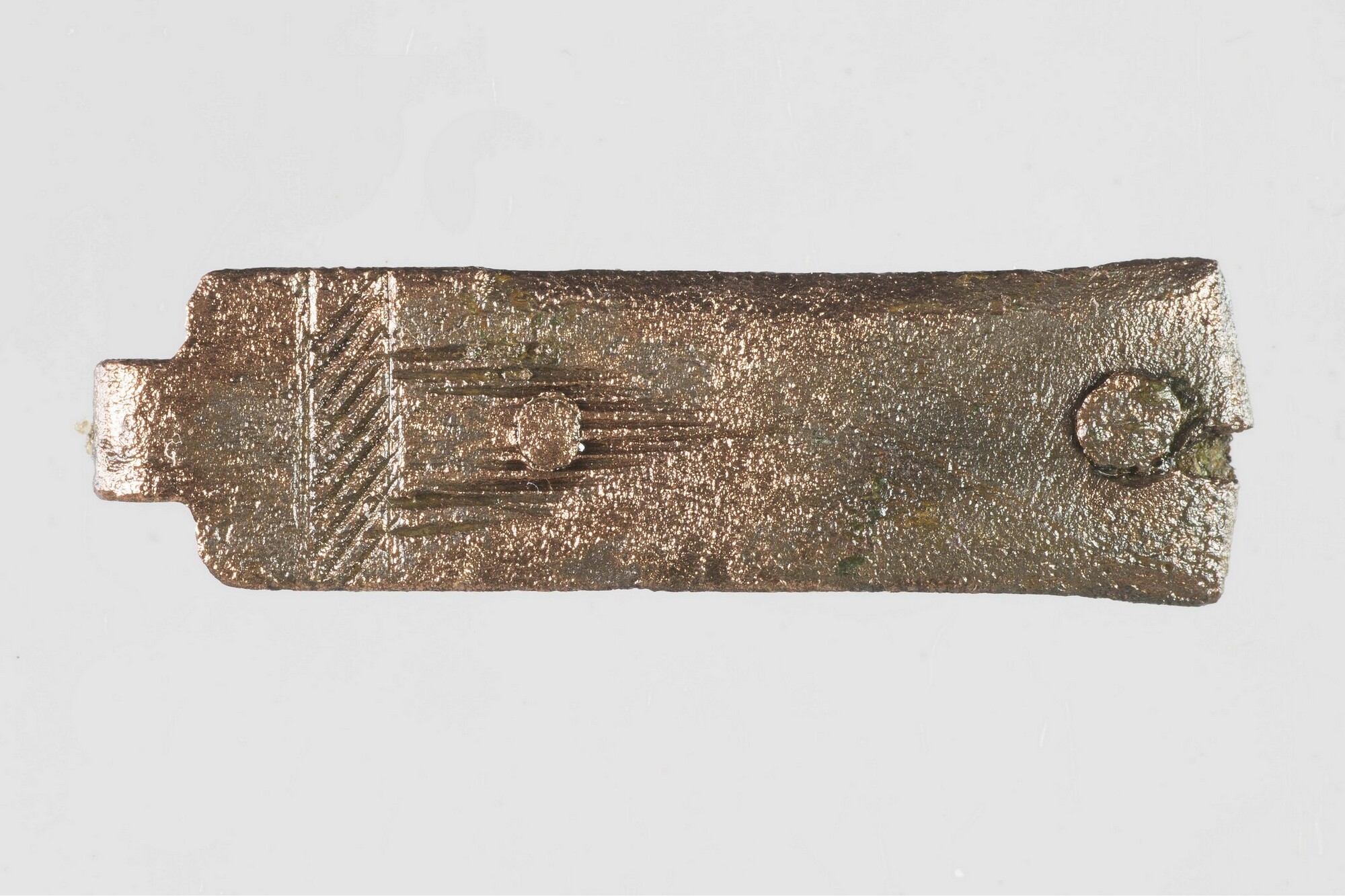 Boekbandsluiting; sluithaak; klinkplaatje aan achterzijde vastgeklonken; versierd met zaag- en vijlwerk