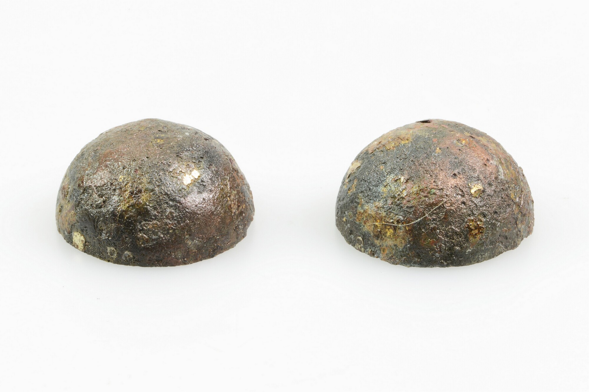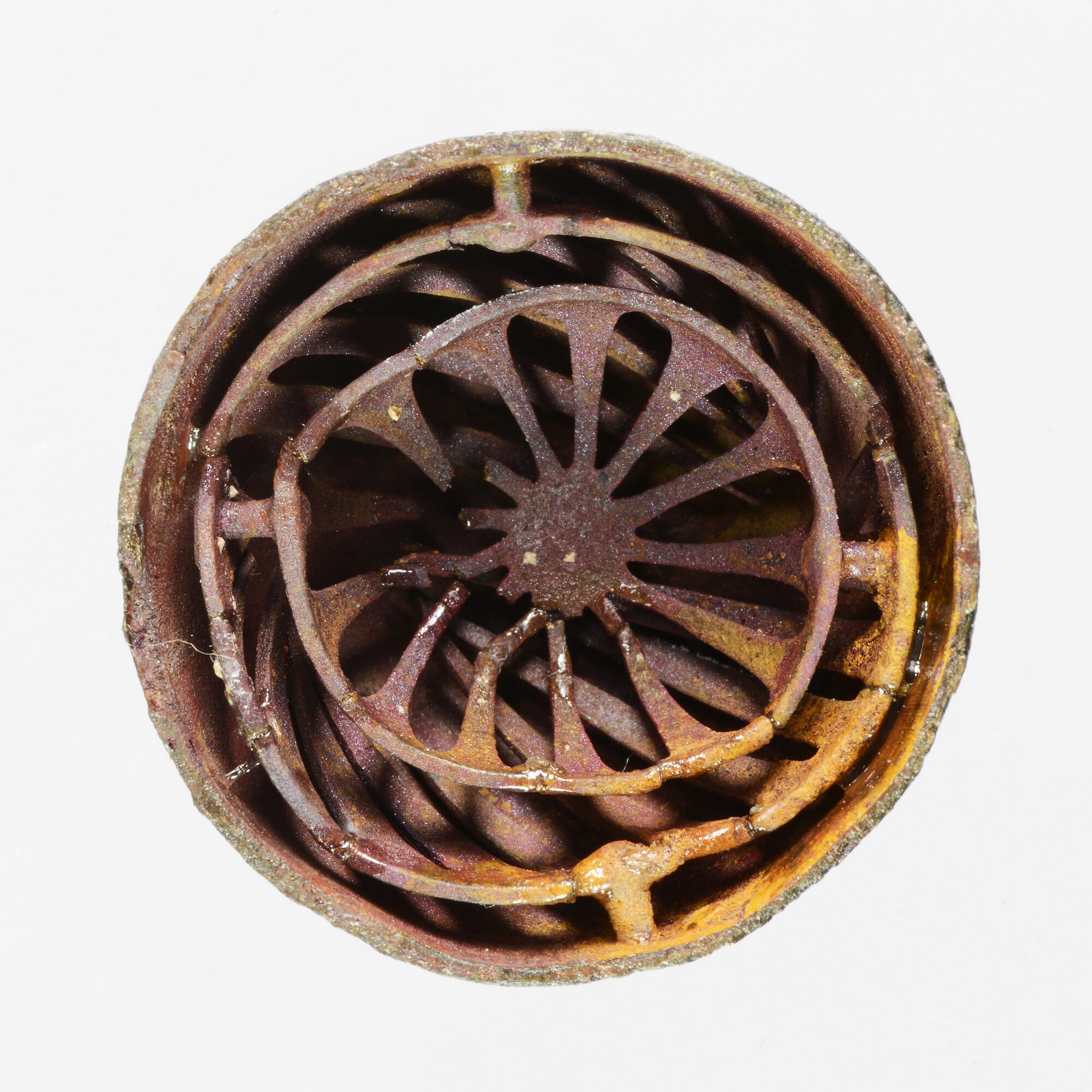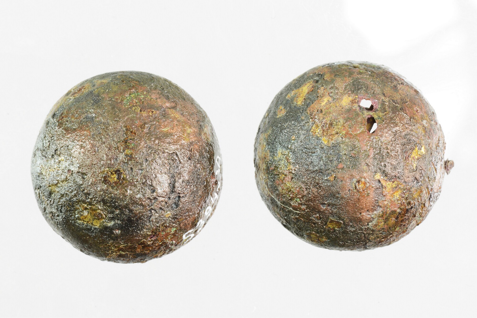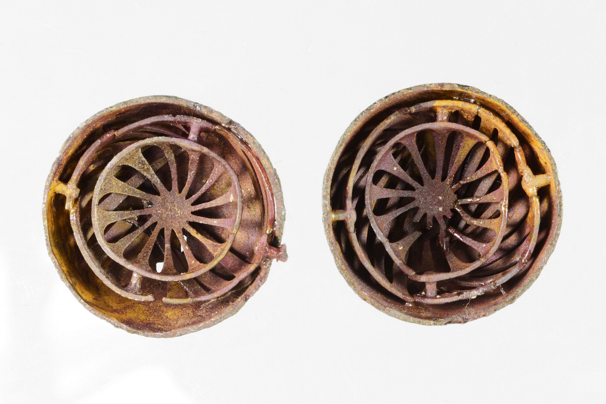 Twee halve bollen; aan de binnenzijde van beide halve bollen een metalen geraamte bevestigd met een cardanische ophanging; sporen van verguldsel; in een van de twee halve bollen twee gaatjes