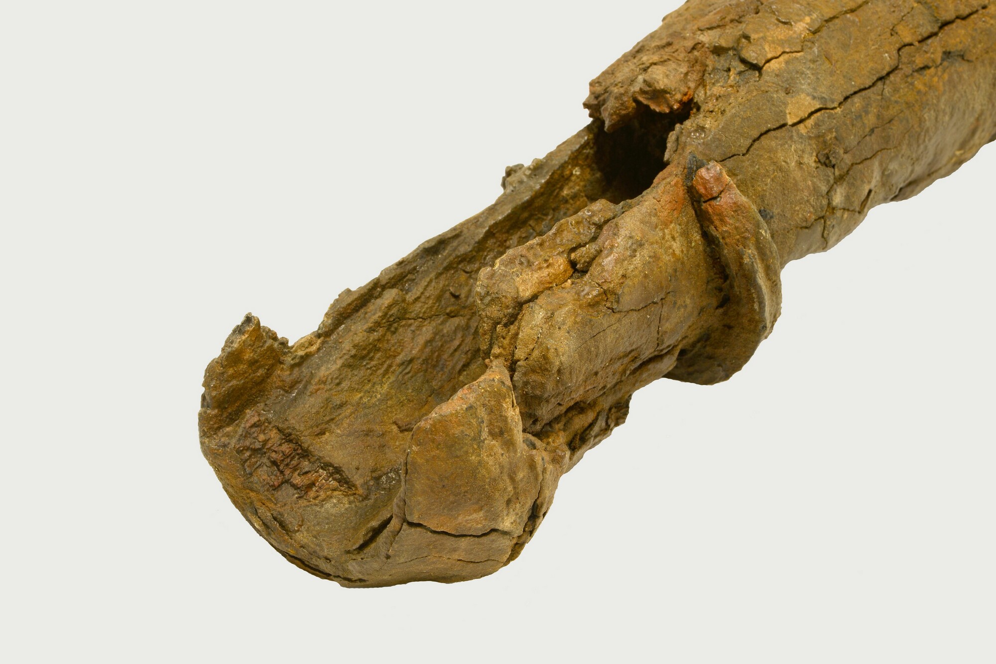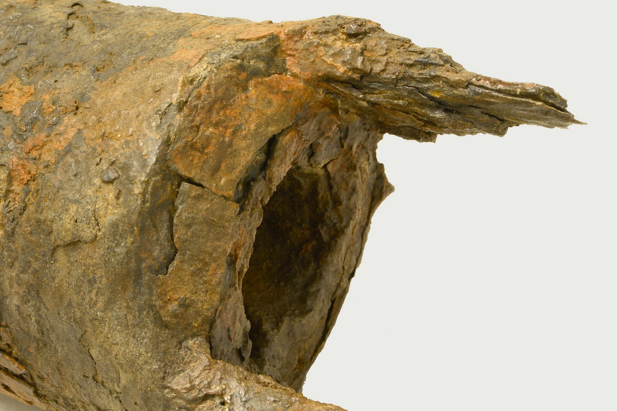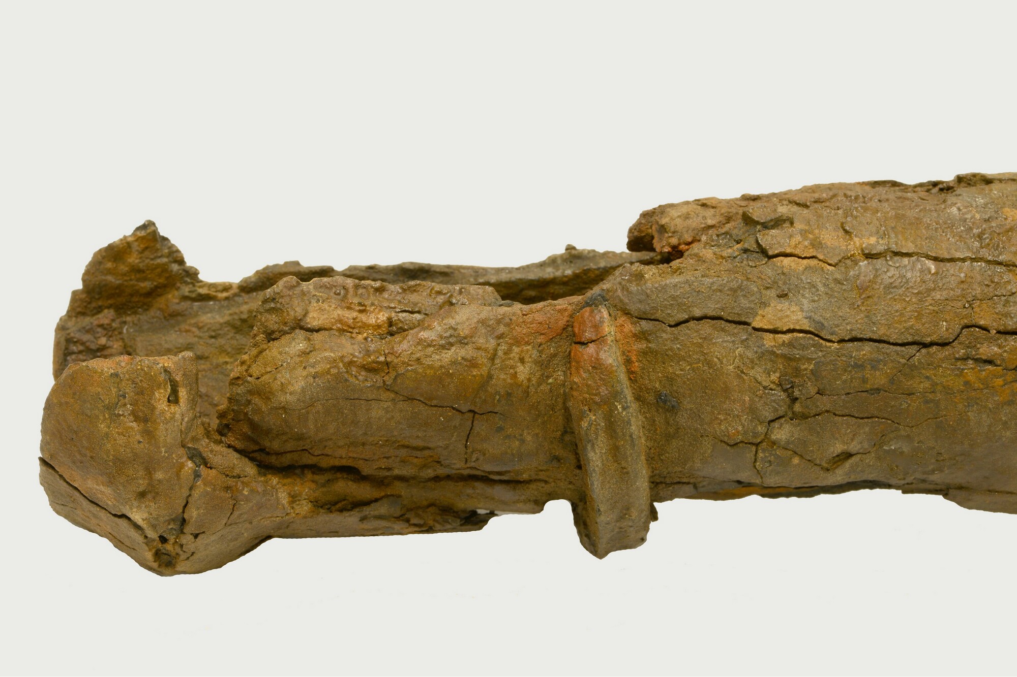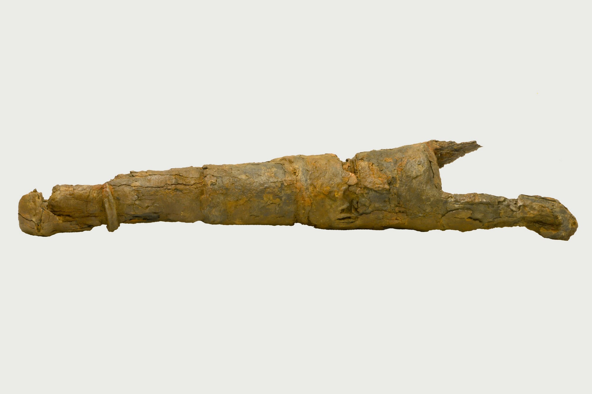 Draaibas; smeedijzer; incompleet; zwaar gecorrodeerd; twee kogels afkomstig uit de loop (dia 1.5-1.6 cm); een klein fragment textiel afkomstig uit de loop los bijgevoegd; gewicht: 29 kg incl plank
