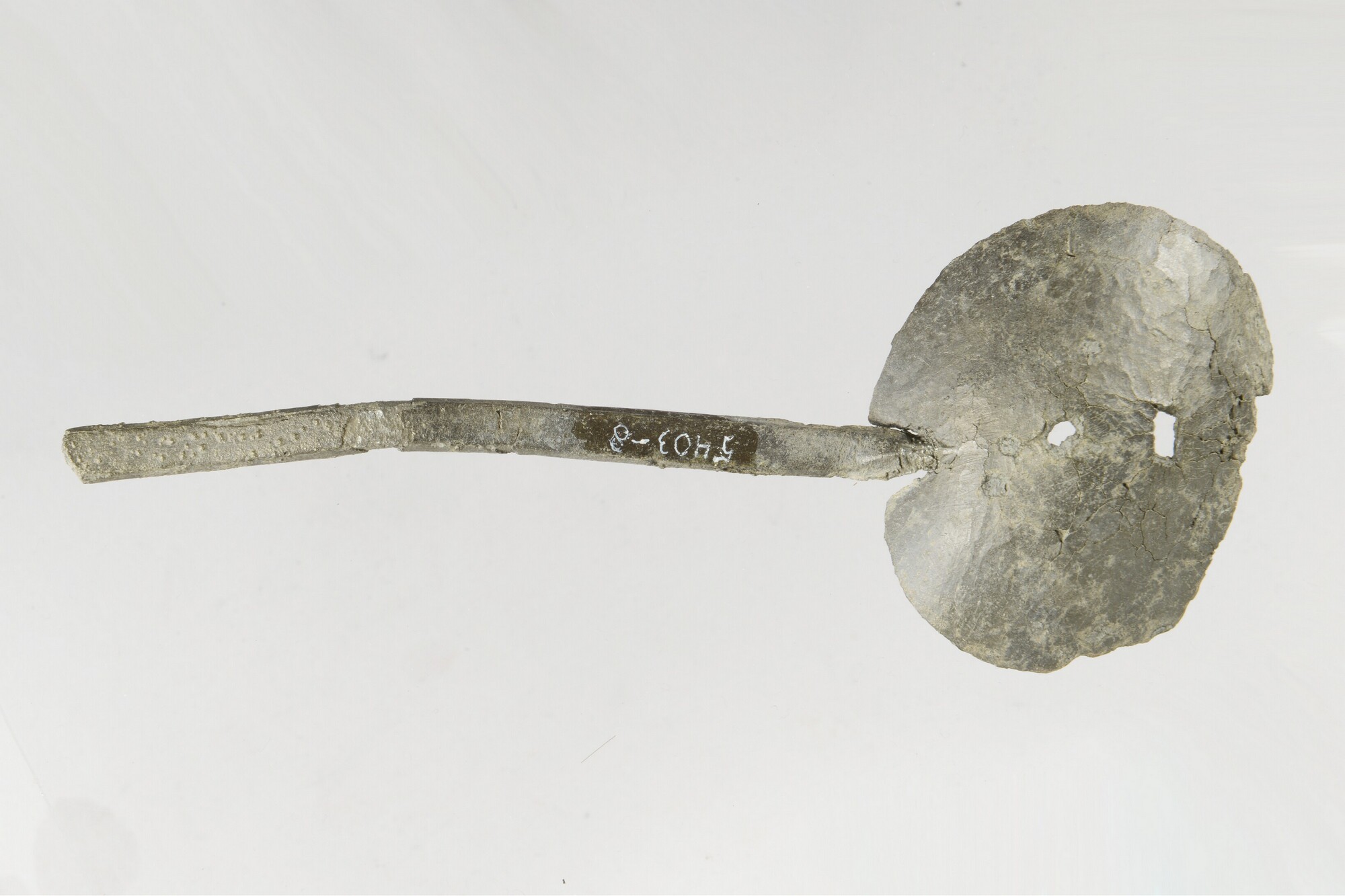 Lepel; smalle, langwerpige steel en ronde, diepe bak; secundaire, vierkante doorboring in de bak