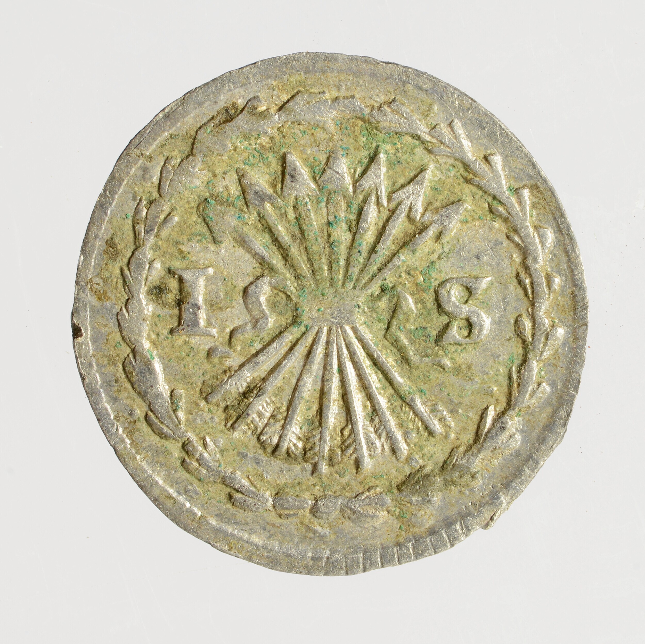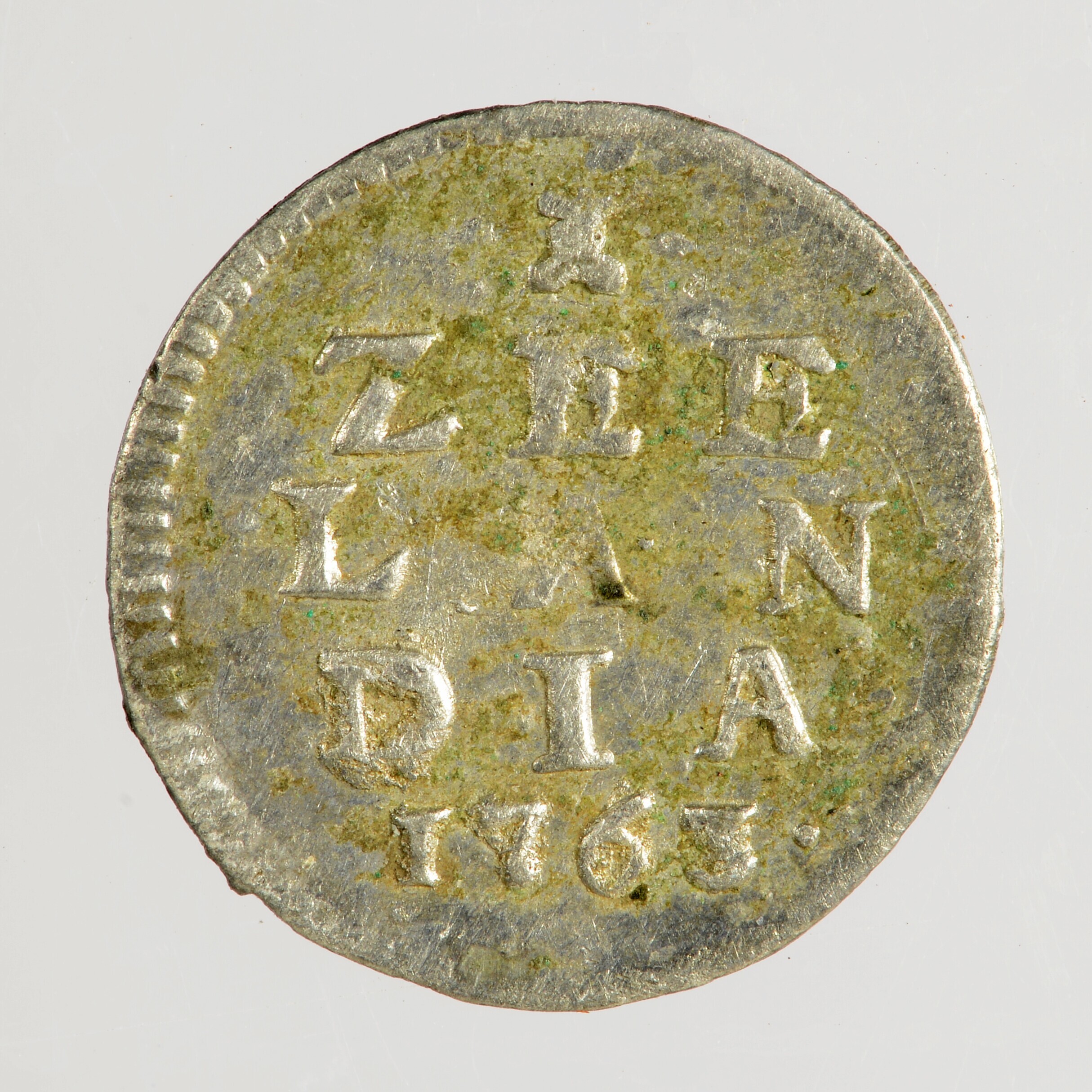 Bezemstuiver; Zeeland provincie (1581-1795); vz.: binnen een bladerkrans in vijf regels: • (burcht) • / ZEE / LAN / DIA / 1763; kz.: bundel van zeven pijlen binnen een bladerkrans met 1 – S ter weerszijden; muntplaats: Middelburg; gewicht: 0.66 gram