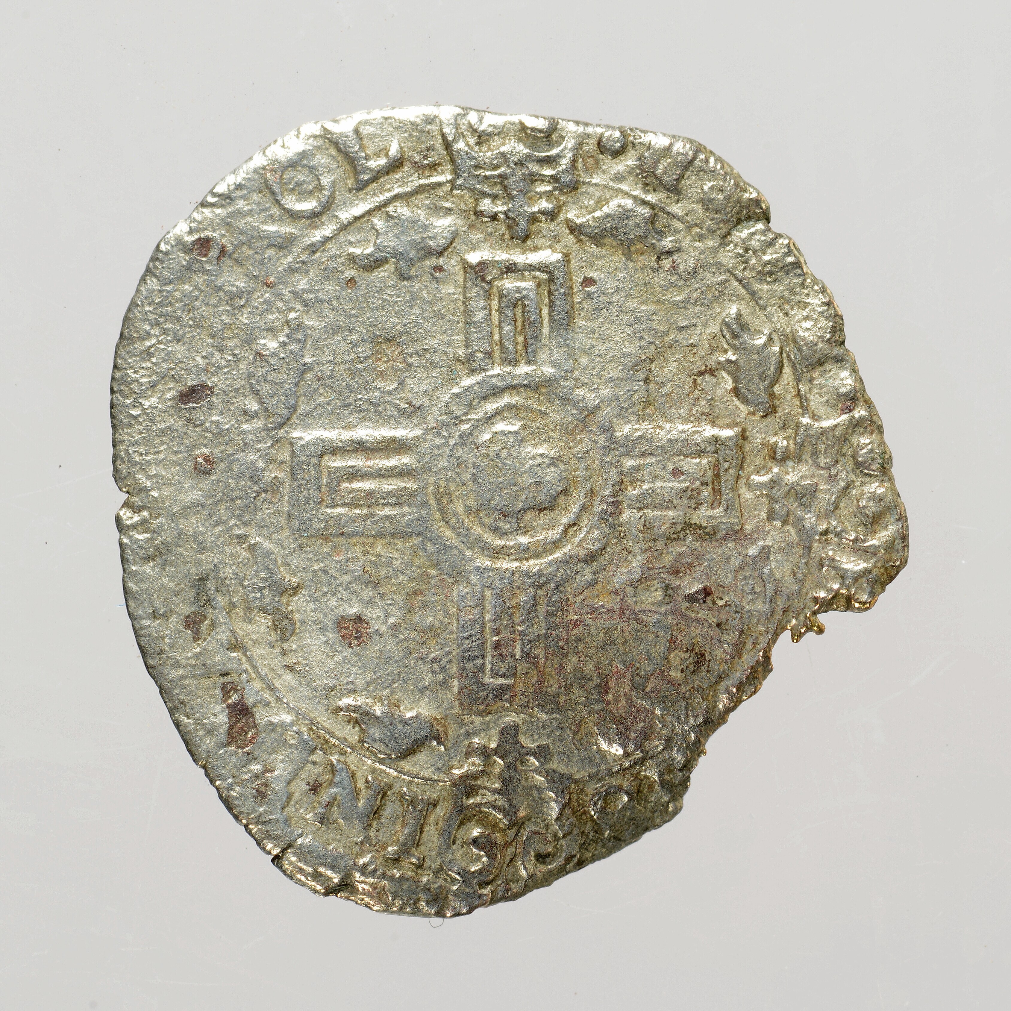 Stuiver; Spaanse Nederlanden (1556-1715); Karel II van Spanje (1665-1700); vz.: kruis met muntmerk in het centrum (lelie) en omschrift: [CAR]OL • [II • D • REX • HI]S • INDIA; kz.: gekroond wapen van Karel II met aan weerszijden het jaartal 16 – 79 en omschrift: ARCH • AVS • DVX • [BVRG • CO ...