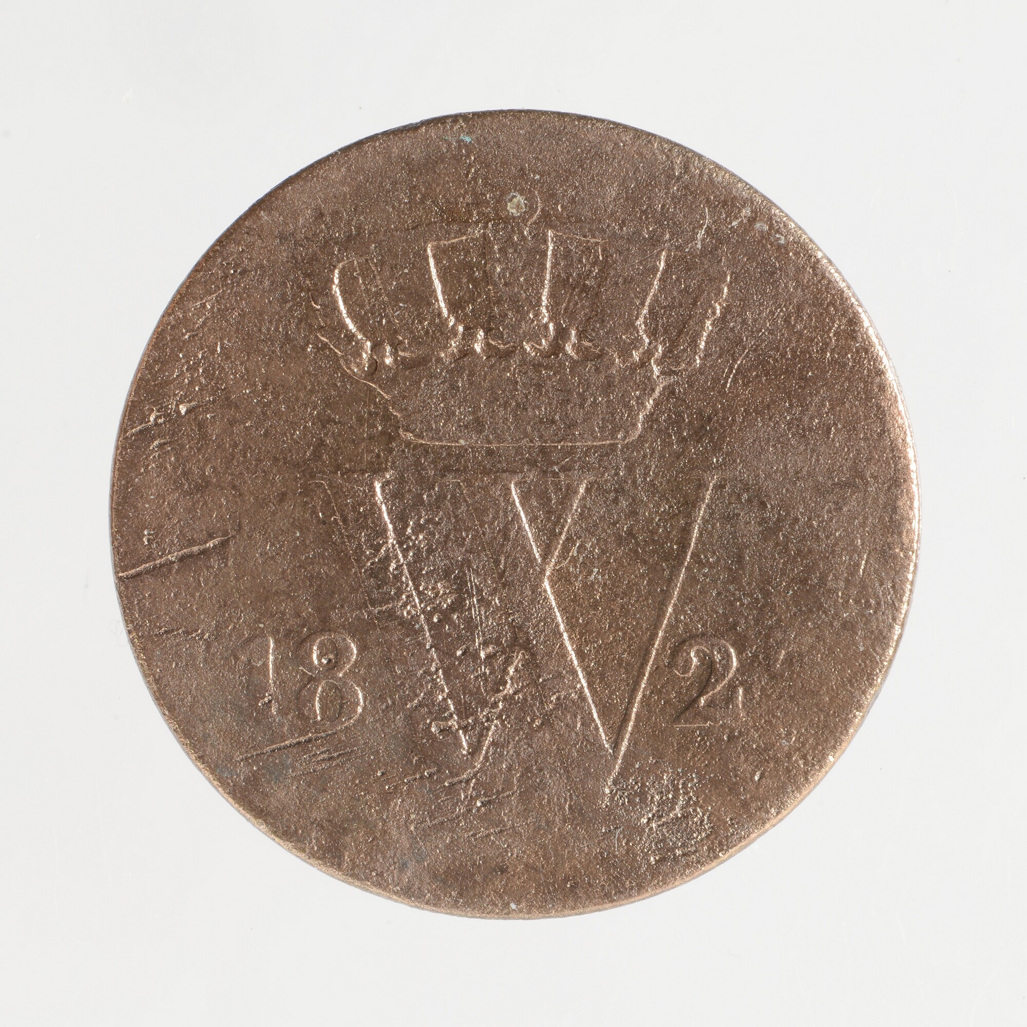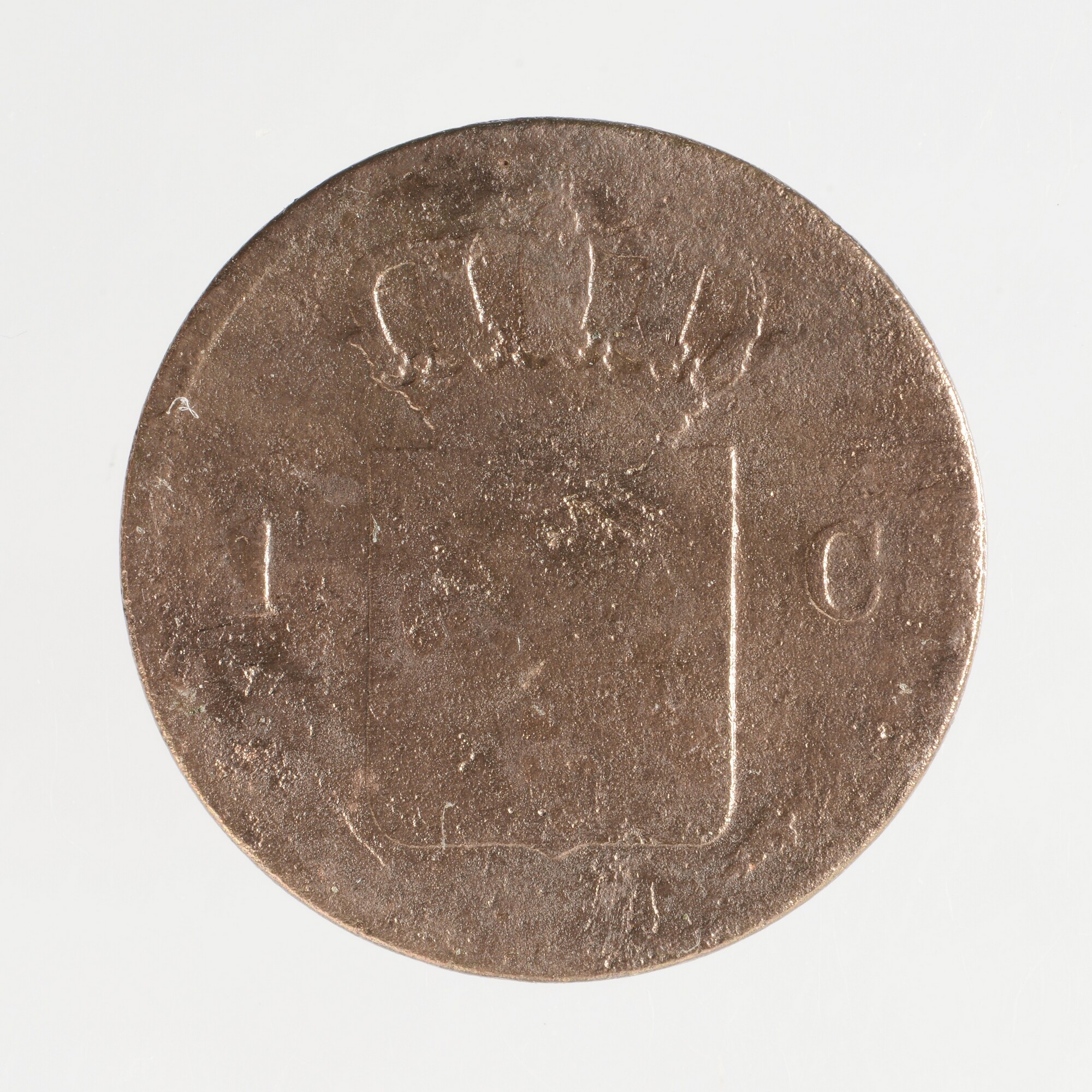 1 cent; Nederland Koninkrijk (1813-heden); Willem I (1813-1840); vz.: gekroonde W tussen jaartal 1825; kz.: gekroond Nederlands wapen (afgesleten) tussen 1 en C; gewicht: 3.25 gram