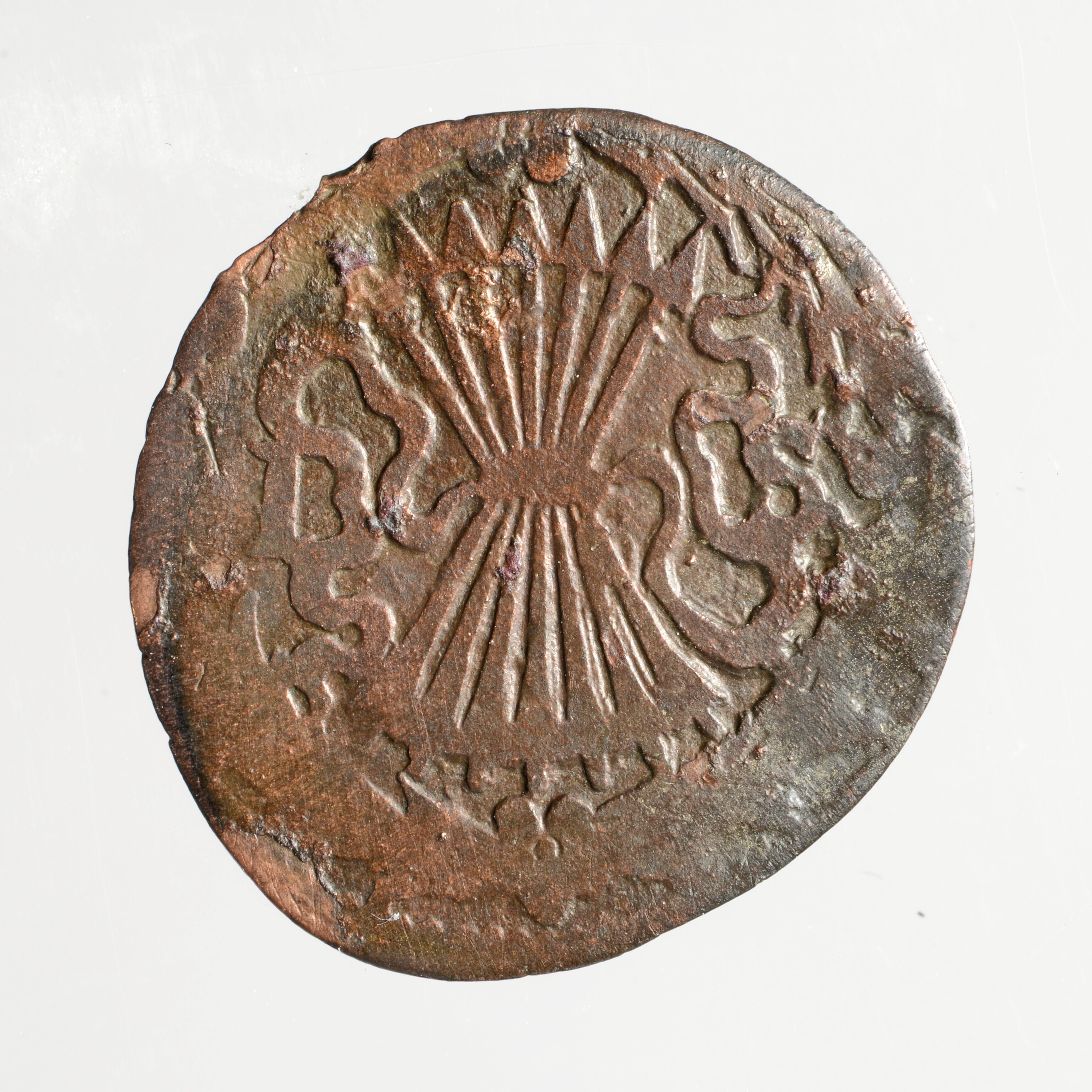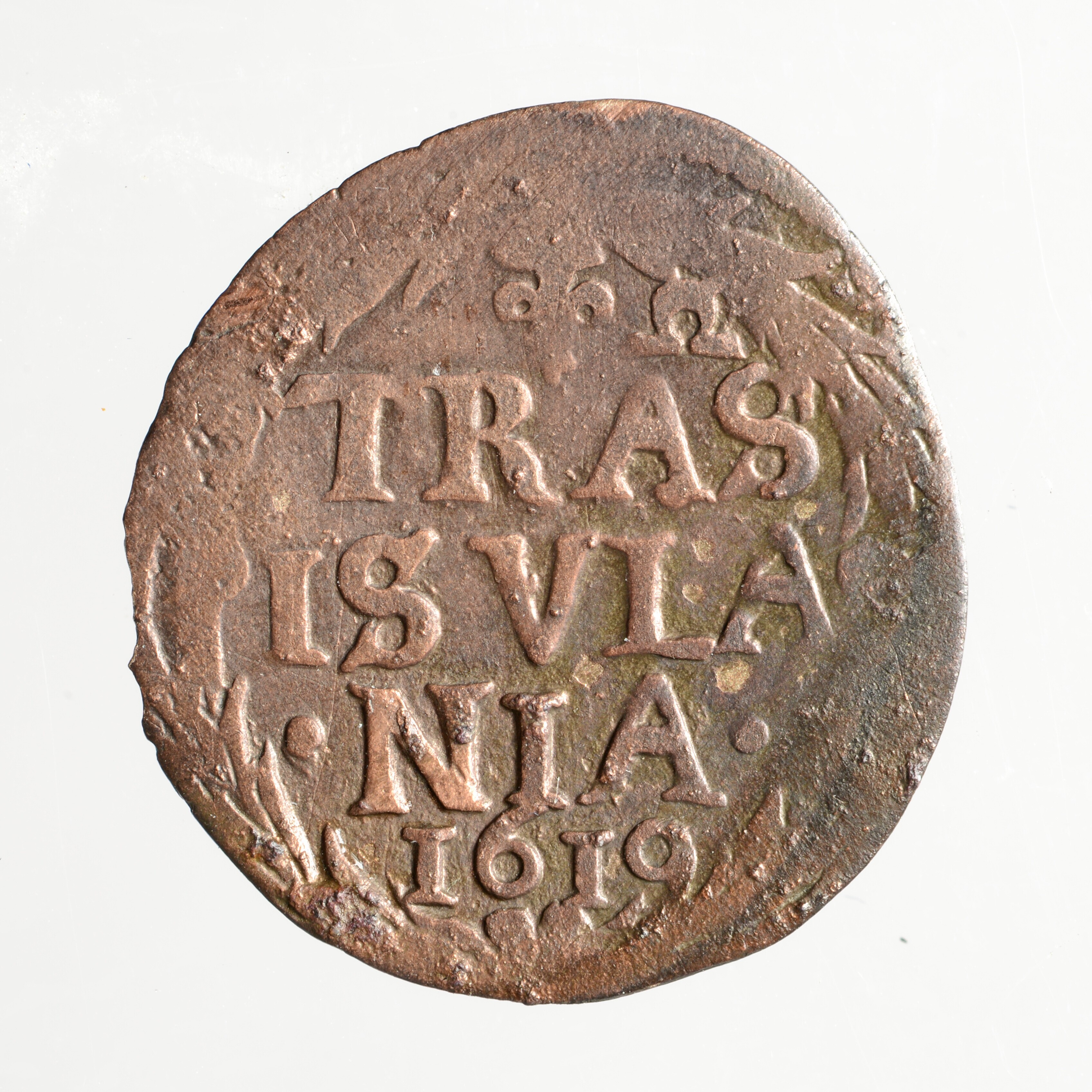 Bezemstuiver; Overijssel Provincie (1581-1795); vz.: binnen een bladerkrans in vier regels: TRAS / ISVLA / NIA / 1619; kz.: bundel van zeven pijlen binnen een bladerkrans; muntplaats: Kampen; gewicht: 1.04 gram