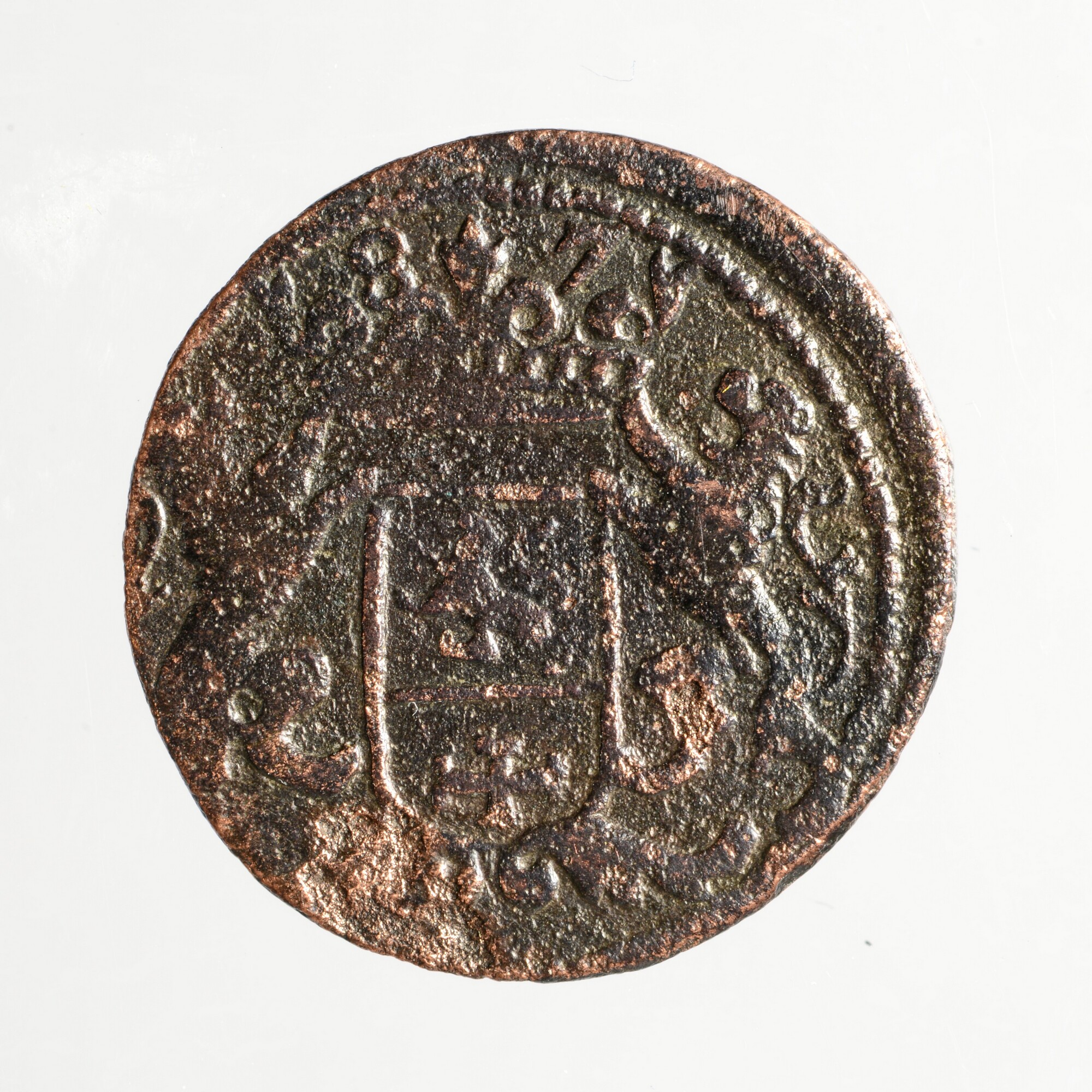 Duit; Zutphen Stad; vz.: een vierpas met daarin in drie regels CIV / ZVTPHA / NIA; kz.: gekroond stadswapen, vastgehouden door twee leeuwen, boven de kroon het jaartal 87; gewicht: 1.90 gram