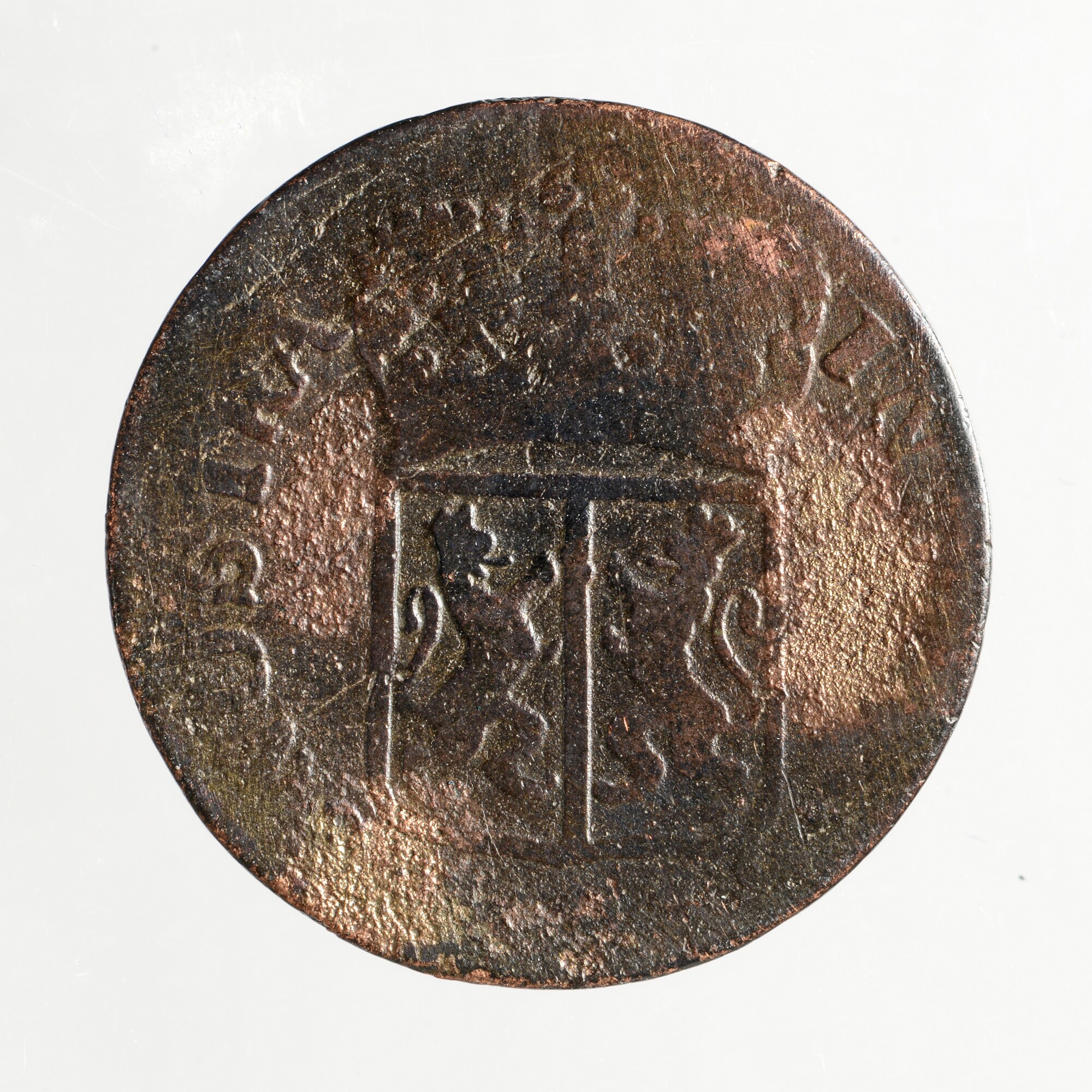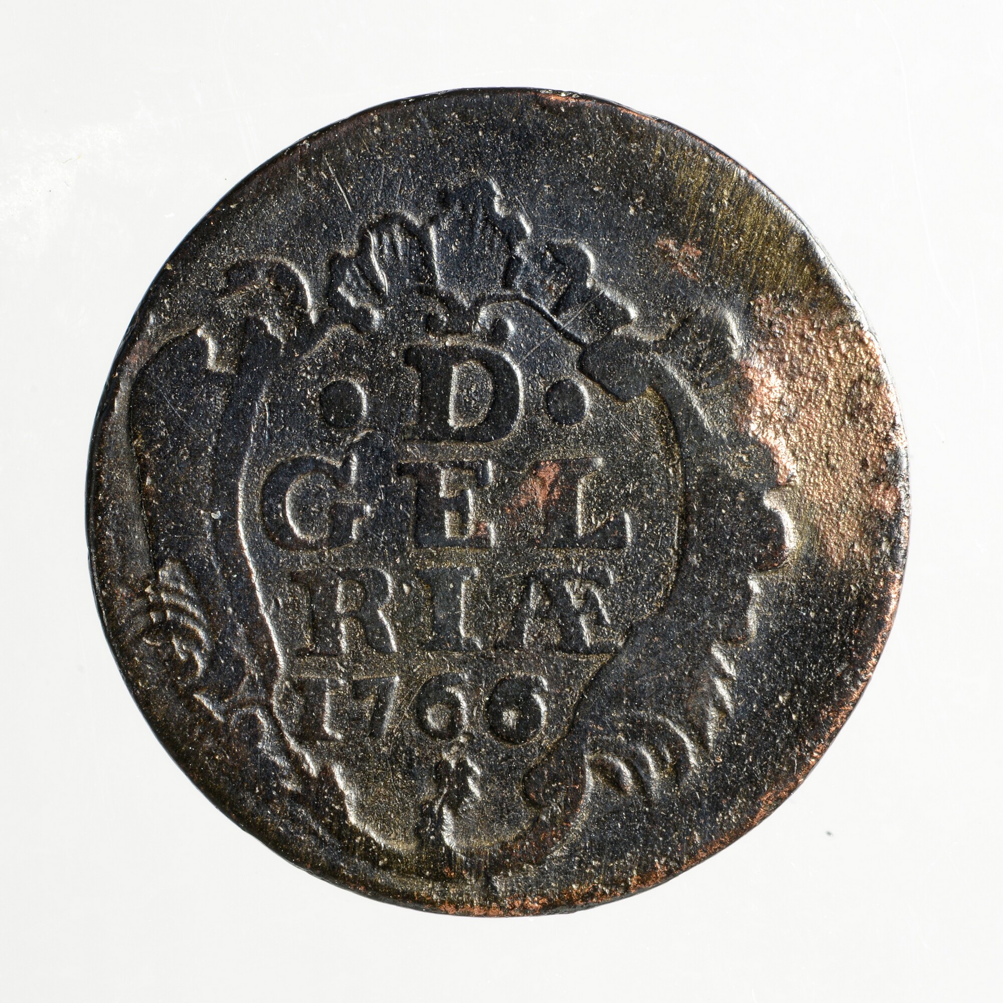 Duit; Gelderland Provincie (1581-1795); vz.: in vijf regels: •D• / GEL / RIAE / 1766 / (geknotte boom met loot); kz.: gekroond wapenschild van Gelderland, met omschrift IN [DEO EST SPES] NOSTRA; muntplaats: Harderwijk; gewicht: 2.70 gram