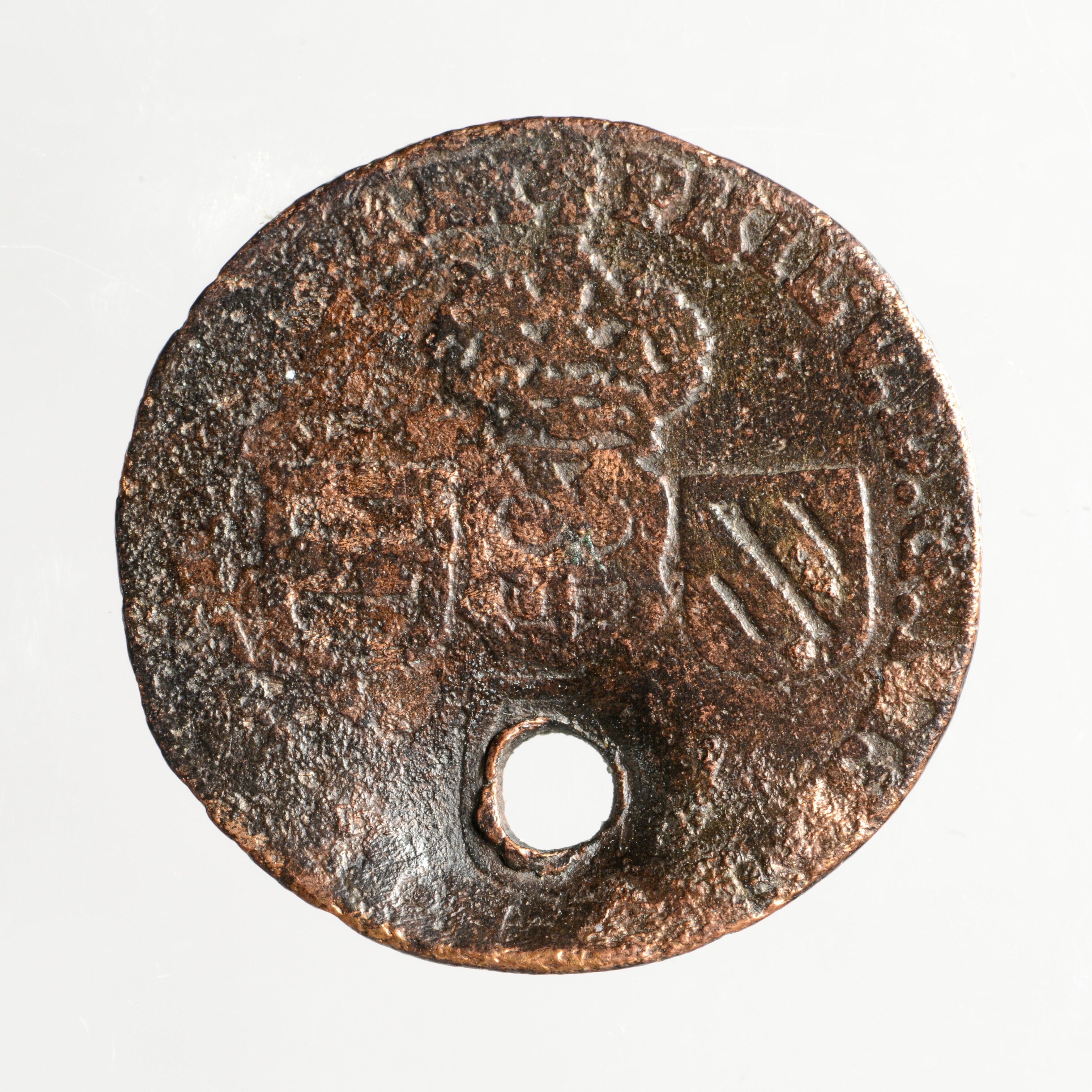 Oord; Namen Graafschap (981-1795); Philips V (1700-1746); vz.: gekroond vuurijzer omgeven door drie wapenschilden van Brabant en Bourgondië, omschrift PHIL V D.G. [HISPAN • ET • INDIARVM • REX]; kz.: gekroond Spaans wapenchild, aan weerszijden daarvan het jaartal 1710, omschrift DVX • BVRGVNDIAE • ET [• BRABAN •]; secundaire doorboring; muntplaats: Namen; gewicht: 2.90 gram