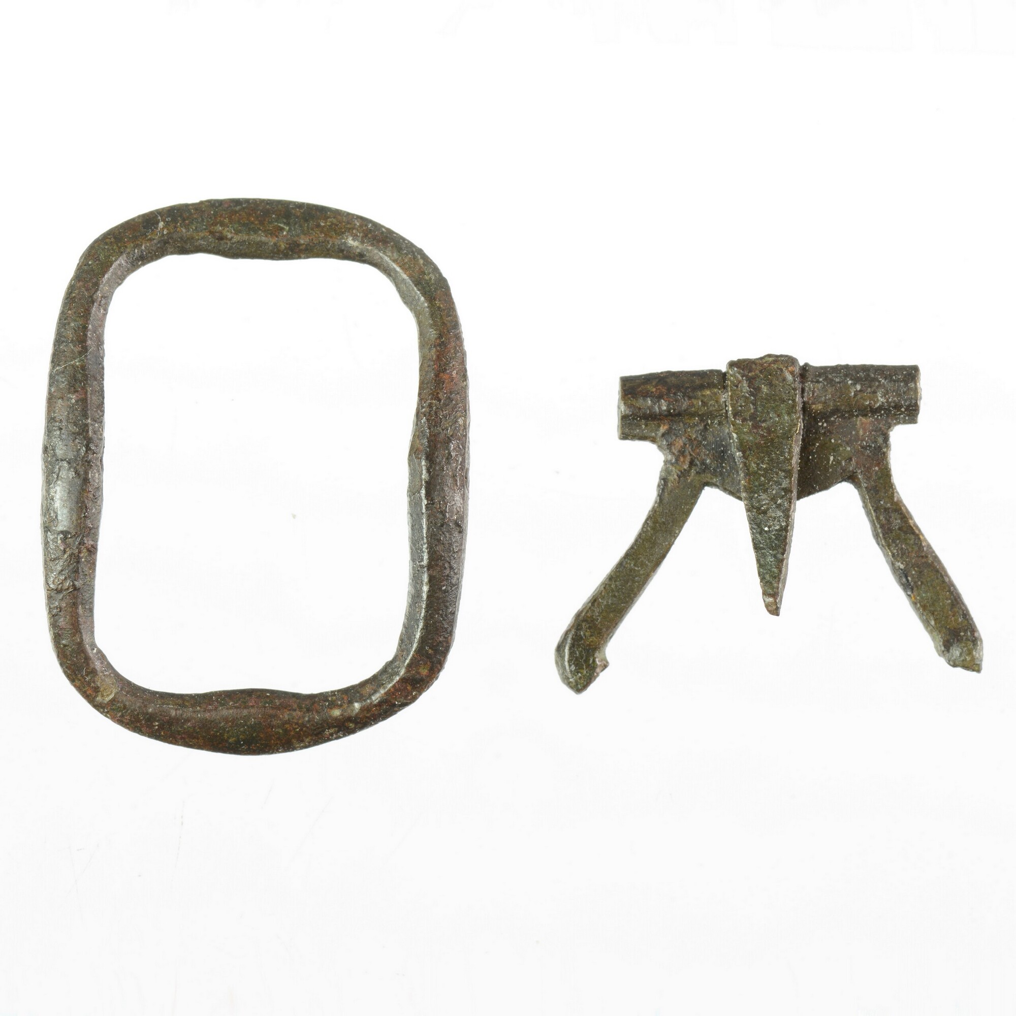 Gesp; rechthoekige gesp met afgeronde hoeken, aan de binnenkant zijn de zijden licht verbreed; beslagplaat; angel; tussenstijl ontbreekt