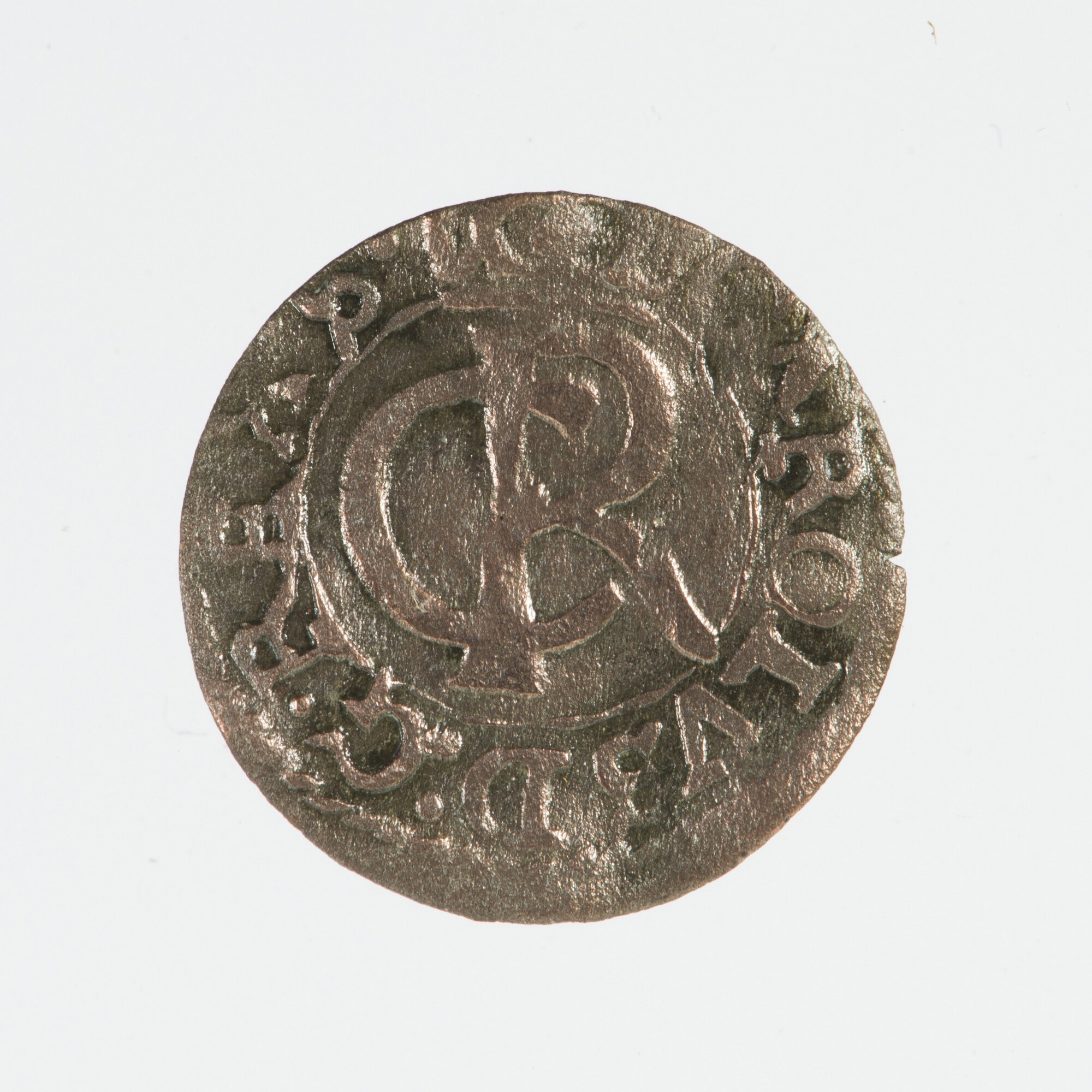 Solidus; Letland, Zweedse overheersing (1620-1721); Carl XI (1655-1697); vz.: gekroonde CR binnen een cirkel met omschrift: CAROLVS.D.G.REX S; kz.: wapenschild met gekruiste sleutels van de stad Riga met omschrift: SOLIDVS.CIVI.RIG.62; muntplaats: Riga; gewicht: 0.51 gram