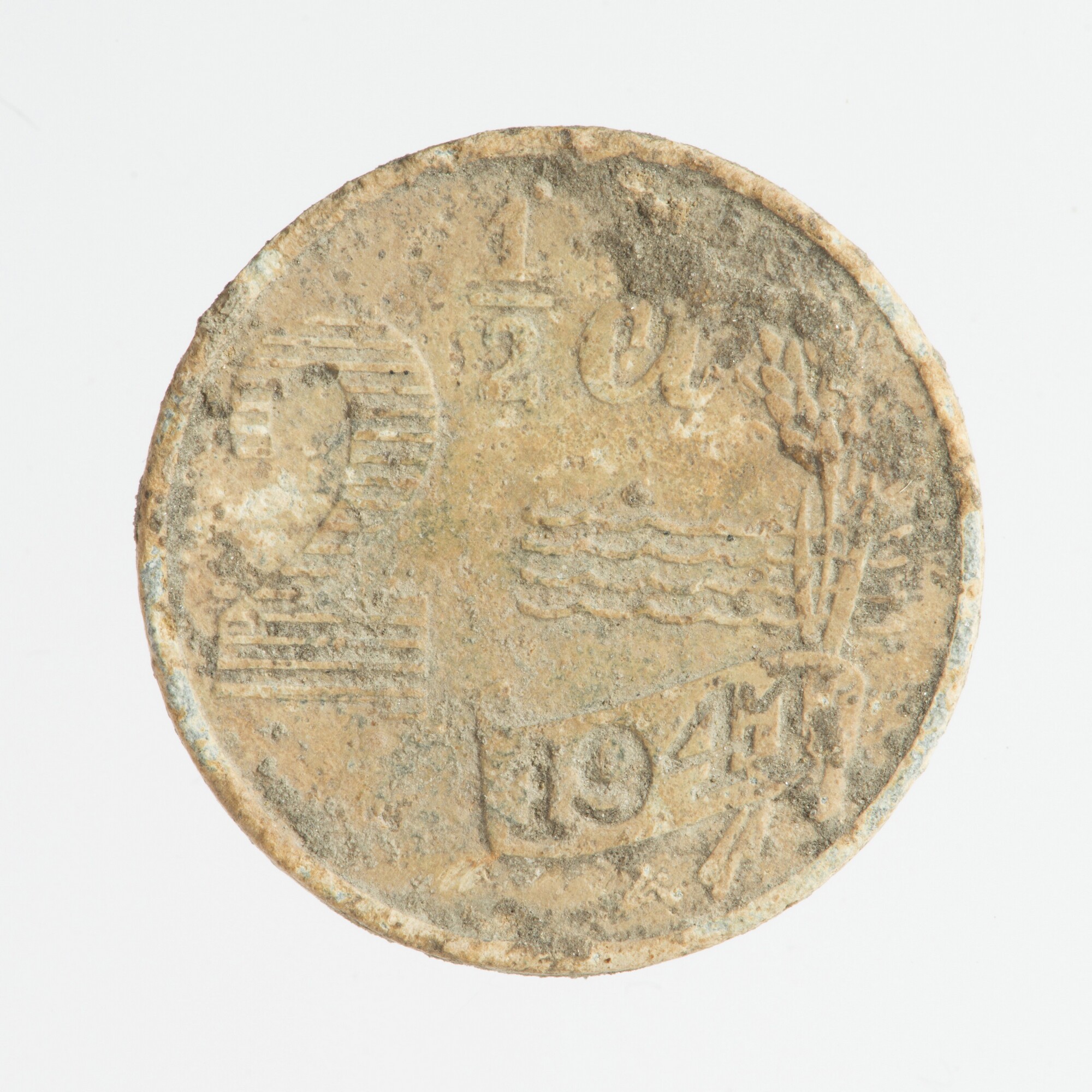 Tweeënhalve cent; Nederland Koninkrijk (1813-heden); Wilhelmina (1890-1948); vz.: Friese ûleboerd met omschrift: NEDERLAND; kz: opschrift: 2½ ct, met vier golven en twee korenaren, op een band het jaartal 1941; muntplaats: Utrecht; gewicht: 2.48 gram