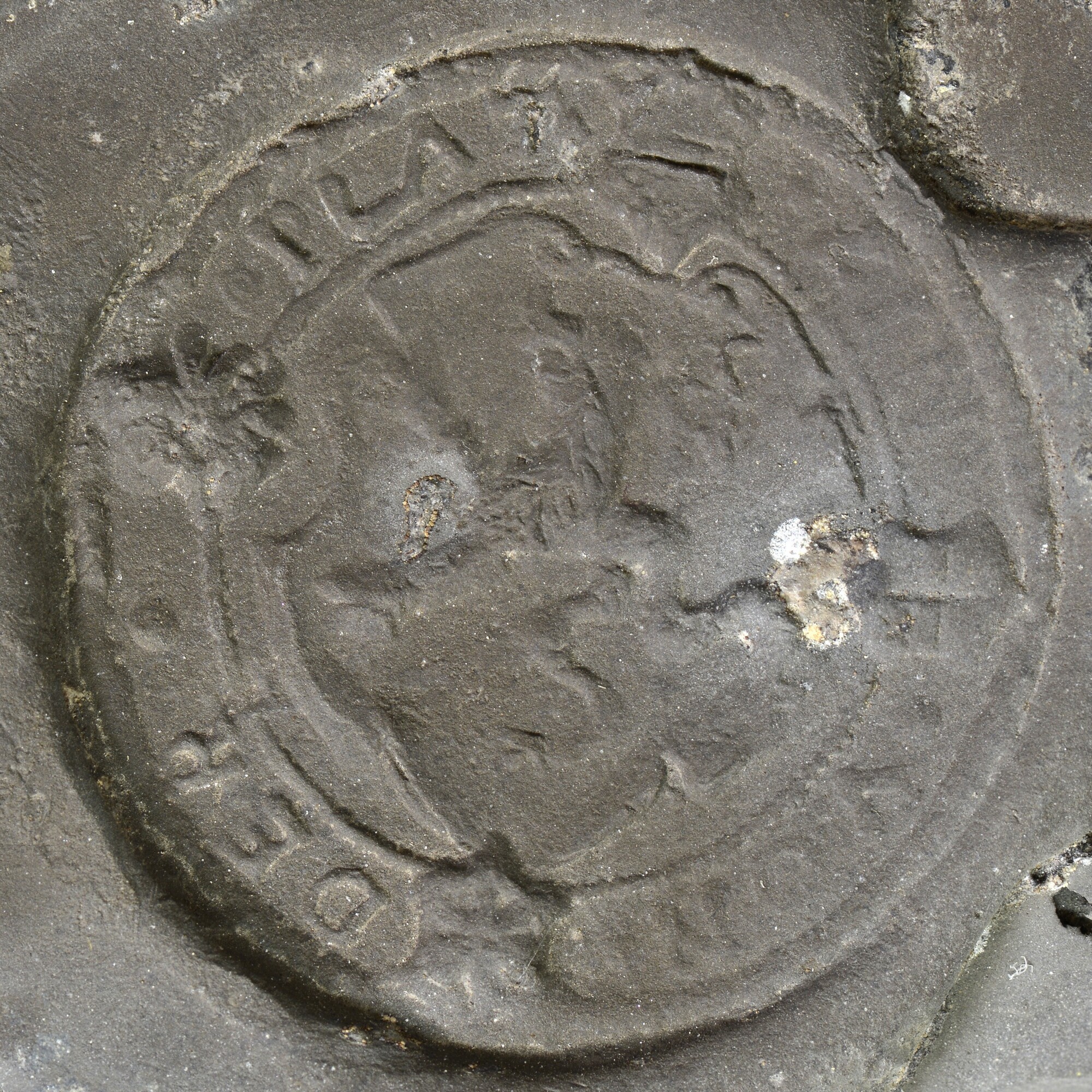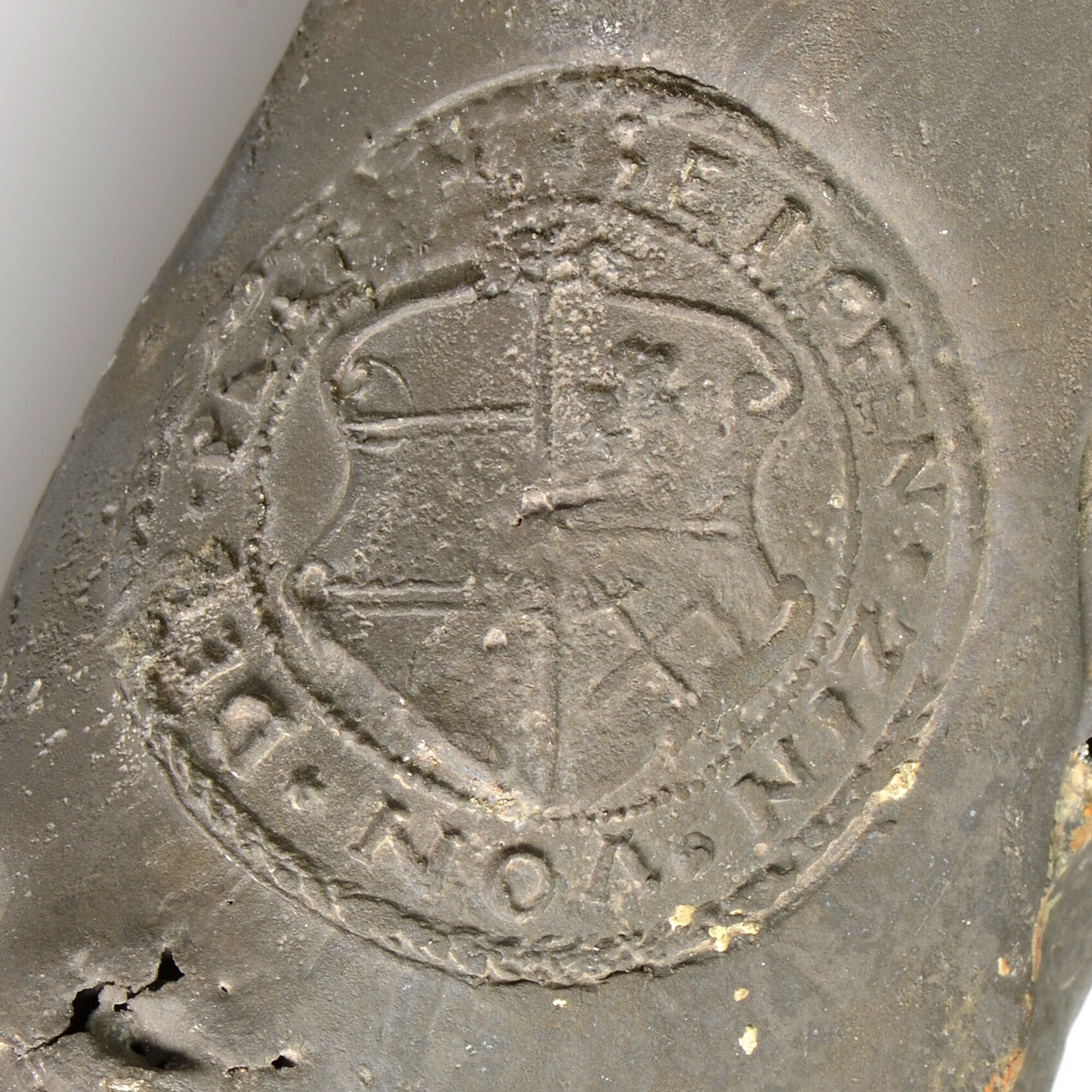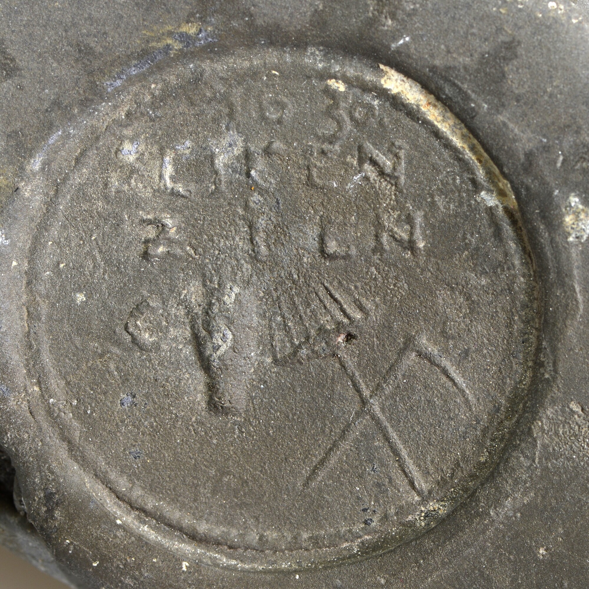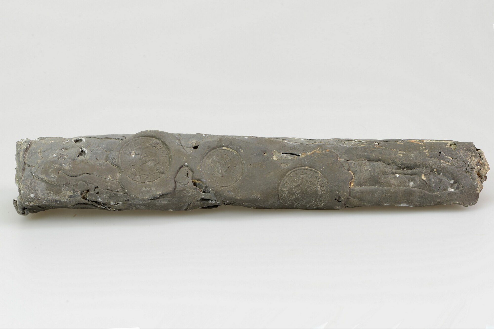 Tinrol; drie ronde stempels: 1) keurzegel met leeuw met omschrift "ZIN VON DER PLAT"; 2) opgeheven hand en werktuigen met initialen C L van de mijneigenaar, tekst "1630 SEIFEN ZIEN"; 3) wapenschild van de Tjechische stad Horní Blatná met omschrift "SEIFFEN ZIN VON DER PLATTEN"; herkomst: Bohemen; erts gedolven bij Seifen (Rýžovna), tin gesmolten bij ...