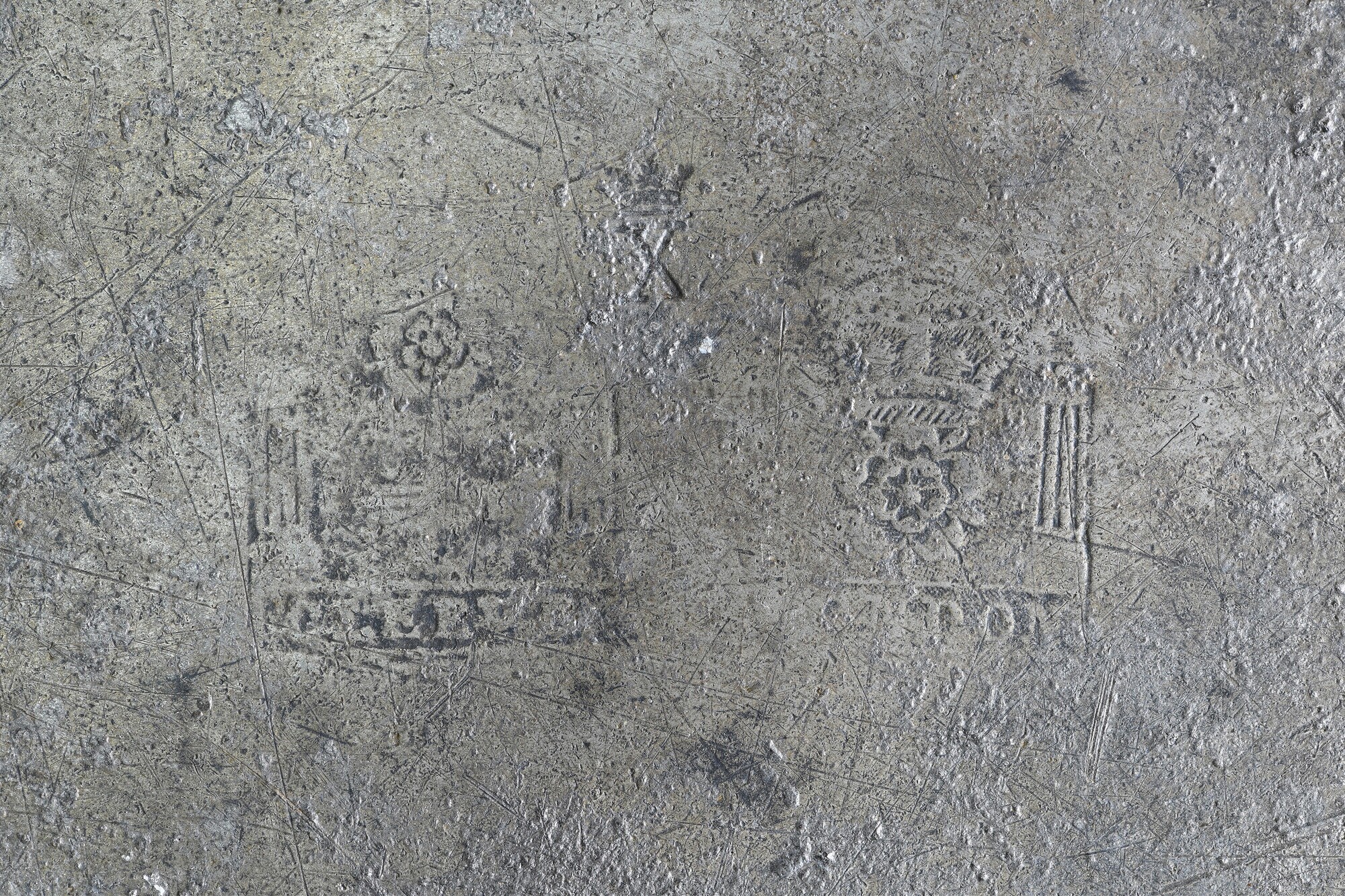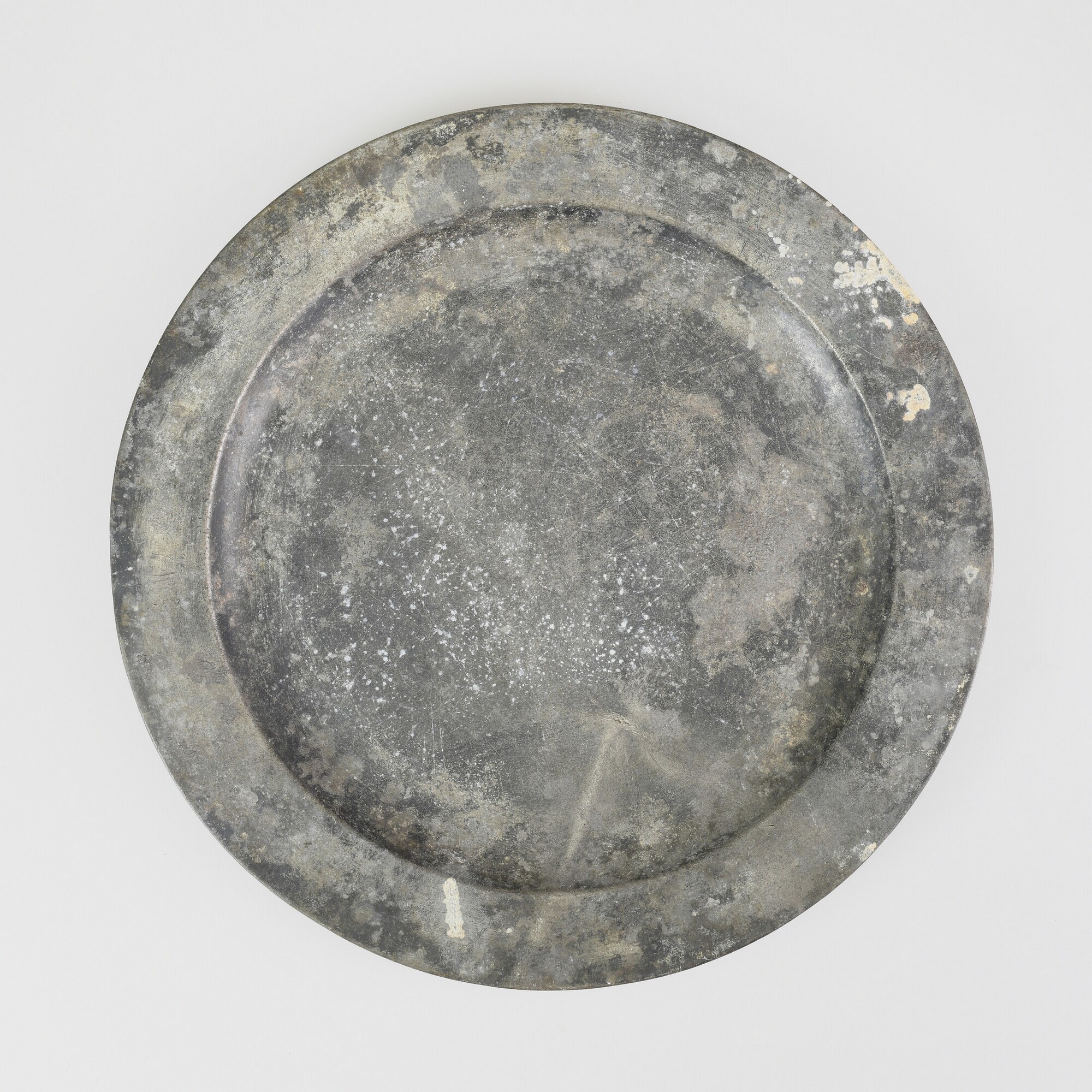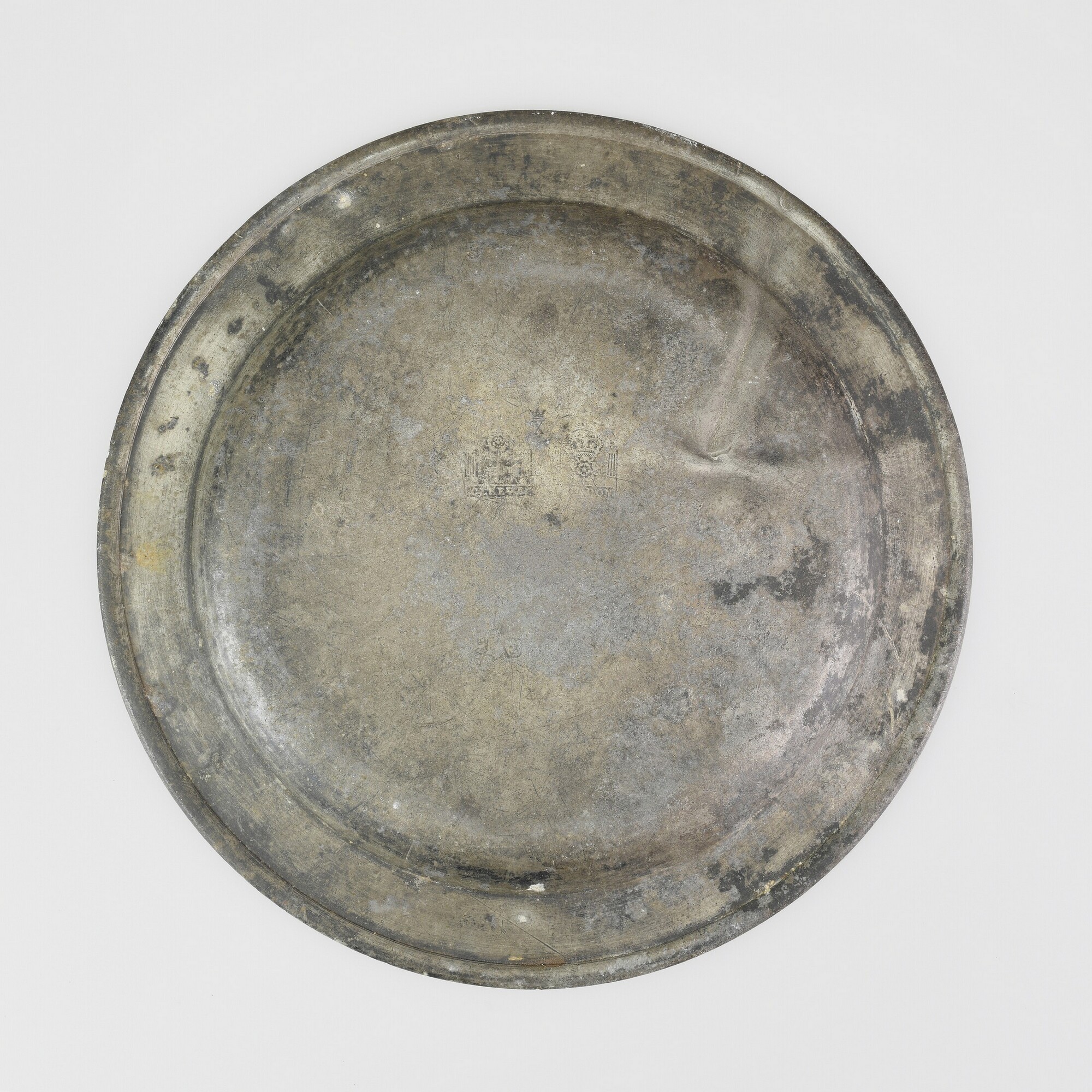 Bord/schotel; plat bord met vrijwel vlakke bodem; vier tinmerken: hand die een roos vasthoudt met daaronder de tekst 'CLEEVE' en gekroonde roos met daaronder de tekst 'LONDON'; boven deze twee merken een gekroonde X; onleesbaar merk; vervaardiger: Alexander Cleeve, Londen, vermeld 1715, of Bou(r)chier Cleeve, Londen, vermeld in 1736, of Bou(r)chier & Richard Cleeve, vermeld ...