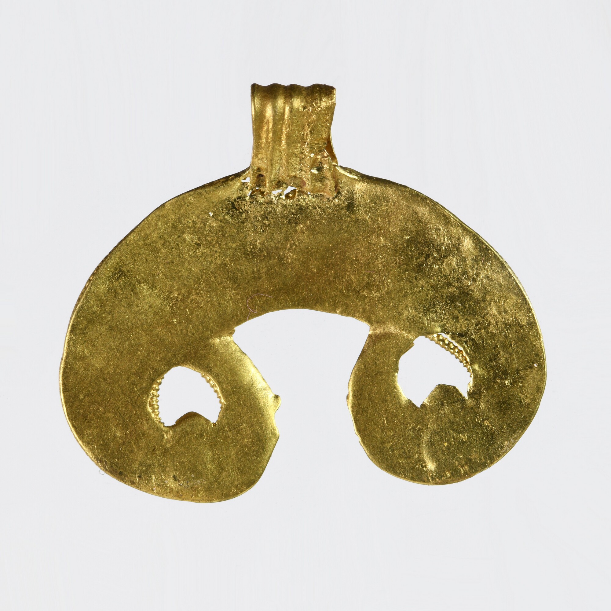 Hanger; niervormig met twee naar elkaar toe gebogen vogelkoppen; hartvormige openingen; filigrainversiering: cirkels en parelrand; lintvormig ophangoog met vier verticale ribbels; achterzijde vlak; gewicht: 1.56 gram
