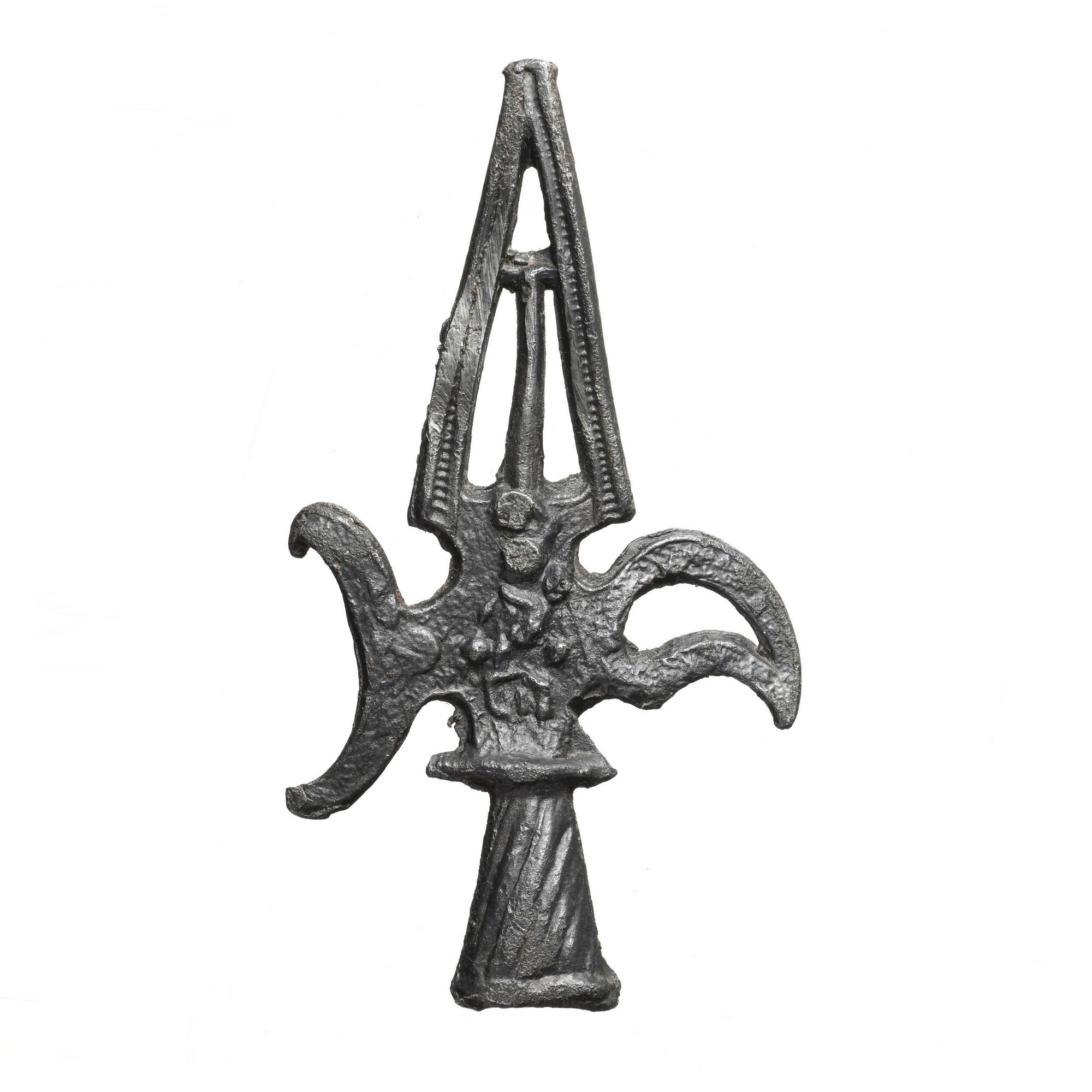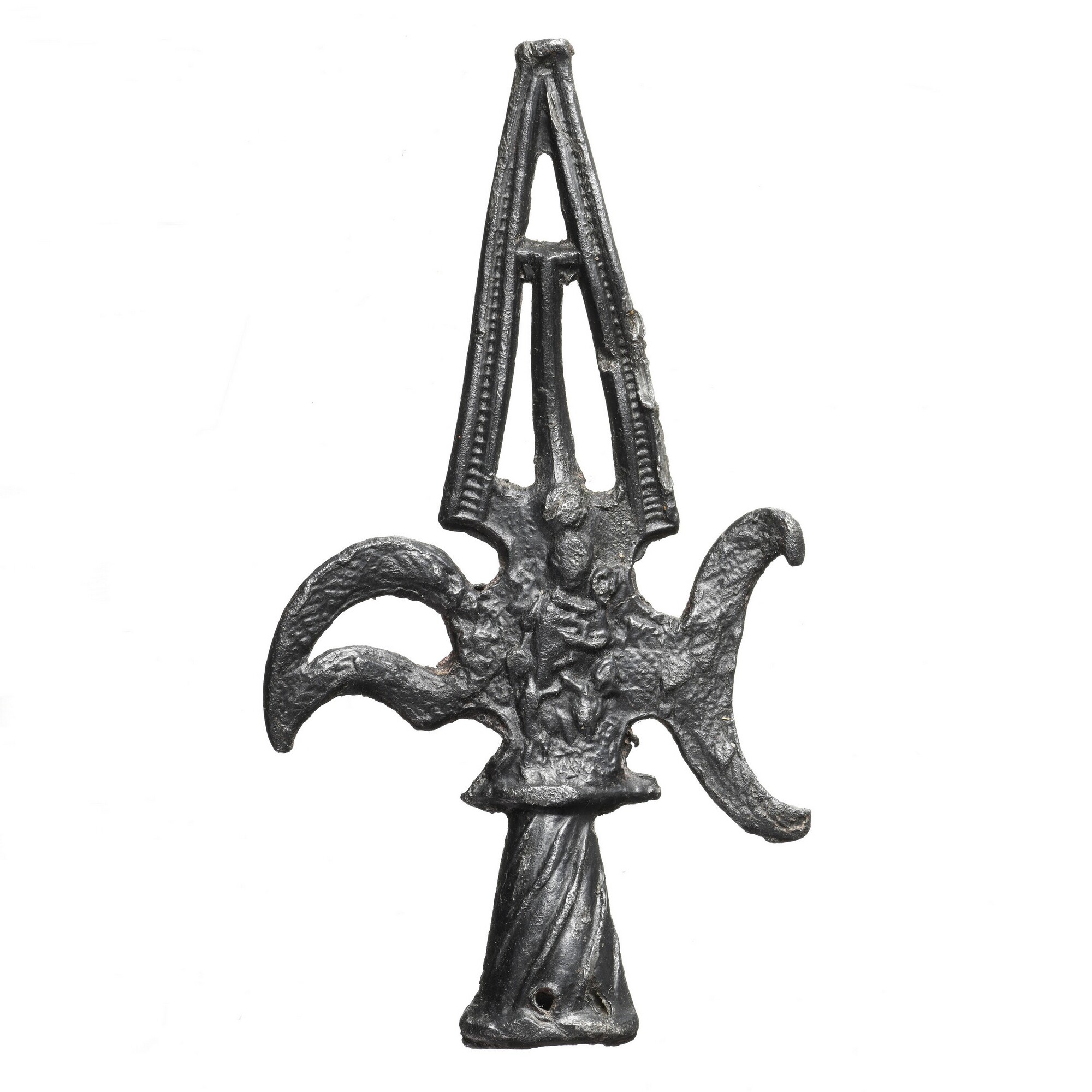 Hellebaard, miniatuur; versierd met figuren aan beide zijden; Charitas; vondstomstandigheden: Westerdijk, Hoorn, tussen Park Schouwburg en Visserseiland, stortvondst