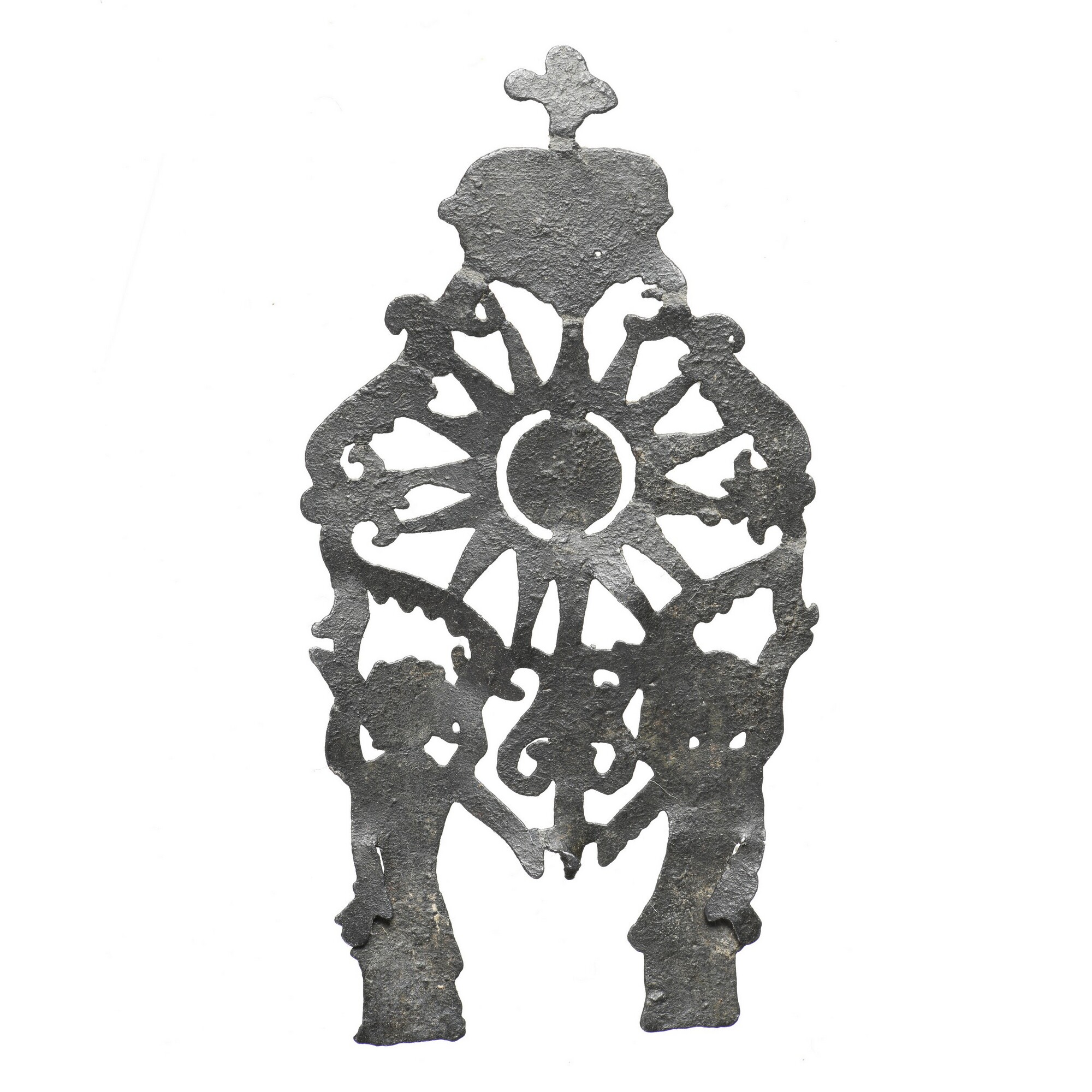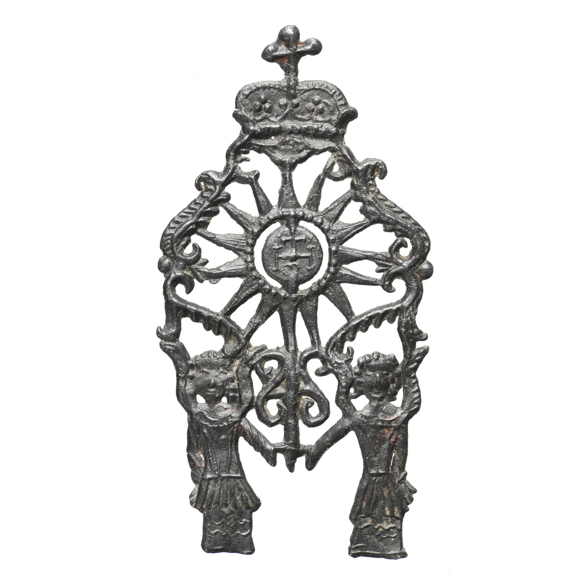 Insigne; twee engelen die een gekroonde monstrans vasthouden; in de monstrans een hostie met IHS-monogram omgeven door sterrenkrans; op enkele plekjes resten van rode verf; vondstomstandigheden: Westerdijk, Hoorn, tussen Park Schouwburg en Visserseiland, stortvondst