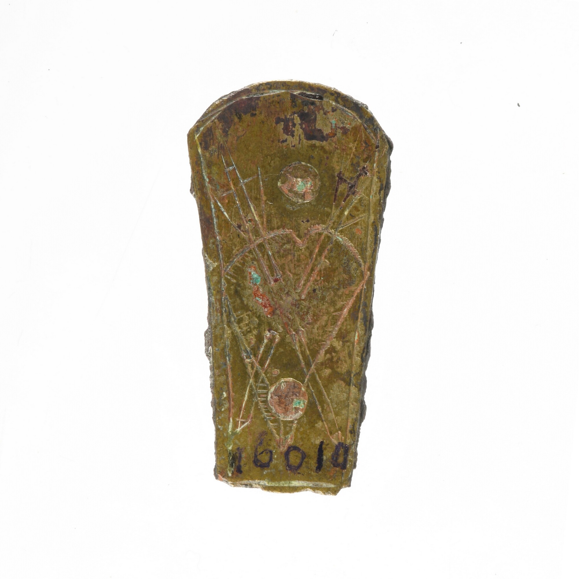 Mesheftbekroning; twee plaatjes van messing, bevestigd met twee nagels van koperlegering; resten van het ijzeren lemmet ertussen; gegraveerde versiering: voorzijde: Maria met kroon, stralenkrans en lang haar, met kind Jezus in haar armen; keerzijde: hart doorboord door twee gevederde pijlen