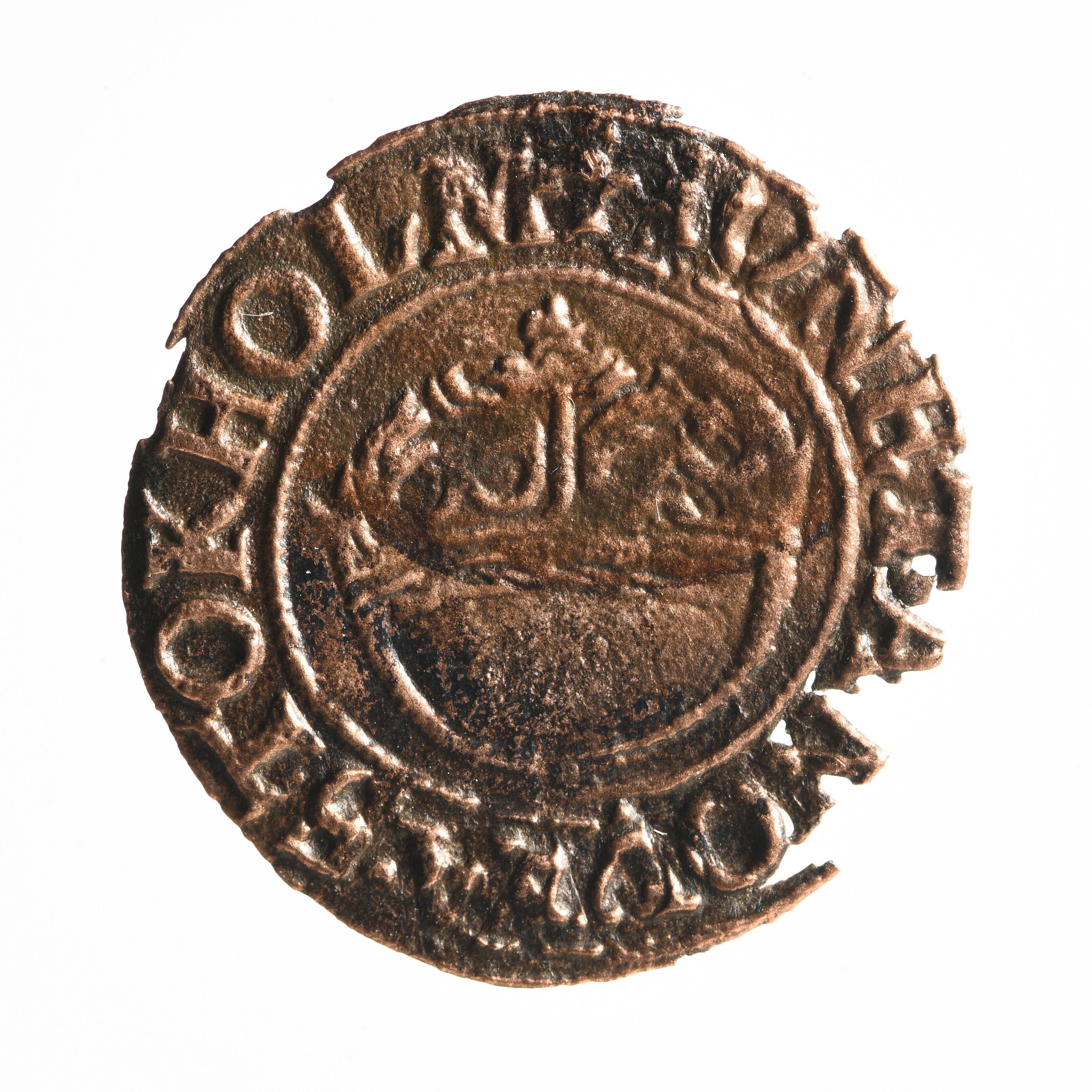 Halve öre; Koninkrijk Zweden (1523-1814); Johan III (1568-1592); vz.: gekroonde •I•R•; omschrift: +IOHANN•Z•DG•REX•SVECI•74; kz.: kroon; omschrift: +MONETA•NOVA•STOKHOLM; muntplaats: Stockholm; gewicht: 0.86 gram.