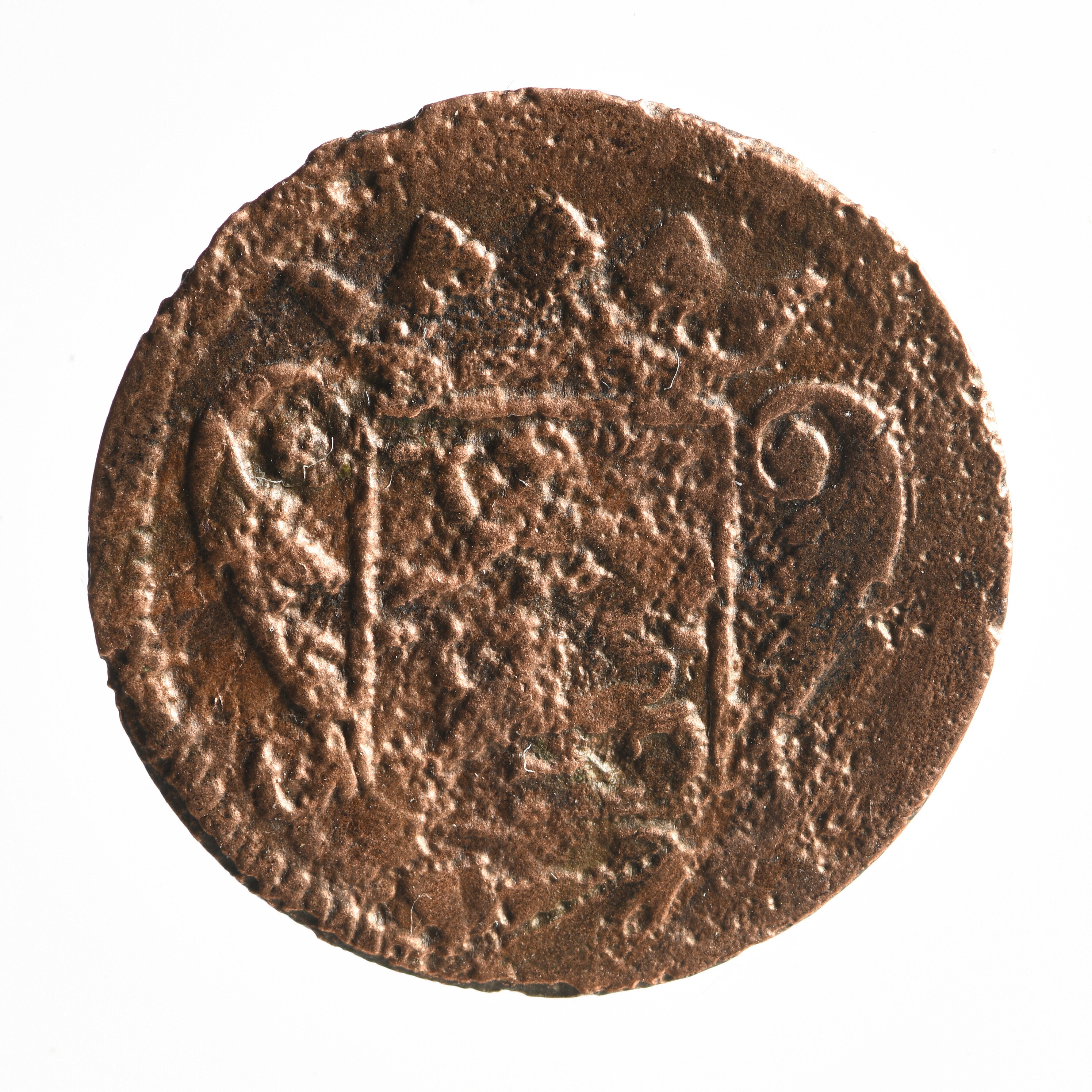 Duit; Friesland Provincie (1581-1795); vz.: in vier regels: muntteken klimmende leeuw tussen twee bladornamenten / [FRI]SIA / (rozet) 1702 (rozet) / bladornament (rozet) bladornament; kz.: met open kroon gekroond wapenschild van Friesland met ter weerszijden naar boven krullende bladornamenten; muntplaats: Leeuwarden; gewicht: 2.44 gram.