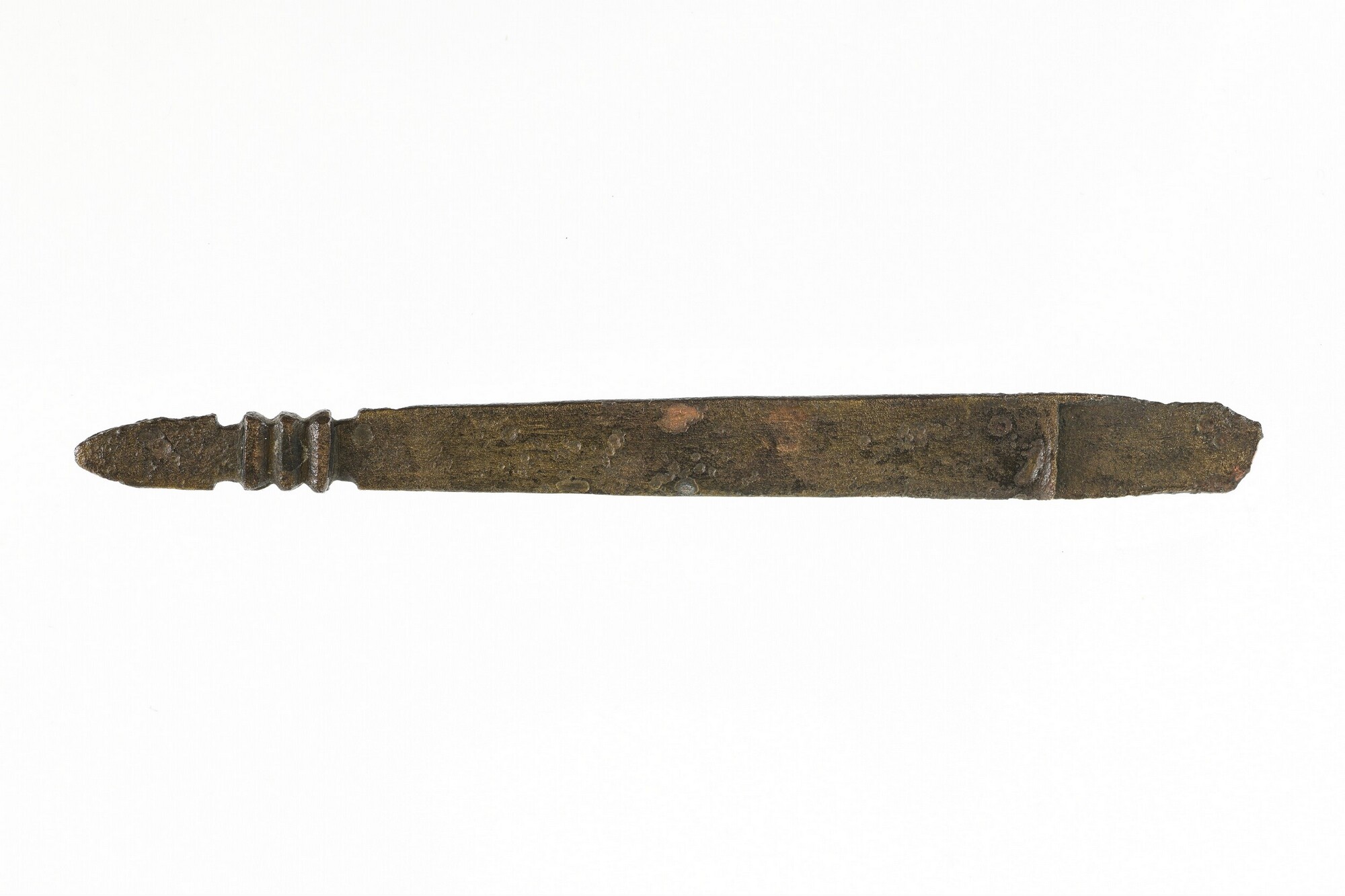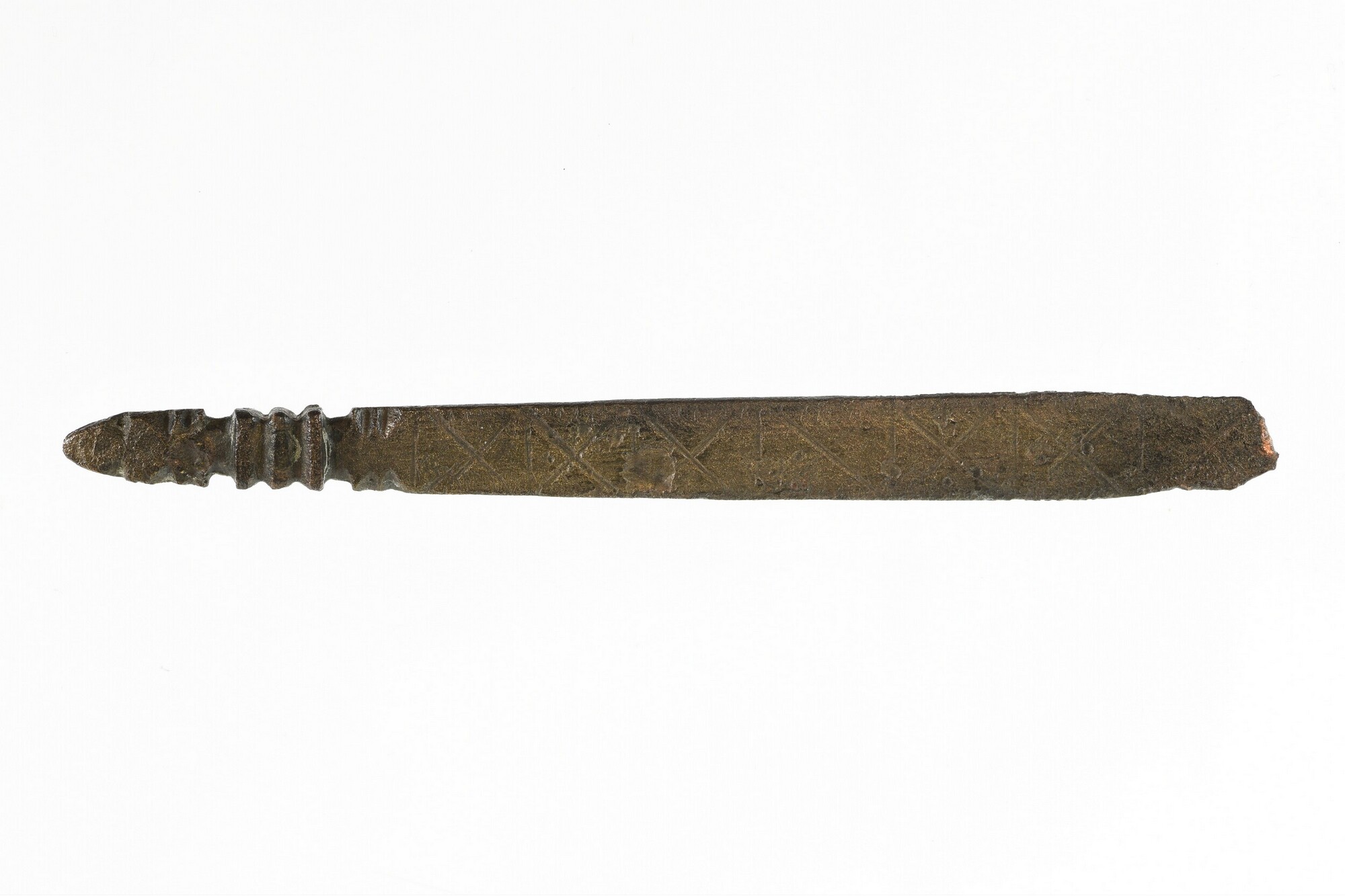 Riemtong; geprofileerd uiteinde; gegraveerde kruisversiering; gewicht: 9.68 gram