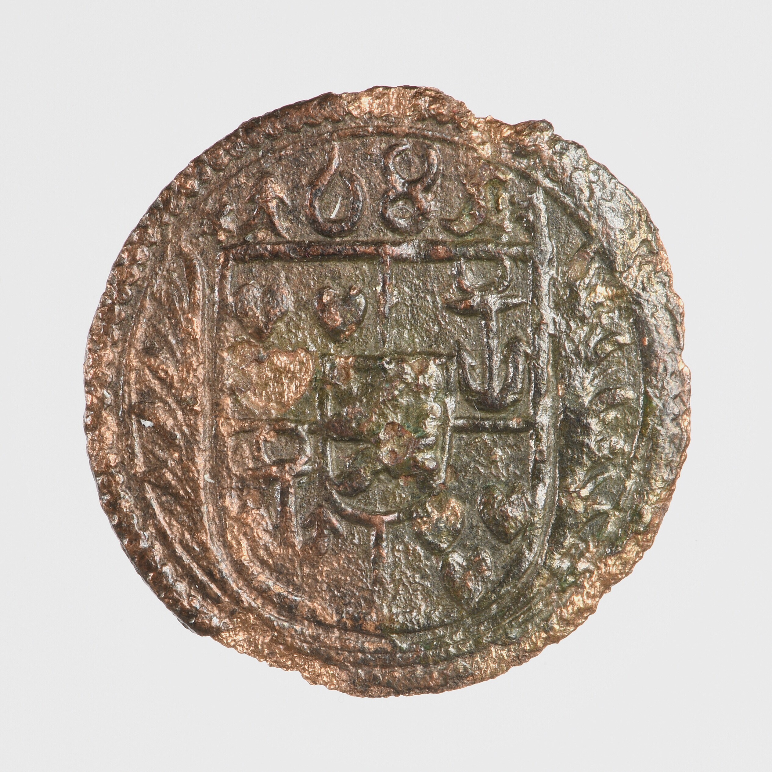 1 Pfennig; Graafschap Bentheim-Tecklenburg-Rheda (1606-1806); Johann Adolph (1674-1704); vz.: wapenschild tussen twee palmtakken met daarboven 1685; kz.: palmtakken met daartussen opschrift: 1 met •*• erboven / G•T•P; muntplaats: Kallmünz; muntmeester: Georg Thomas Pauer; gewicht: 0.84 gram
