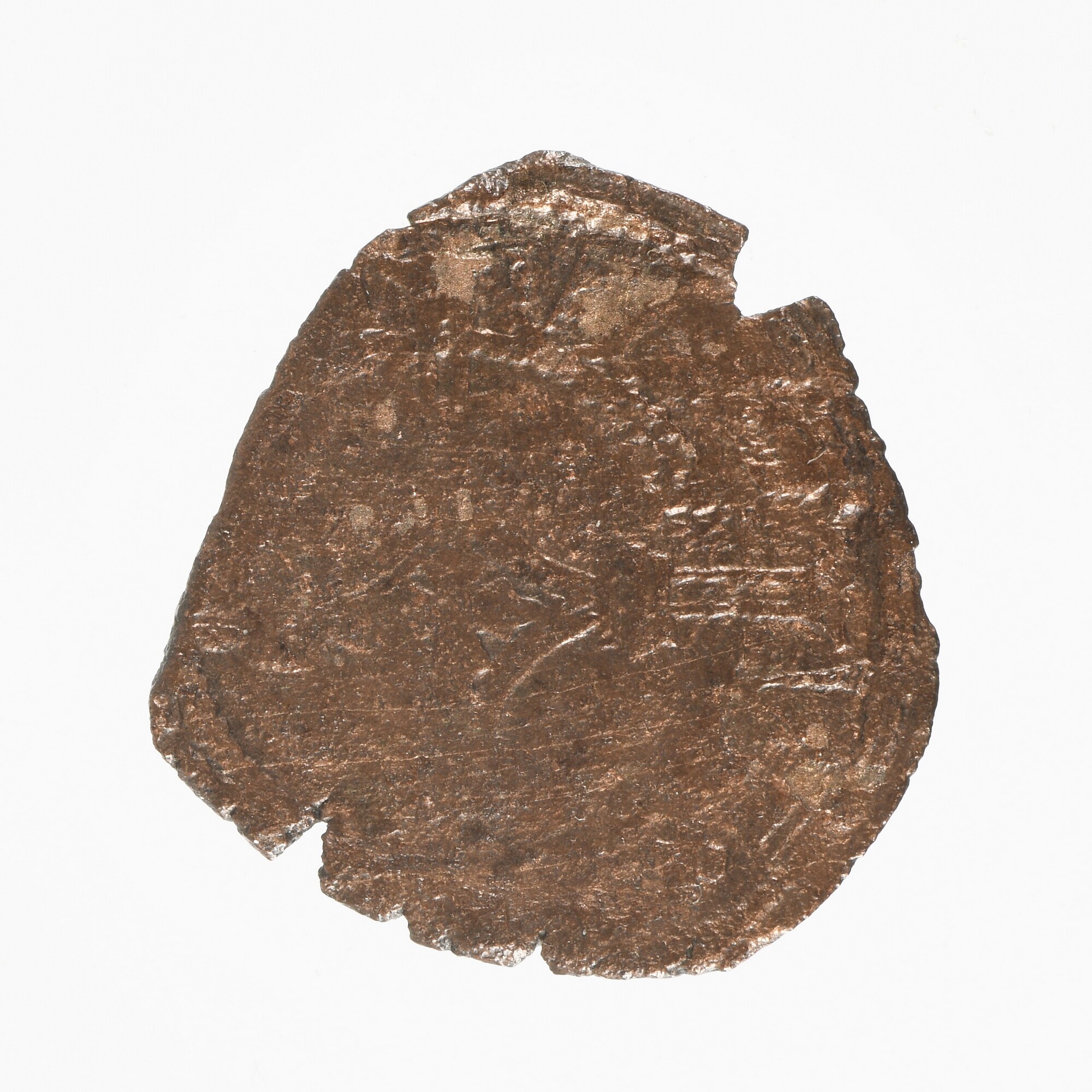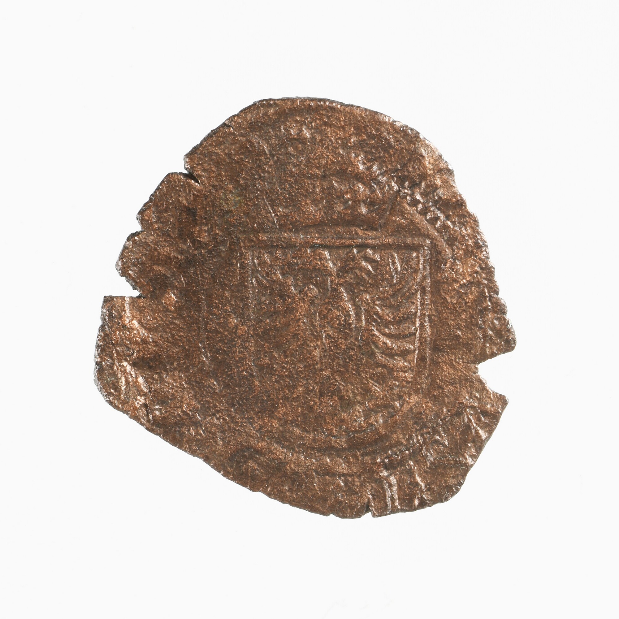 Hollandse penning; Holland Graafschap (1049-1581); Karel V (1506-1555); vz.: gekroond wapenschild met dubbelkoppige adelaar met omschrift (rozet) [KAROL]VS+D+[G+RO]M+IMP(ET)[+H]; kz.: dubbellijnig gevoet kruis met rozet in het hart met omschrift onleesbaar; muntplaats: Dordrecht; gewicht: 0.69 gram