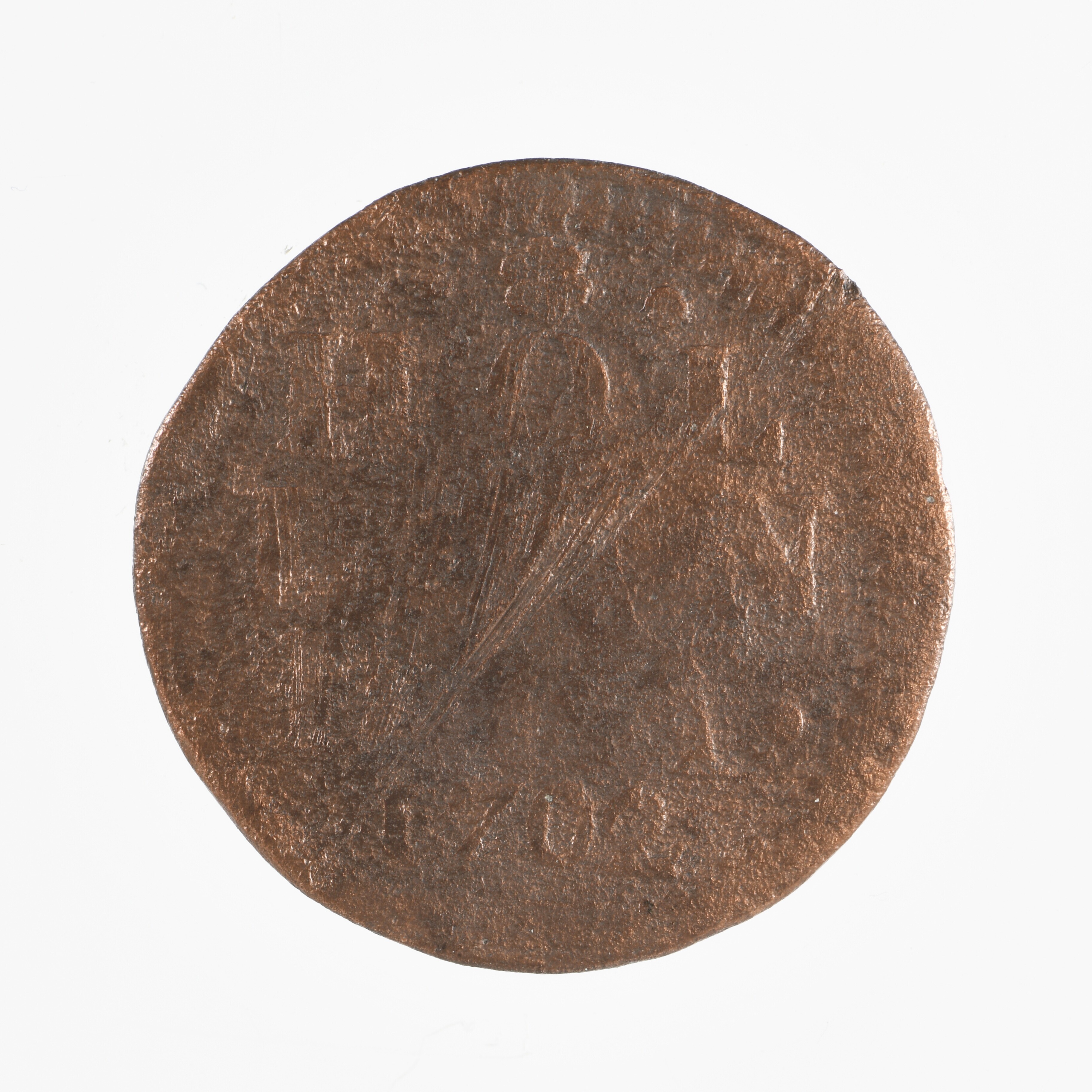 Duit; Holland Provincie (1581-1795); vz.: in vijf regels: • (rozet) • / HOL / LAN / DIA • / 1702; kz.: klimmende leeuw naar links met lans en vrijheidshoed binnen een gesloten Hollandse tuin; muntplaats: Dordrecht; gewicht: 3.02 gram