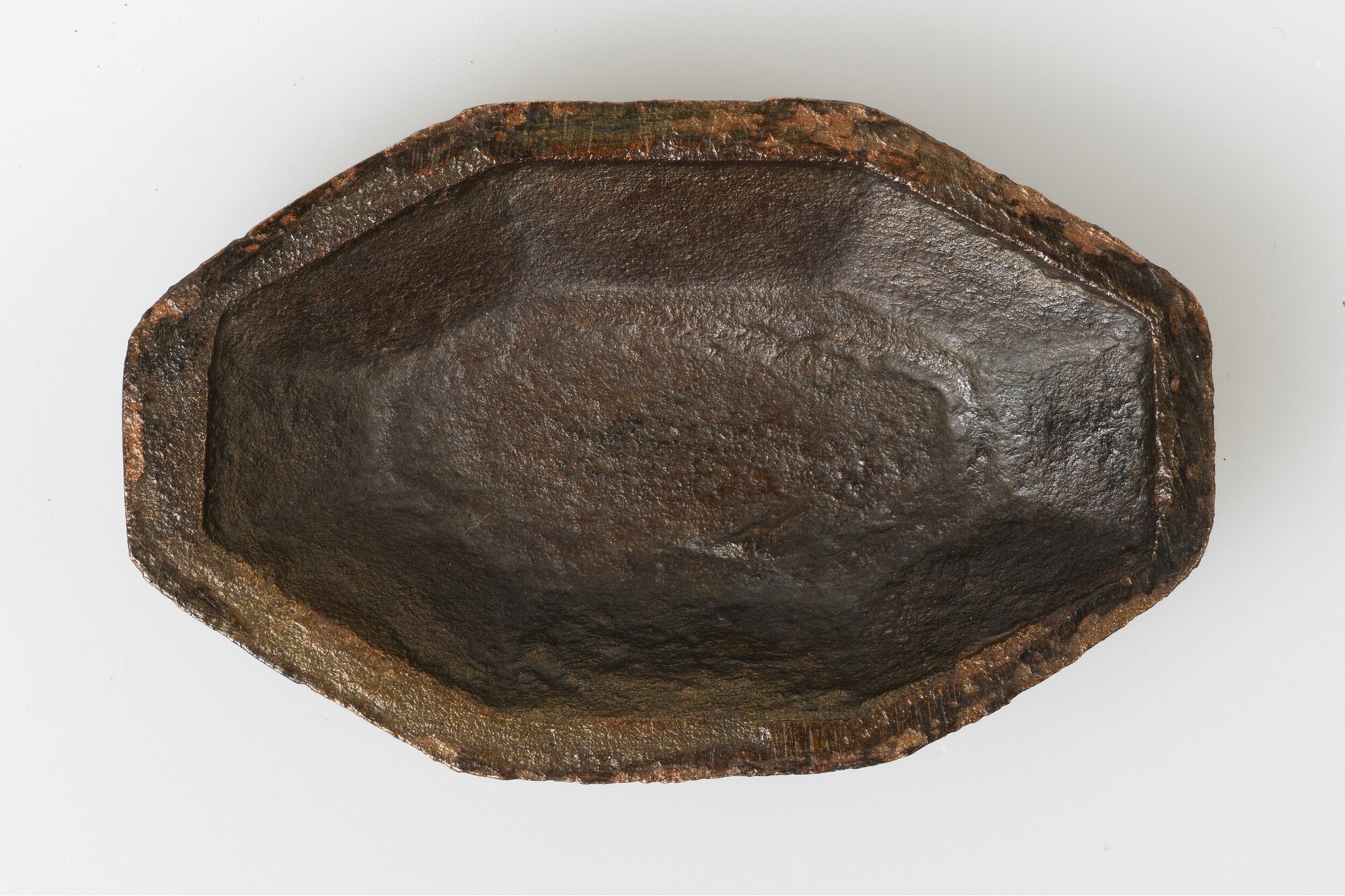 Deksel van tabaksdoos; achthoekige bovenzijde; centraal vlak versierd met een verdiept reliëf van een vogel omringd door bladmotieven; omringende vlakken versierd met een verdiept reliëf van bladmotieven; de rand is versierd met een zigzaglijn; de onderzijde en het scharnier ontbreken; oorspronkelijk ingelegd met email door middel van champlevé-techniek