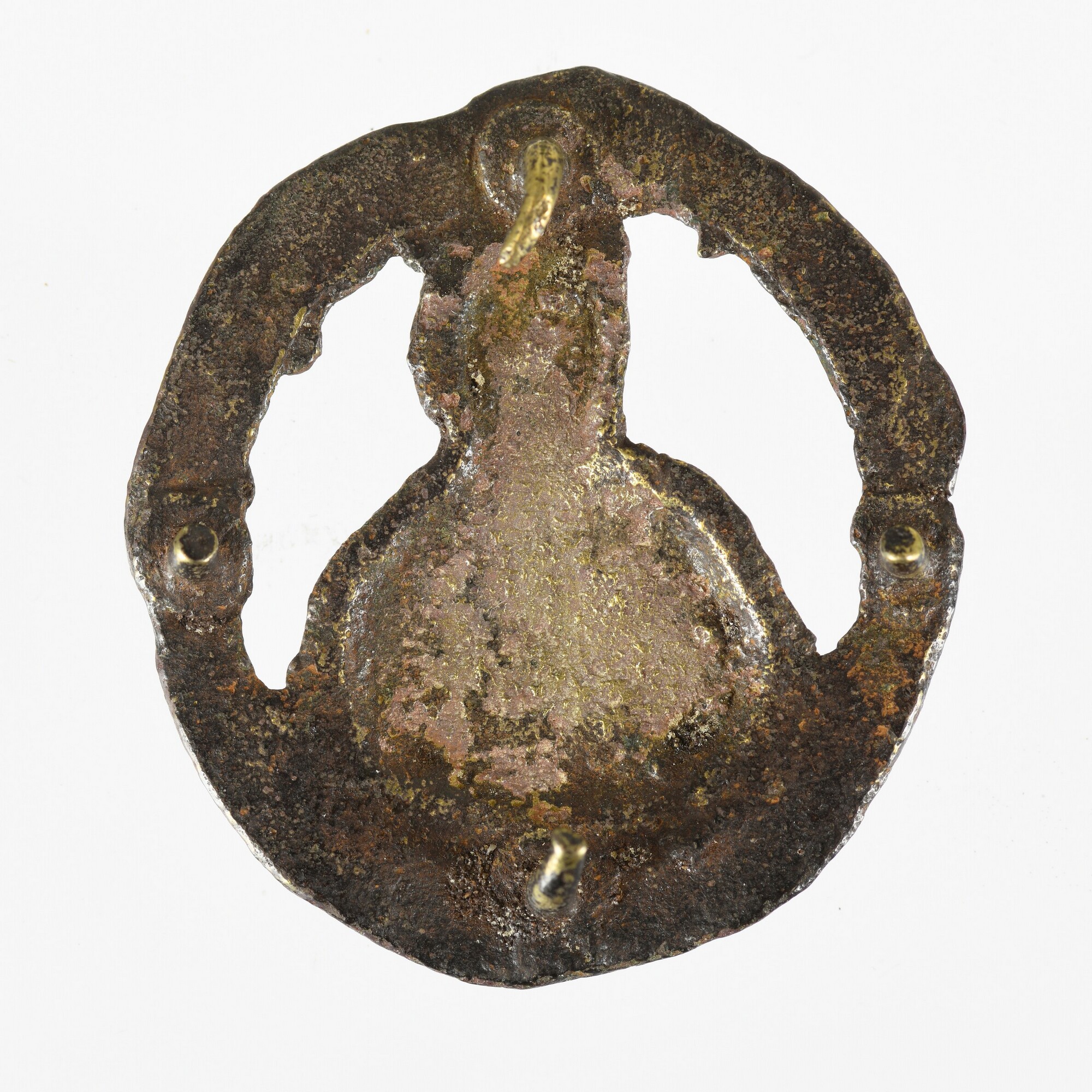 Insigne; ring met daarin de buste van een vrouwelijke heilige, vermoedelijk Sint Agatha; achterzijde hol; vier bevestigingshaakjes aan de achterzijde; vondstdatum: 11-3-2020