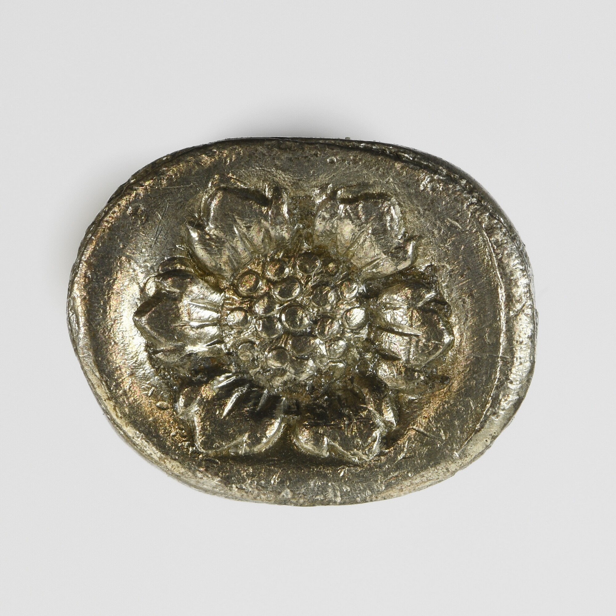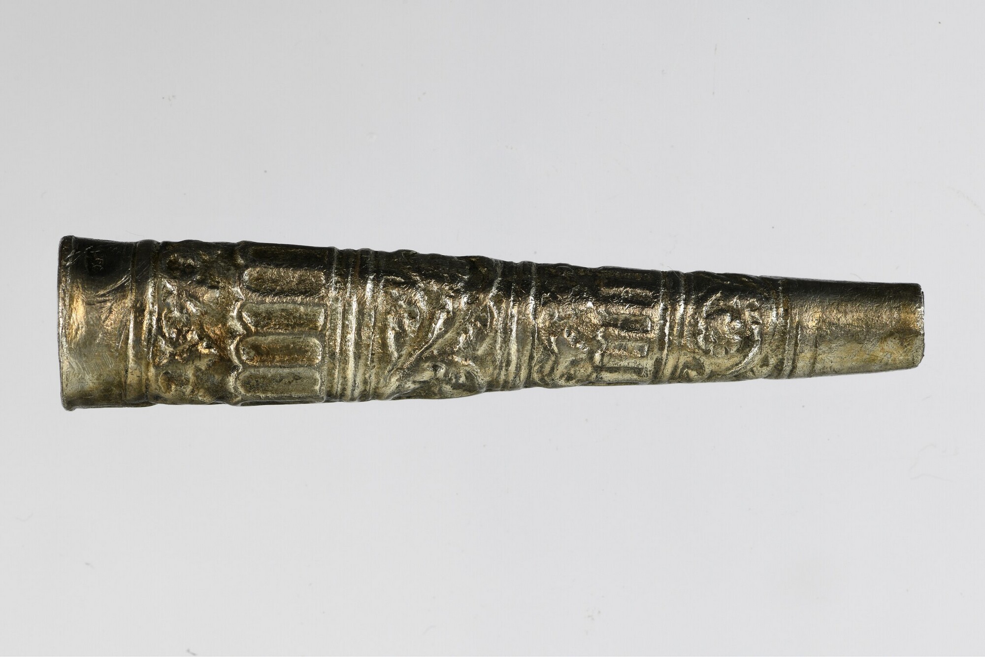 Mesheft; fruitmesje?; vier banden van florale en ovale 'ramen' gescheiden door horizontale banden; mesheftbekroning met bloem- of kaardebolversiering; ijzeren lemmet binnenin aanwezig; naad aanwezig; twee keurmerken: stadswapen van Amsterdam en meesterteken (H? ?).