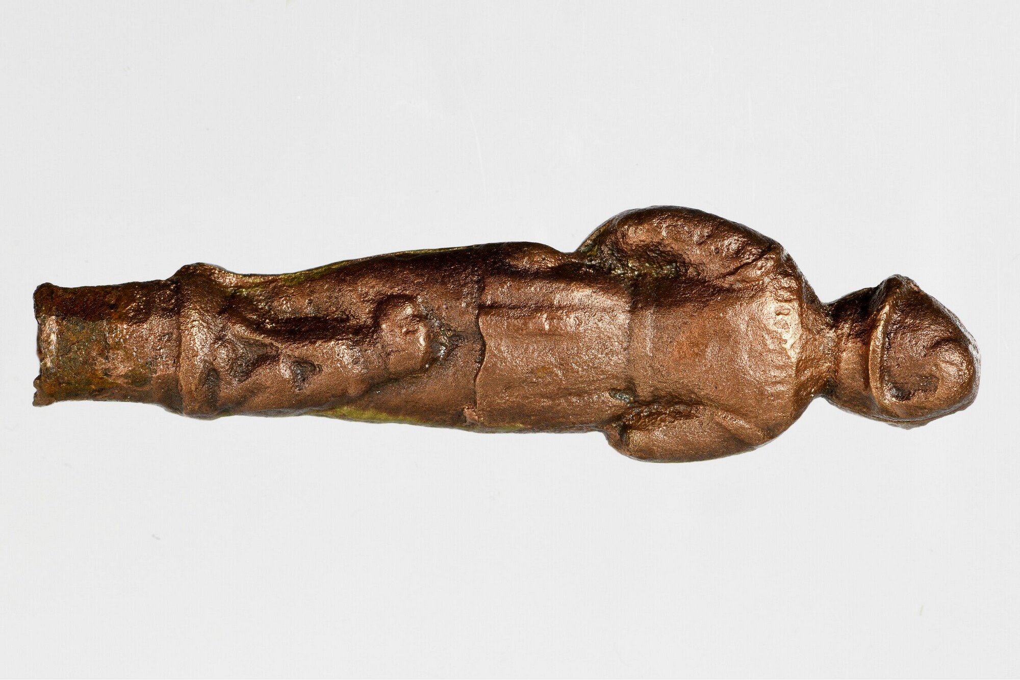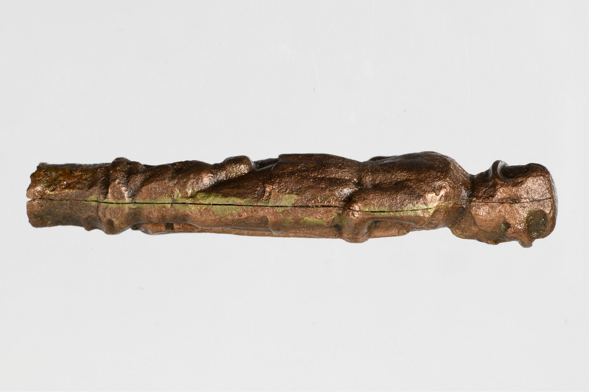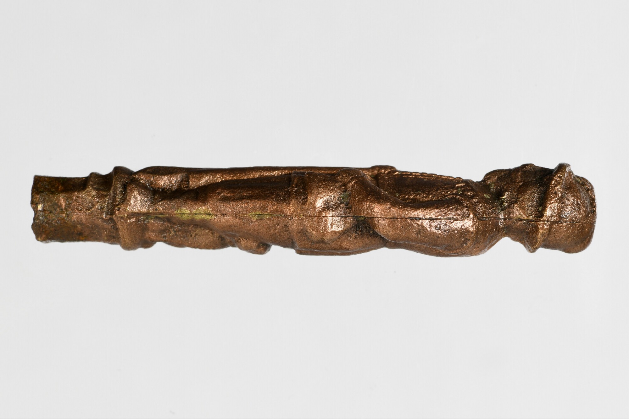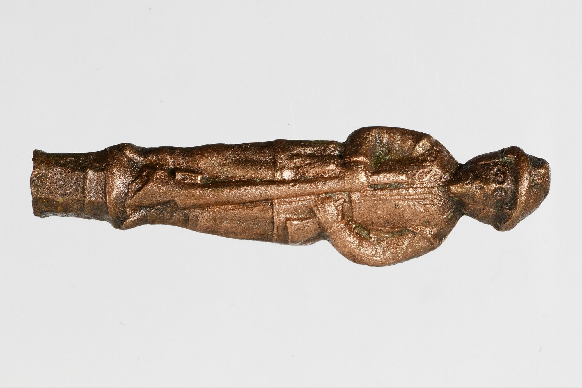 Mesheft; in de vorm van een jager met hond; naad door het gehele midden