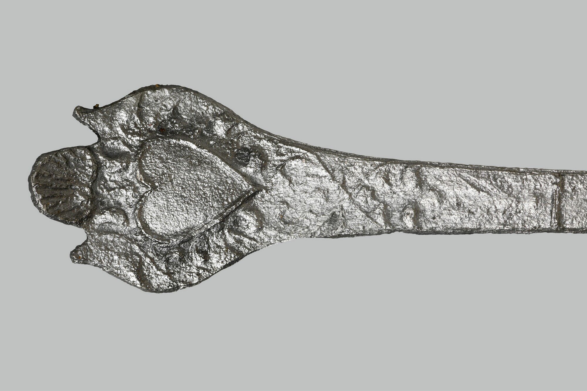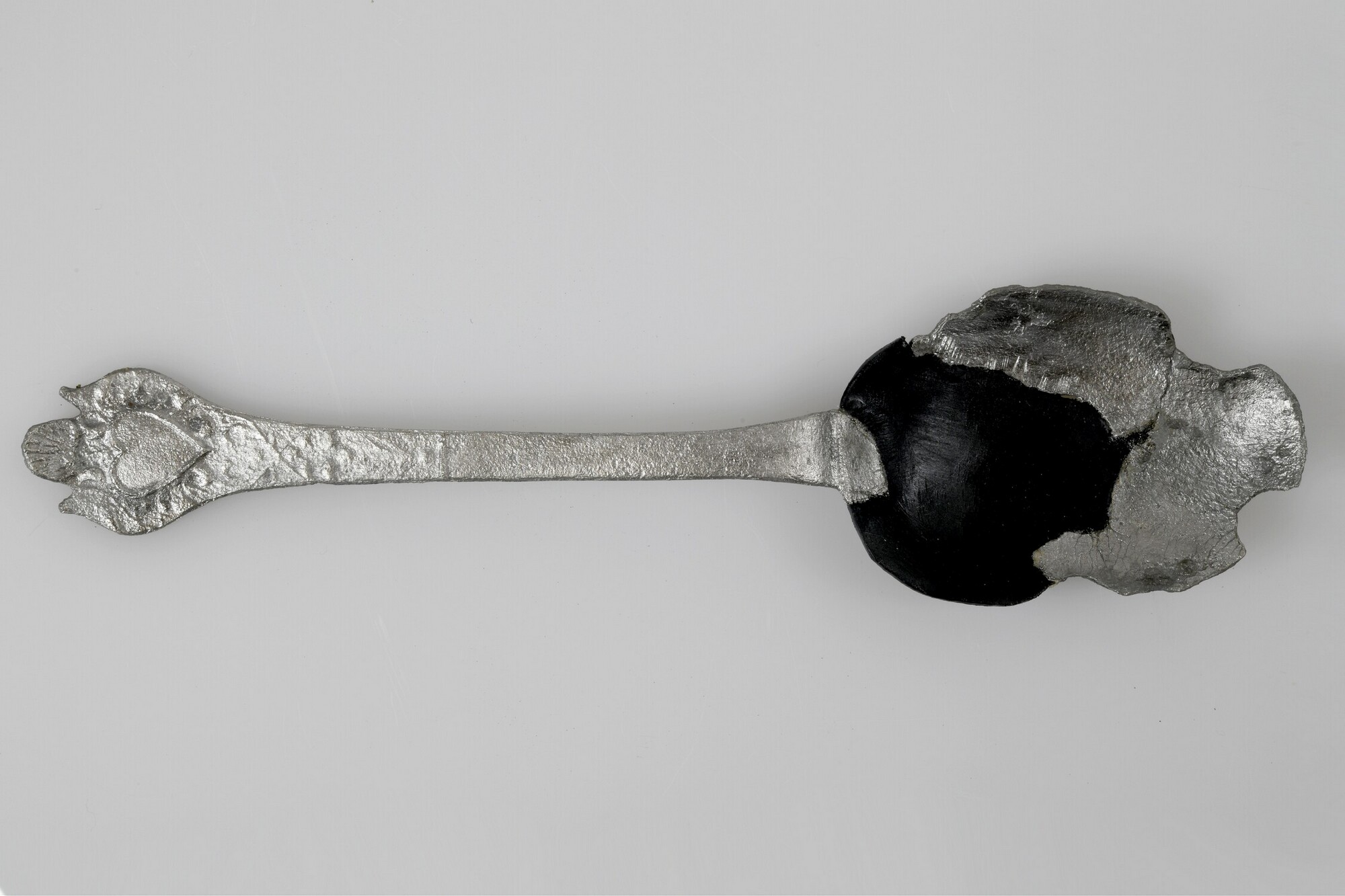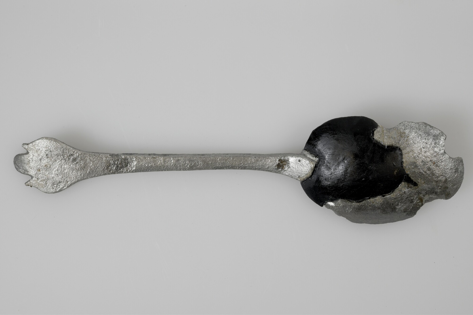 Lepel; langwerpige ovale bak en platte steel die eindigd in een pied de biche (breekijzer-vorm); laatste helft steel gedecoreerd met hart en florale motieven