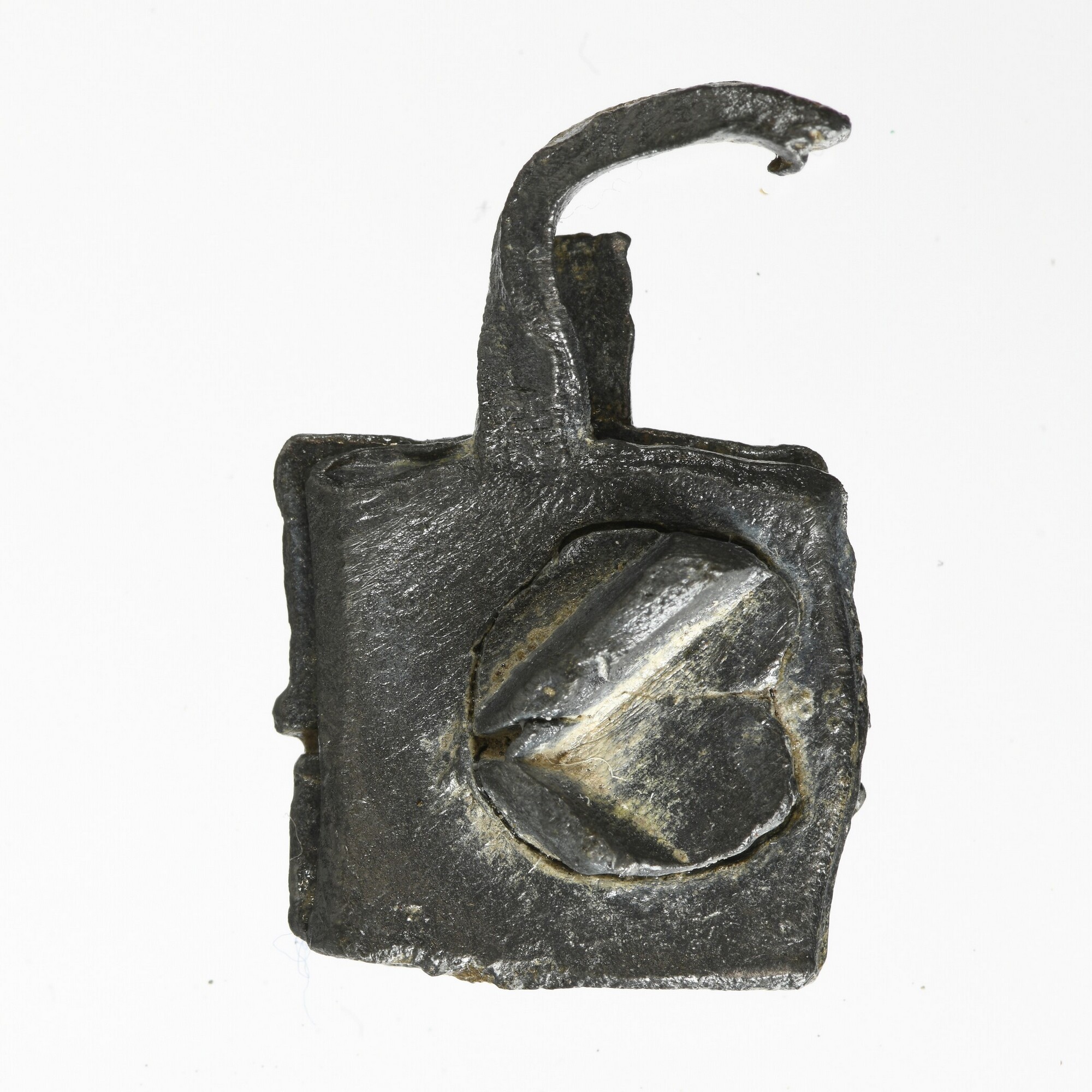 Haringnetlood; vierkant; vz.: twee rechthoekige zandloper met kruisen boven en een rechthoekige zandloper met kruis en aan weerszijden S - D onder; kz.: letter (A?); herkomst: Schiedam