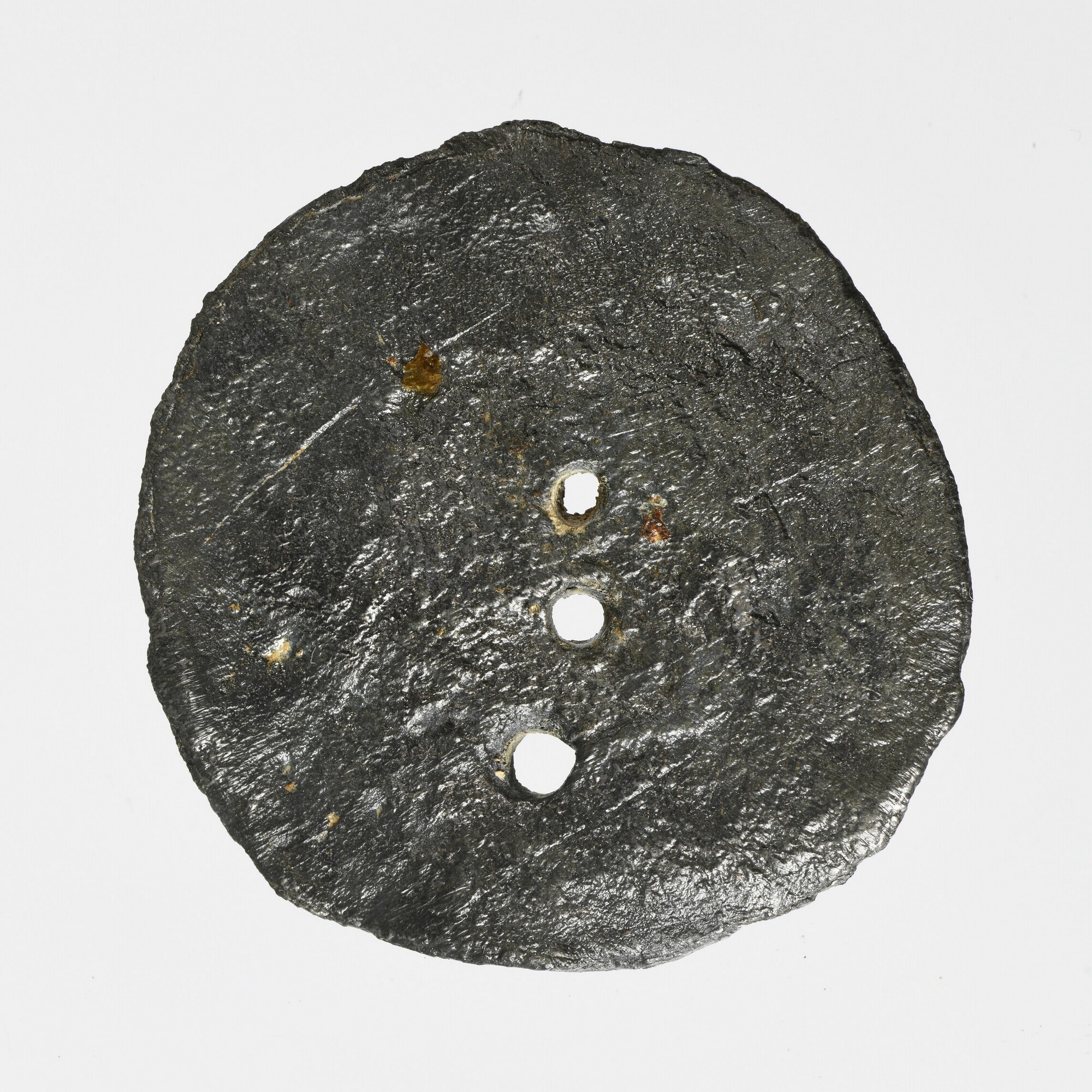 Snorrebot; ronde schijf met drie perforaties; hergebruikt zegellood