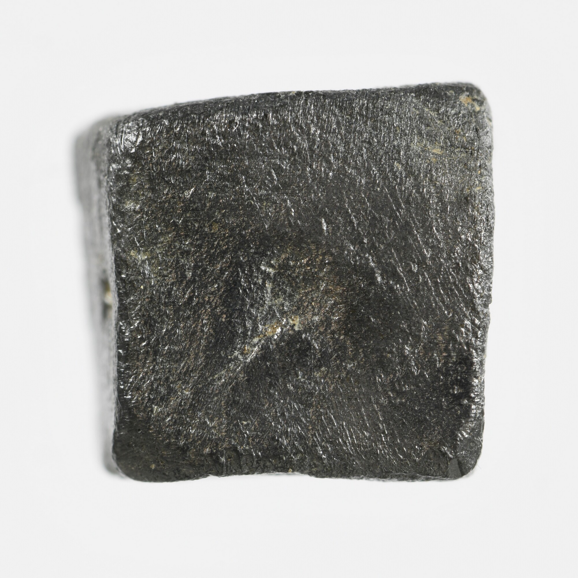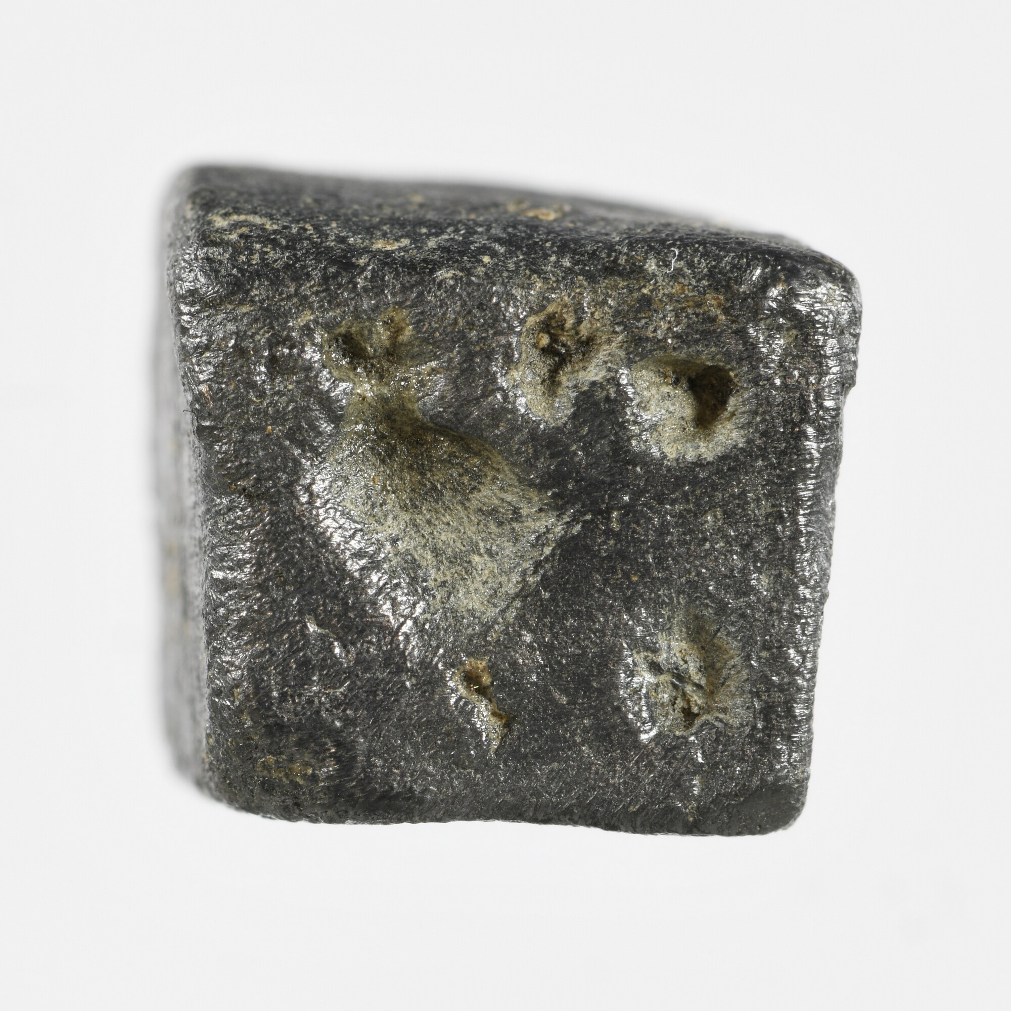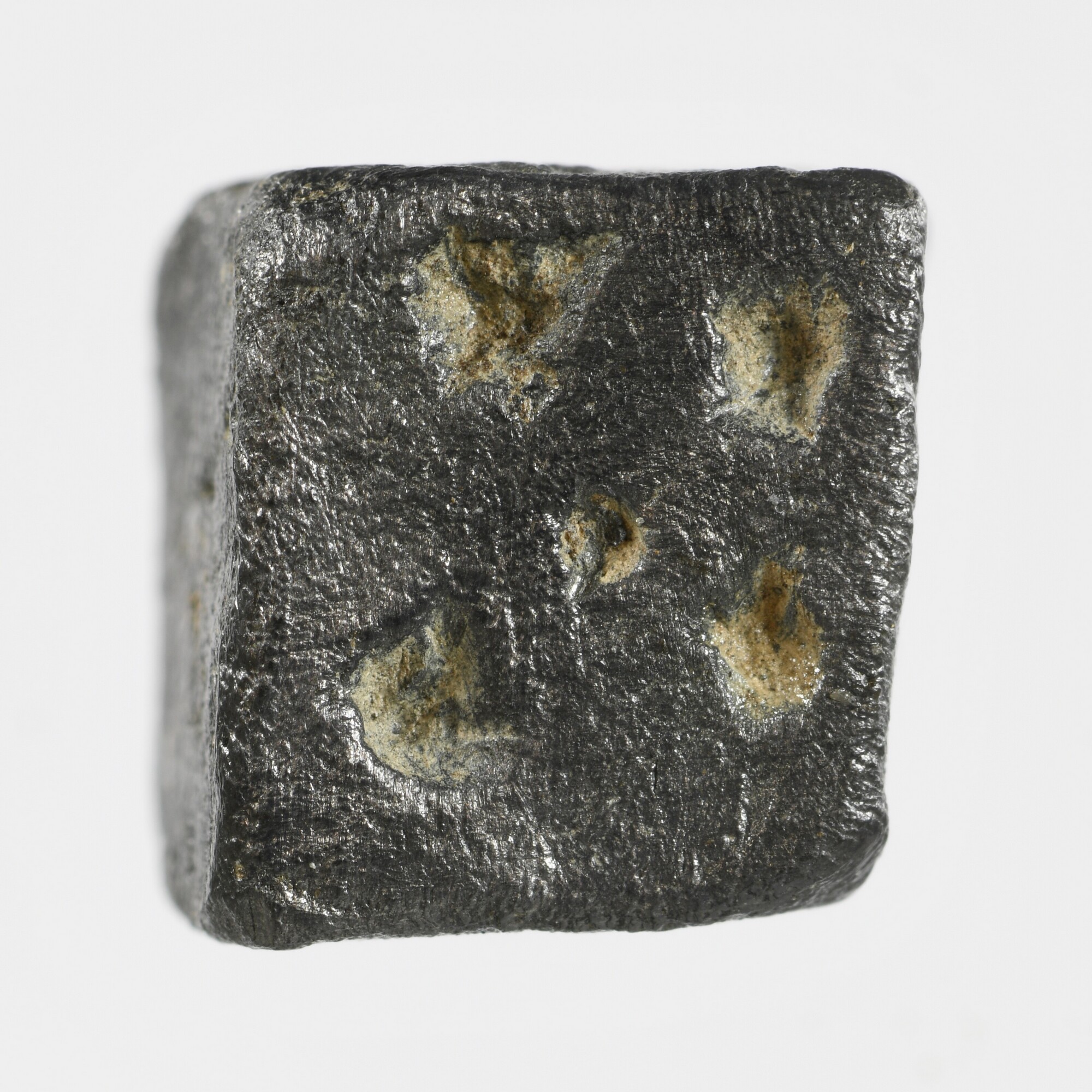 Dobbelsteen; vierkant onevige dobbelsteen; enkel de zijden met vijf en zes zijn duideljik zichtbaar; mogelijk zijn de een en twee ook aanwezig, maar dit kunnen ook oppervlaktebeschadigingen zijn; gewicht: 12.79 gram
