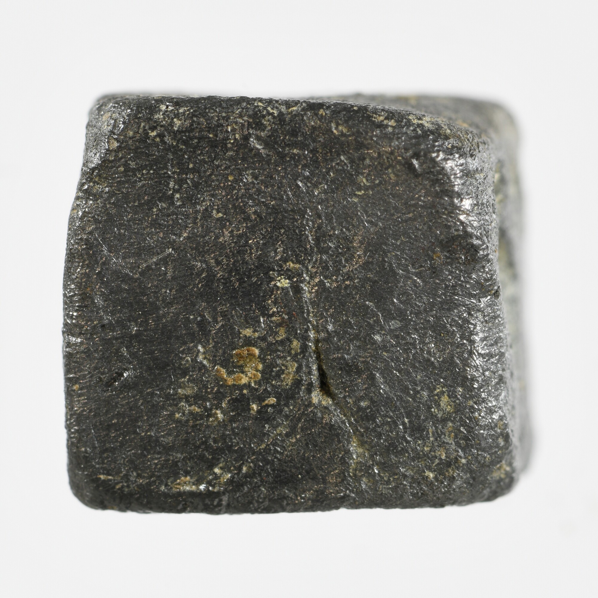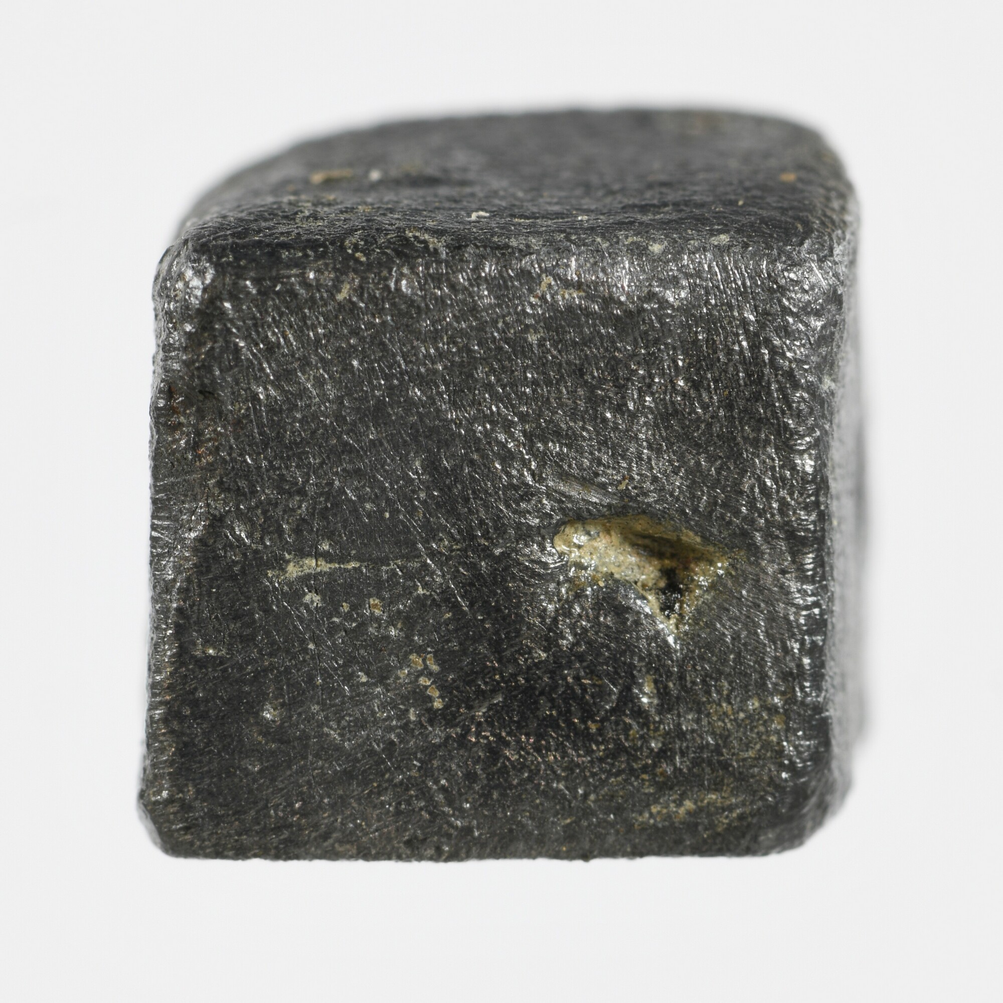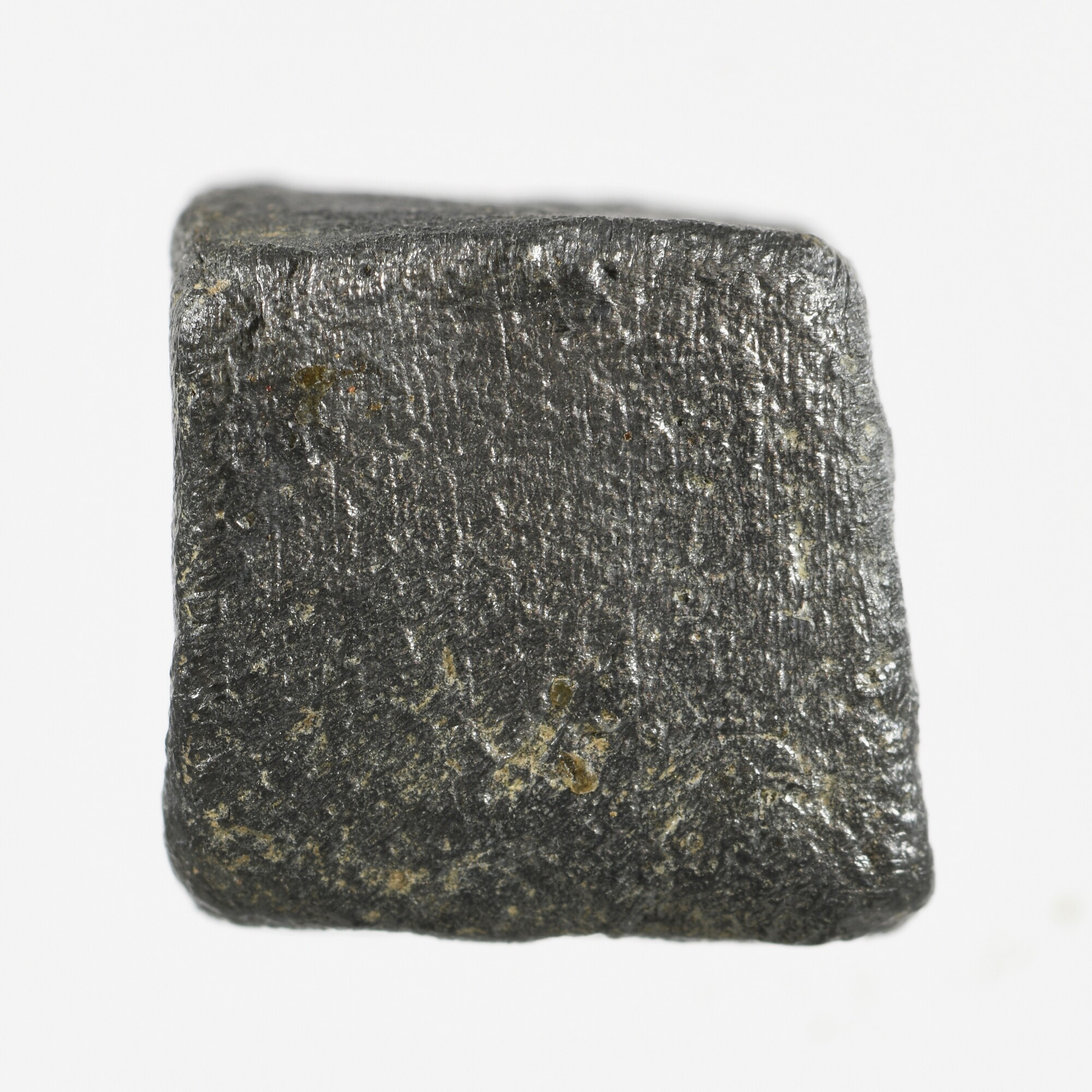 Dobbelsteen; vierkant onevige dobbelsteen; enkel de zijden met vijf en zes zijn duideljik zichtbaar; mogelijk zijn de een en twee ook aanwezig, maar dit kunnen ook oppervlaktebeschadigingen zijn; gewicht: 12.79 gram