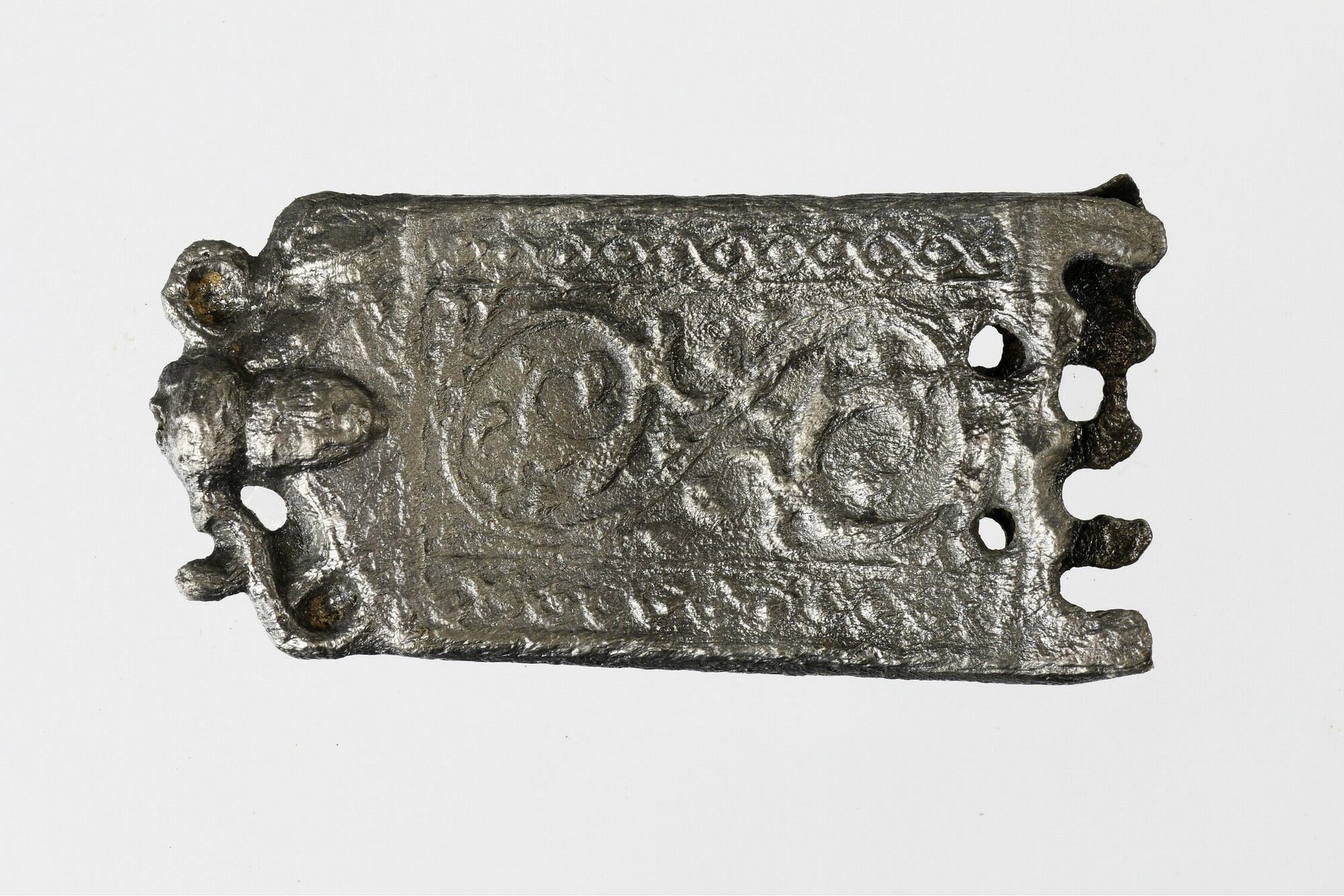 Riemtong; vz.: floraal versierde S; kz.: kruisje binnen versierd portret; uiteinde voorzien van inkepingen
